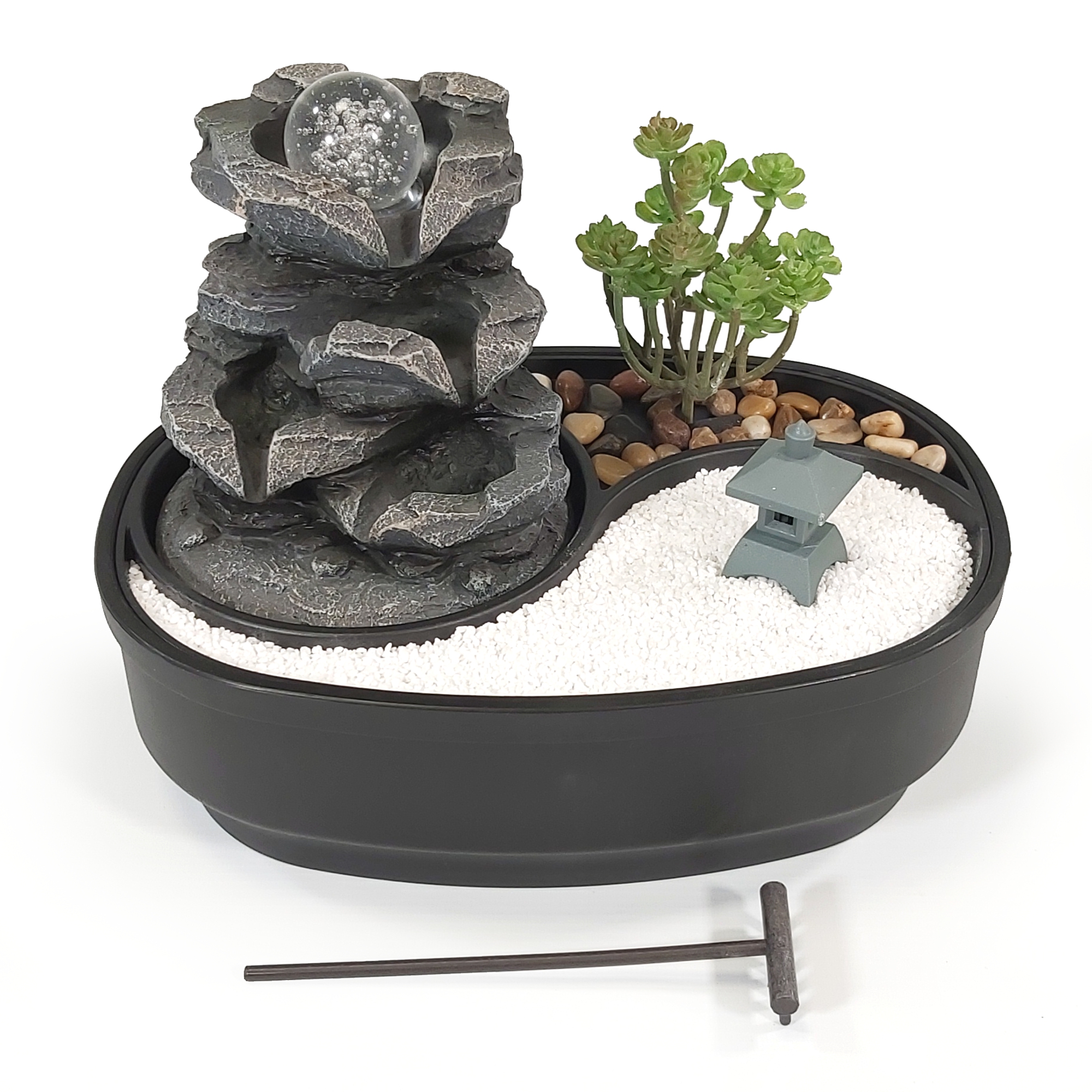 Unser Zimmerbrunnen mit kleinem ZEN Garten und beweglicher Glaskugel auf der Wasserquelle steht ganz im Zeichen Ostasiens.