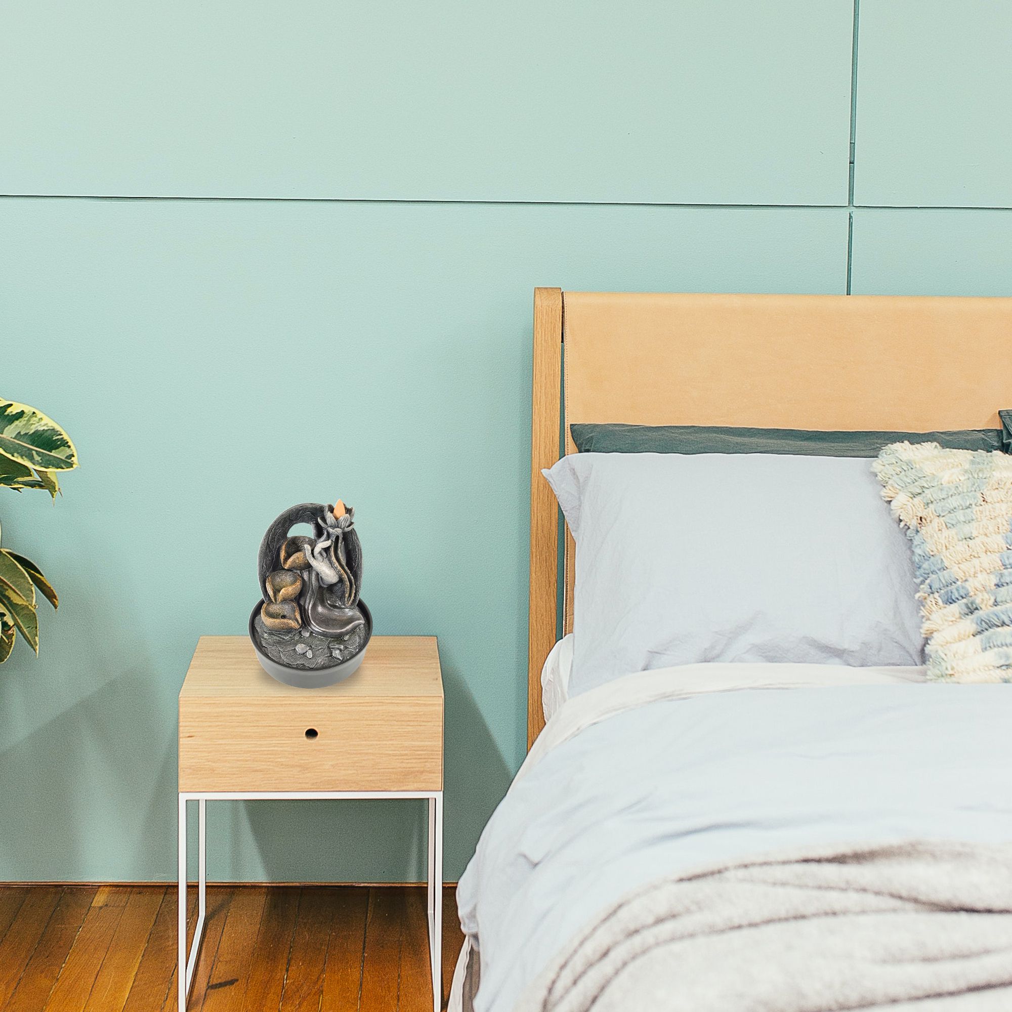 Der 2-in-1 Zimmerbrunnen verbindet die harmonische Ästhetik eines klassischen Wasserbrunnens mit der besonderen Funktion von einem Räucherbrunnen. Durch die Verwendung von Rückfluss Räucherkegeln entsteht ein einzigartiger visueller Effekt, bei dem der Nebel im Kontrast zum klaren Wasser steht. Dieses Zusammenspiel schafft nicht nur eine faszinierende Atmosphäre, sondern dient auch als effektives Mittel zur Stressreduktion. Der Tischbrunnen lädt dazu ein, sich in einem Rückzugsort der Ruhe zu entspannen, sei es im Büro oder Zuhause, und unterstützt dabei, innere Balance und Gelassenheit zu finden.