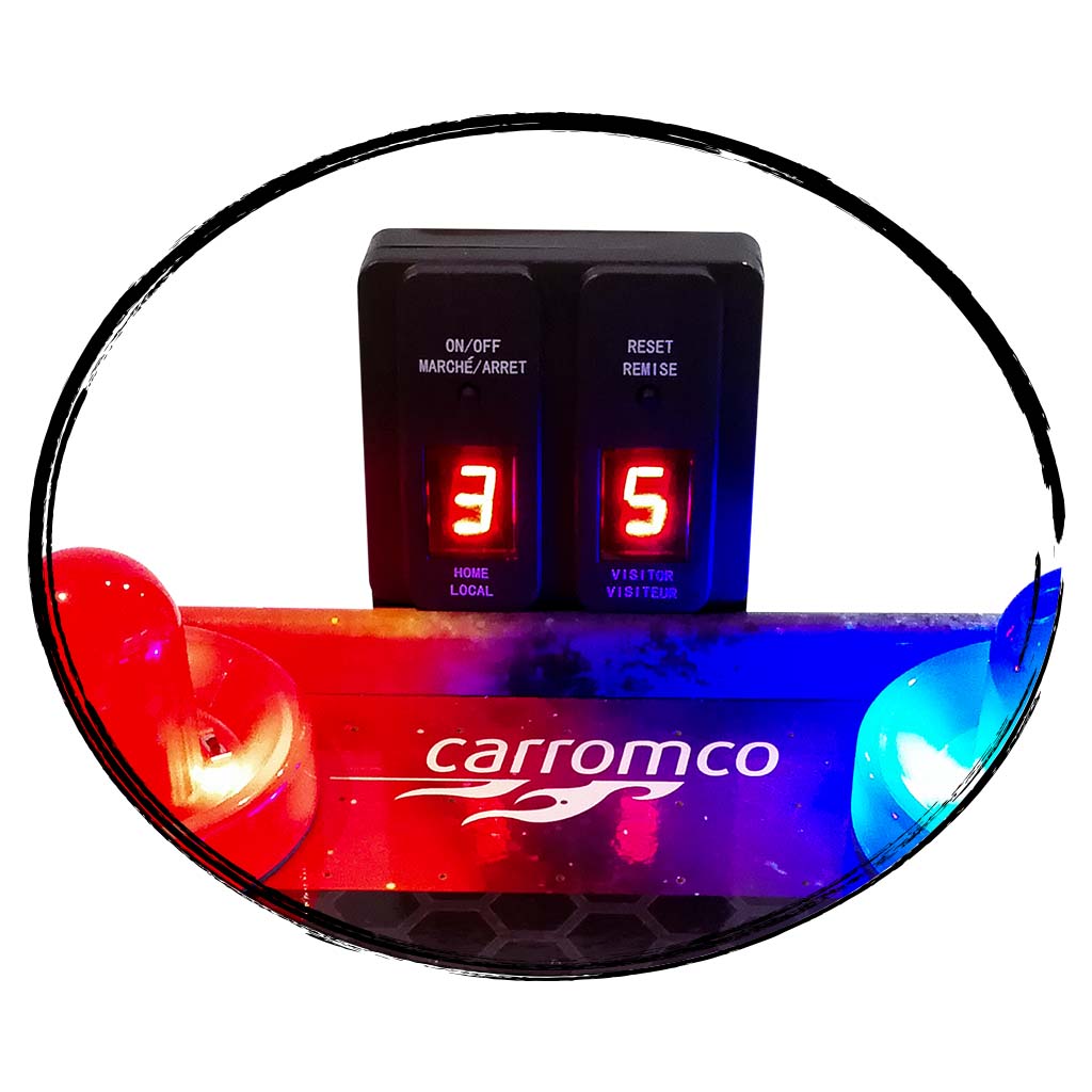 - Schwarze Kunststofftore mit integrierten Puckauffangschalen und manuellen Torzählern