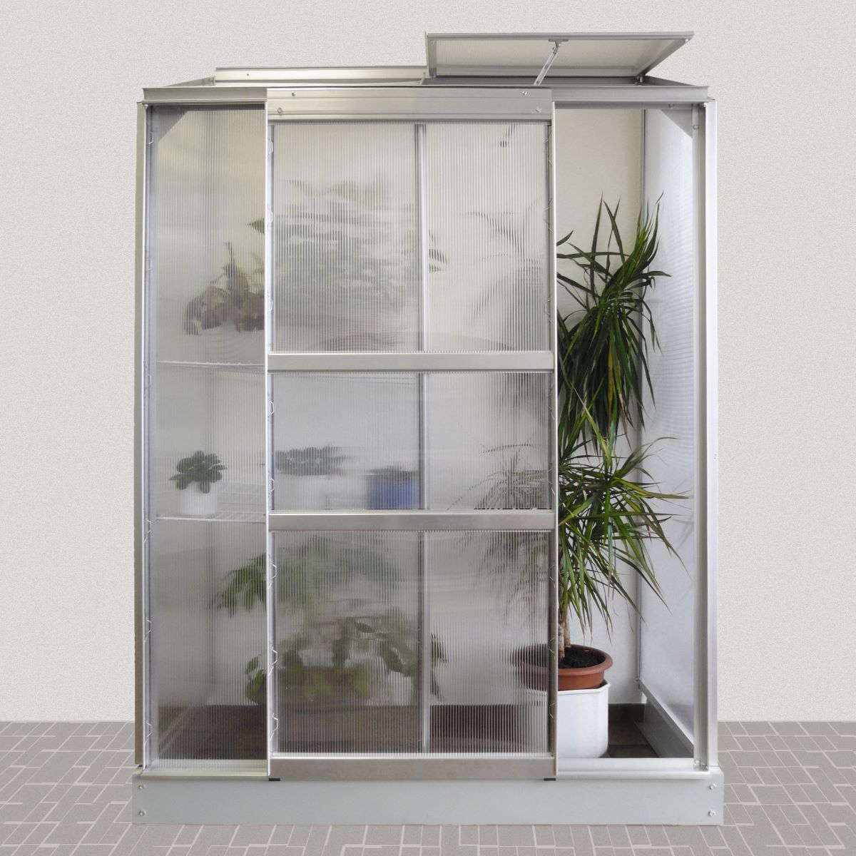 Das platzsparende Vitrinen-Gewächshaus POLIS für den Balkon – damit auch Stadtbewohner ohne eigenen Garten Pflanzen und Kräuter anbauen können! Mit diesem exklusiven Balkongewächshaus können Sie mit geringstem Platzbedarf Pflanzen kultivieren und gleichzeitig von der modernen Optik einer edlen Glasvitrine profitieren. Das Gewächshaus besteht aus hochwertigen Aluminiumprofilen, die wahlweise in der Ausführung eloxiert oder schwarz pulverbeschichtet erhältlich sind, und aus kristallklarem Sicherheitsglas mit polierten Kanten und eingeschliffenen Griffen. Letztere erlauben das bequeme Bedienen der oberen und unteren Glas-Schiebetüren, die getrennt voneinander geöffnet werden können. Dank seiner kompakten Grundfläche von knapp 0,35 m² findet der Pflanzschrank auch auf kleineren Balkonen oder Terrassen Platz. Im Inneren des Balkongewächshauses bietet der Zwischenboden genügend Stellfläche für Ihre Pflanzen. Der Clou: für höher wachsende Pflanzen kann durch das Entnehmen einzelner Streben des Zwischenbodens entsprechend „Luft nach oben“ geschaffen werden. Apropos Luft – das aufstellbare Dachfenster sorgt für eine optimale Belüftung des Pflanzenschranks. Als Fundament haben Sie die Wahl zwischen einem stabilen Stahlrahmen oder einem praktischen Fundamentrahmen mit vier Rollen, wobei das Rollfundament ein bequemes „Versetzen“ des Glasgewächshauses ermöglicht. Produktdetails: Material: Aluminiumprofile (eloxiert oder pulverbeschichtet)Sicherheitsglas: kristallklar, ca. 3 mm stark (ESG) Produktinformationen: Balkongewächshaus im Stil einer modernen Glasvitrine Hochwertig eloxiertes oder pulverbeschichtetes Aluminium (für dauerhaften Schutz vor Korrosion und eine lange Lebensdauer) Verglasung mit 3 mm starkem ESG-Sicherheitsglas Ausreichend Stellfläche für Pflanzen bei sehr kompaktem Sockelmaß Zwischenboden zur Unterteilung in oberes Fach (Höhe ca. 100 cm) und unteres Fach (Höhe ca. 40 cm) Geteilte Glas-Schiebetüren zur getrennten Bedienung beider Fächer Streben des Zwischenbodens separat entnehmbar (für hochwachsende Pflanzen) Aufstellbares Dach für optimale Belüftung Fundament als fester Stahlrahmen oder mit vier Lenkrollen erhältlich Lieferumfang: Balkon-Gewächshaus POLIS