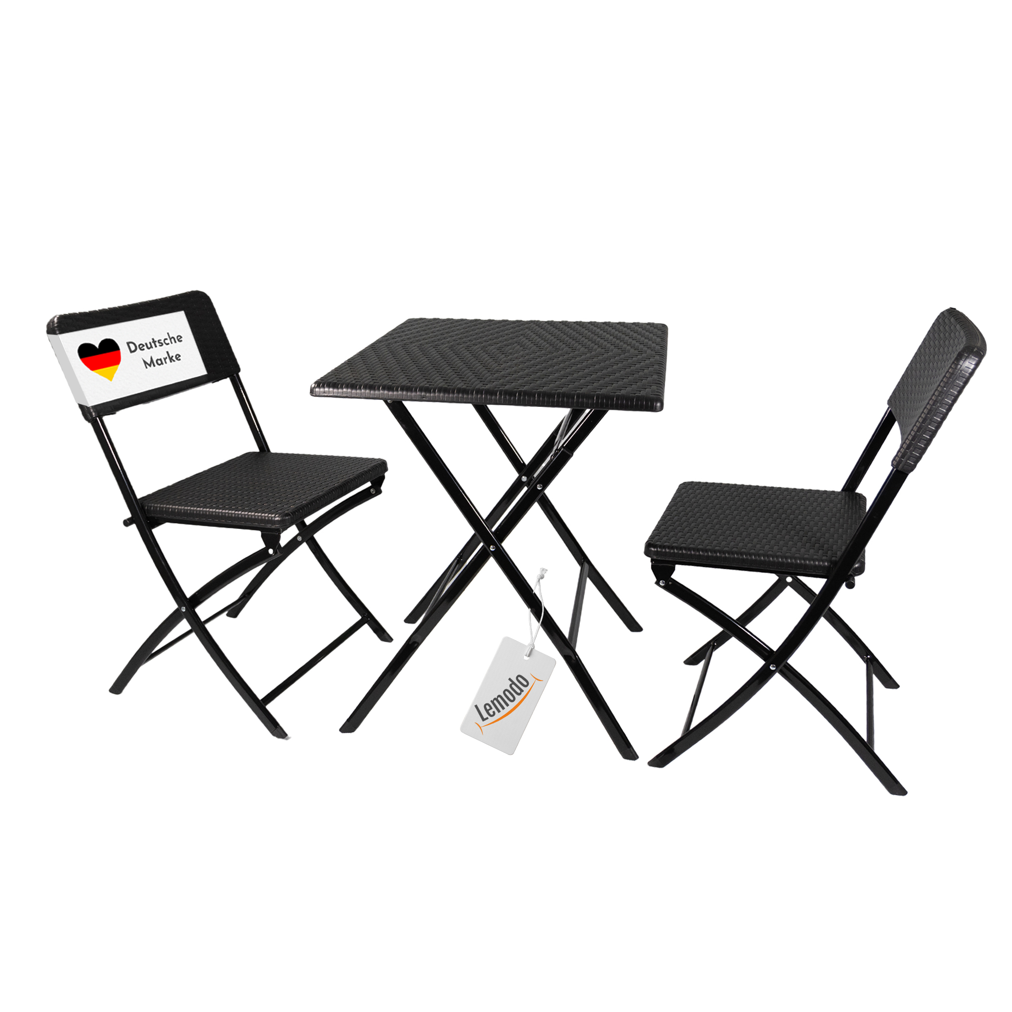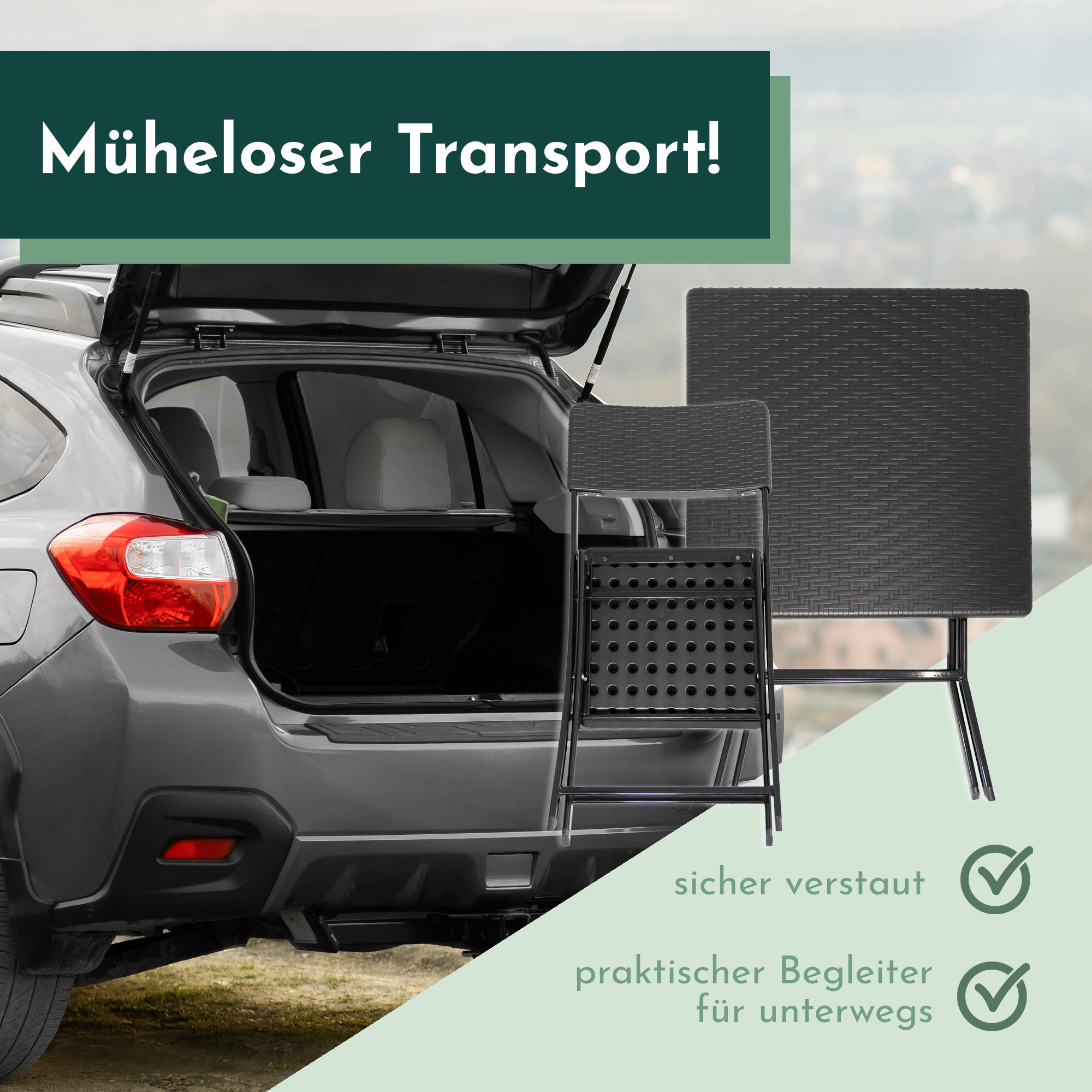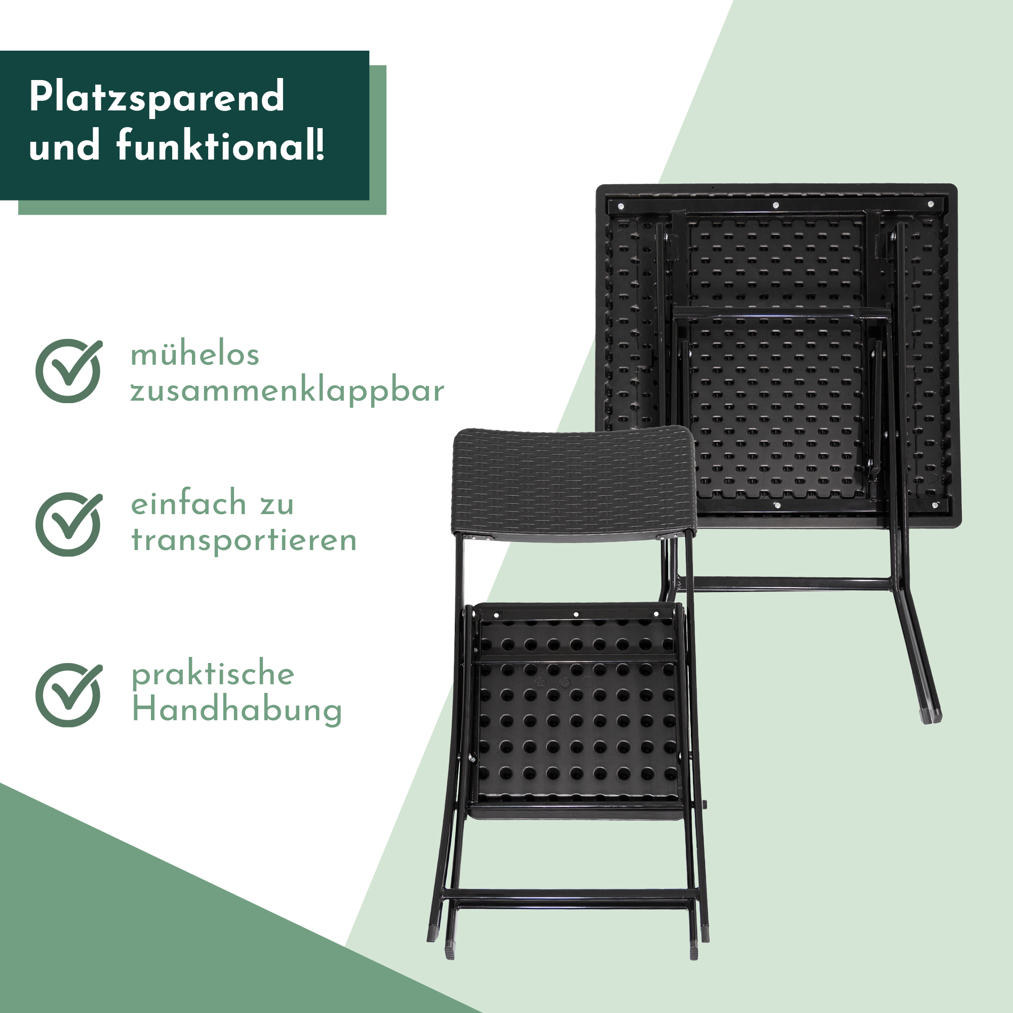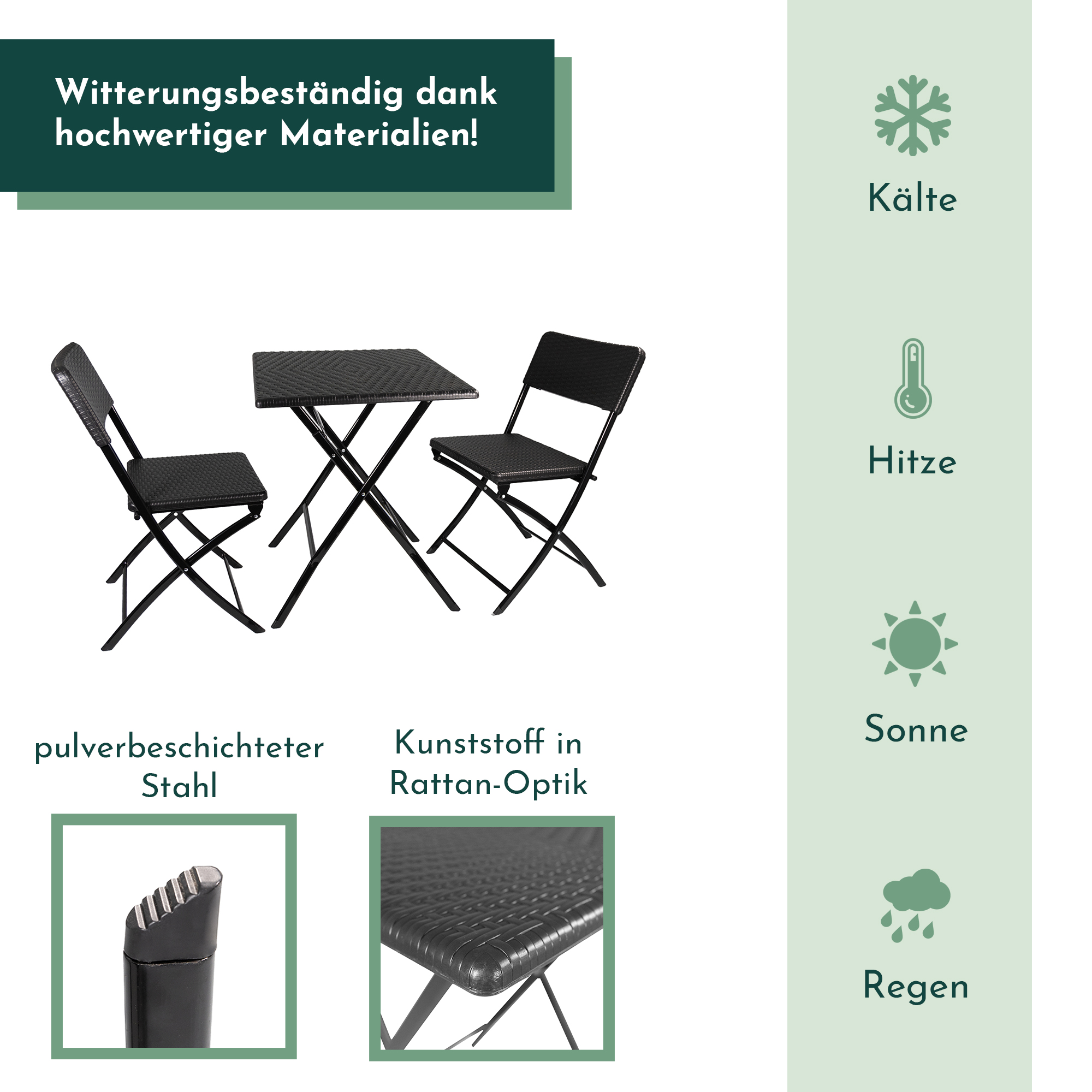 Die Sitzgruppe ist schnell aufgeklappt und lädt zumVerweilen ein. Hergestellt aus wetterfestem Kunststoff mit Rattan-Optik und einem stabilen Stahlrohrgestell in schwarz.