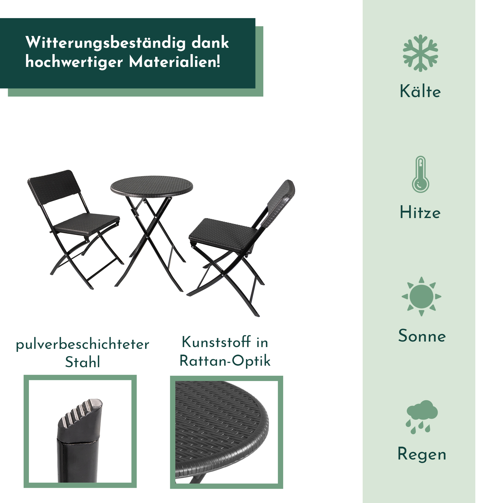 - PFLEGELEICHT: Die Reinigung unseres Bistrosets gestaltet sich äußerst simpel - normalerweise genügt ein feuchtes Tuch, um die Oberflächen mühelos zu säubern. So bleibt das Gartenmöbel Set ein Ort der Entspannung und der mühelosen Eleganz