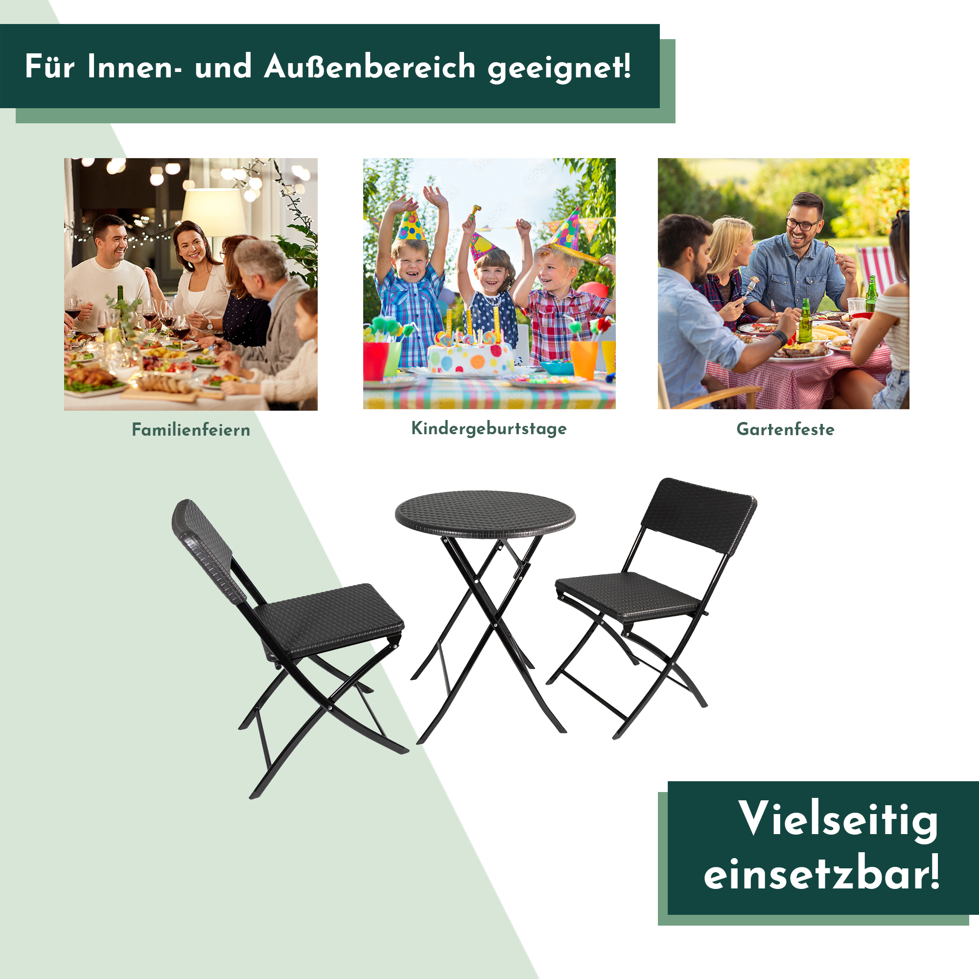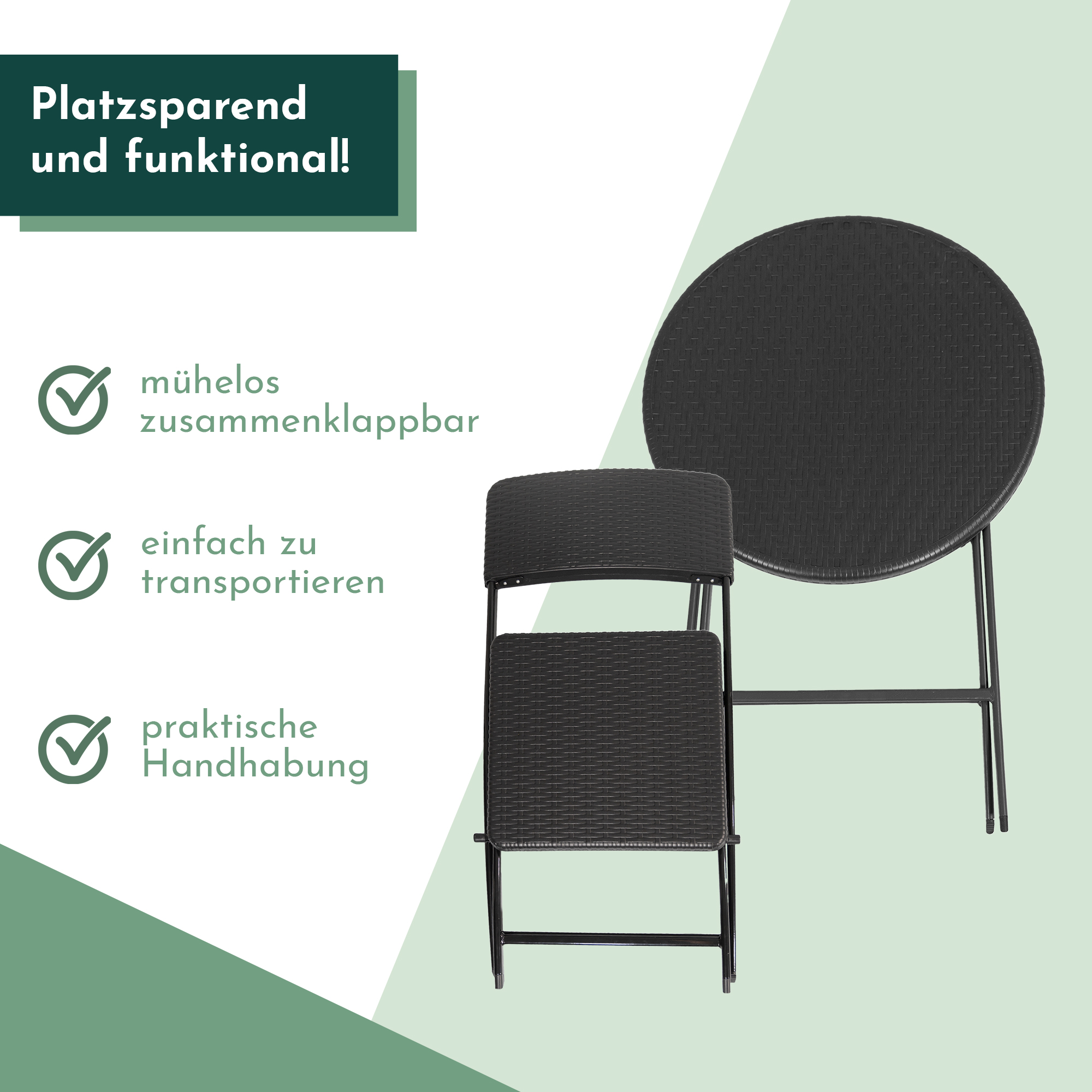- KLAPPBAR UND TRANSPORTABEL: Das Klappdesign des Balkon Sets ermöglicht eine unkomplizierte Verstauung und mühelosen Transport. Gönne Dir maximale Flexibilität, mit unserem Balkonset - einfach transportieren und aufbauen, wo Du die Essgruppe benötigst