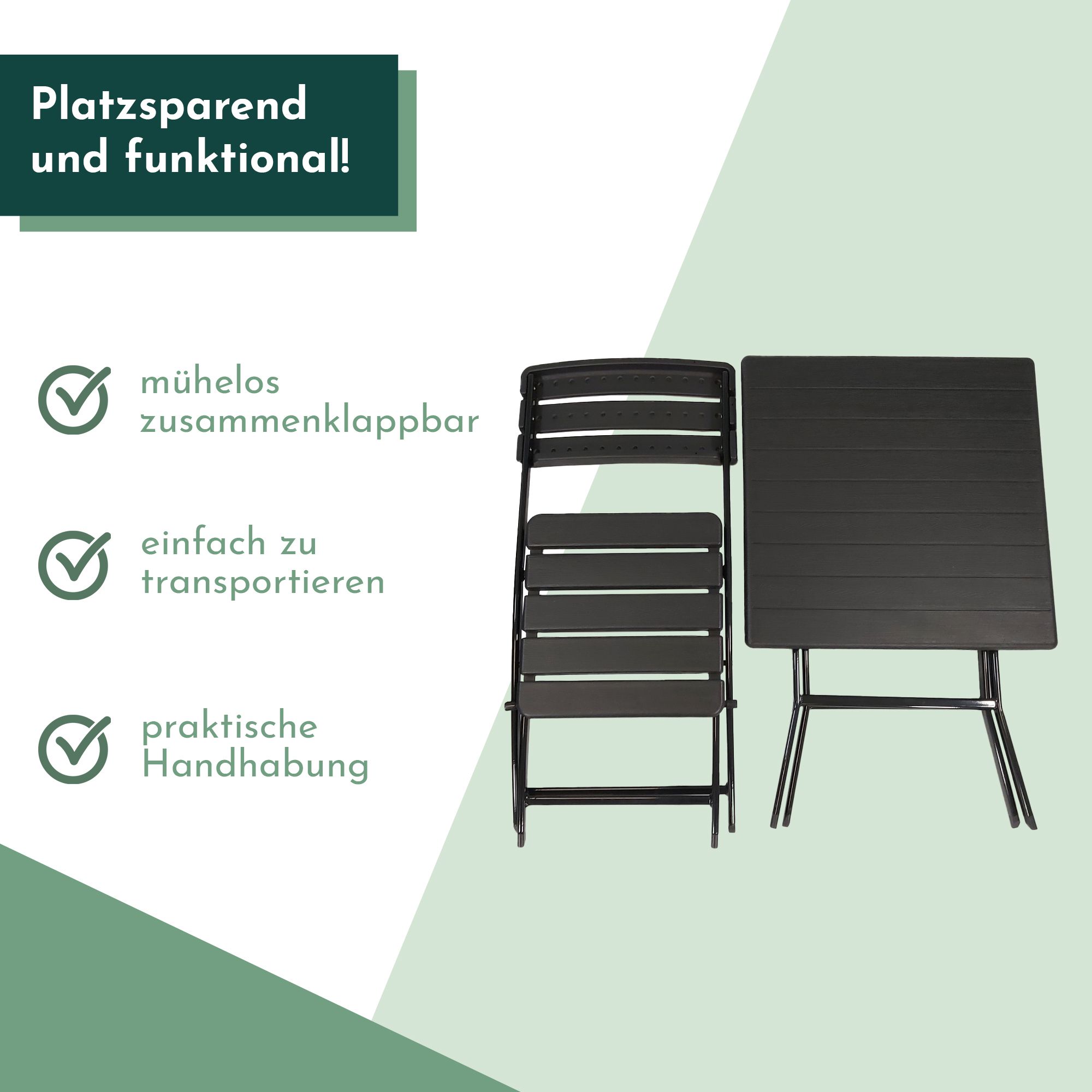 Unsere Balkongarnitur zeichnet sich durch ein cleveres Klappdesign aus, das nicht nur die einfache Aufbewahrung, sondern auch einen mühelosen Transport ermöglicht. Erlebe ein Höchstmaß an Anpassungsfähigkeit mit unserem praktischen Bistroset – spielend leicht zu transportieren und an jedem gewünschten Ort aufzubauen, ganz nach Bedarf für Deine kulinarischen Genüsse, auch im Freien.