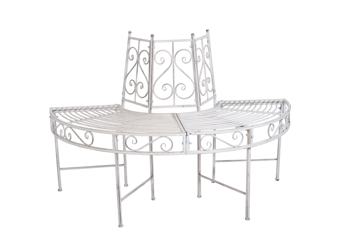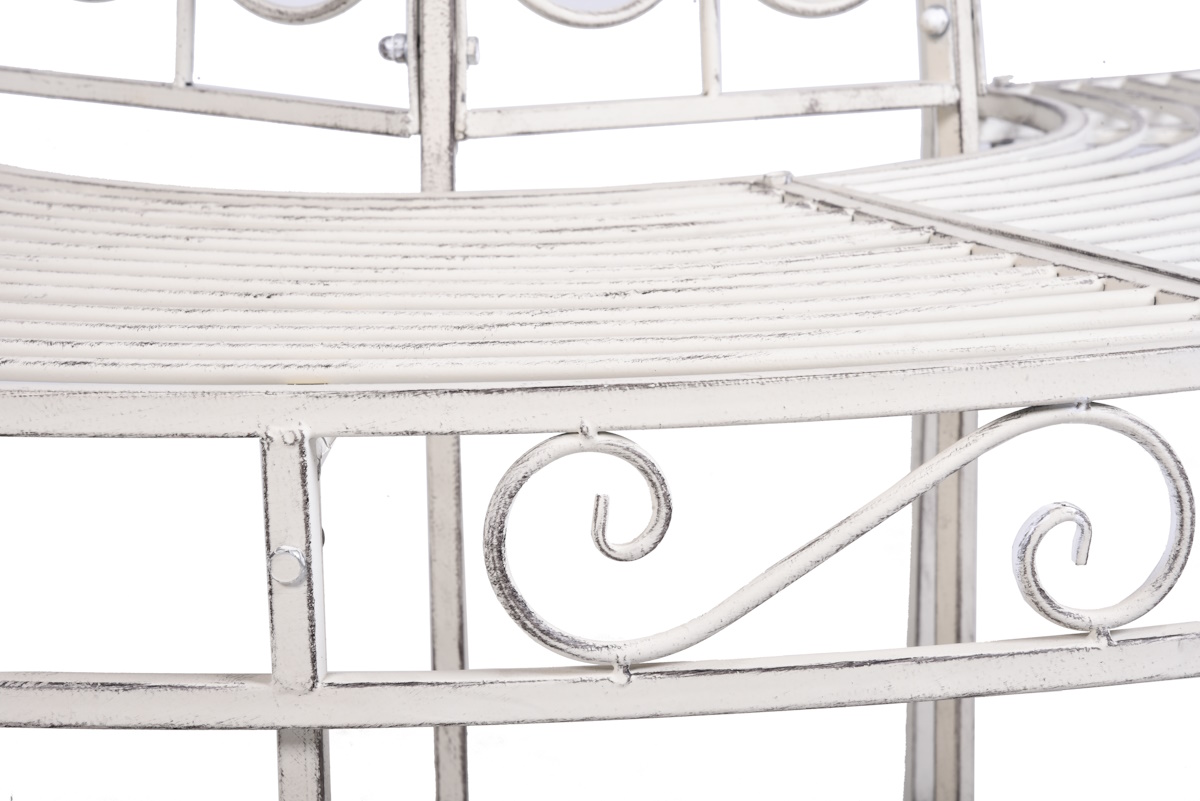 Unsere Halbkreis-Baumbank VARDA bietet Platz für bis zu 3 Personen. Die als Halbkreis aus pulverbeschichtetem Metall gefertigte Bank besticht durch ihre schlichte Eleganz. Sie verleiht jedem Garten einen gewissen Charme, lädt zum Verweilen unter Bäumen ein und lässt den Sommer ein ganzes Stück entspannter erscheinen. Die antik weiße Oberflächenoptik steht in einem perfekten Kontrast zum sommerlichen grün.Produktdetails: