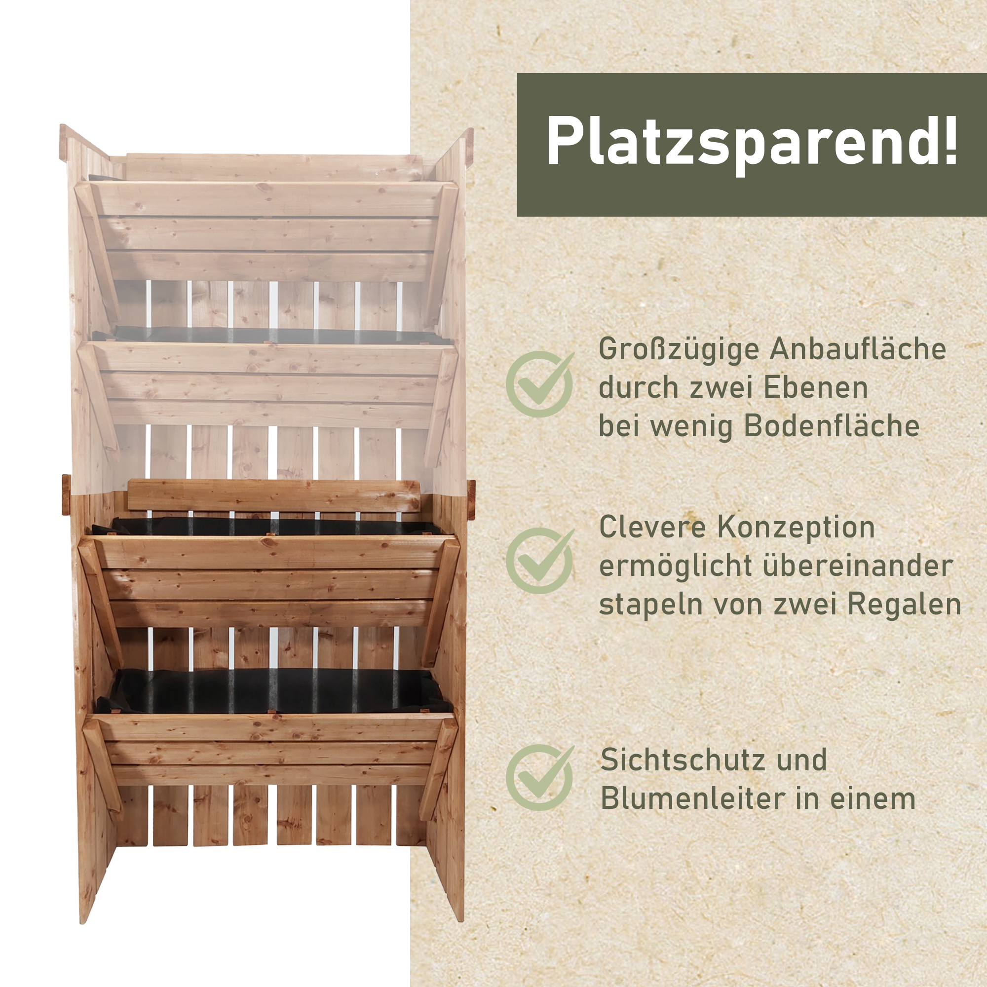 Unser Kräuterregal ist die perfekte Lösung für all jene, die gerne platzsparend gärtnern möchten, ohne dabei Kompromisse bei der Pflanzvielfalt einzugehen. Mit seinen zwei Ebenen bietet es eine beeindruckende Fläche für Deine grünen Schätze, während es gleichzeitig nur wenig Bodenfläche beansprucht. Die clevere Konzeption unserer Blumenleiter ermöglicht es Dir sogar, zwei Pflanzregale übereinander zu stapeln, wodurch Du nicht nur Platz sparst, sondern auch einen effektiven Sichtschutz und einen imposanten Blumenkasten in einem erhältst. Tauche ein in die Welt des vertikalen Gärtnerns und lasse Dich von der Vielseitigkeit und Effizienz unseres innovativen Hochbeets begeistern, das Dir maximales Gartenvergnügen auf minimalem Raum bietet.