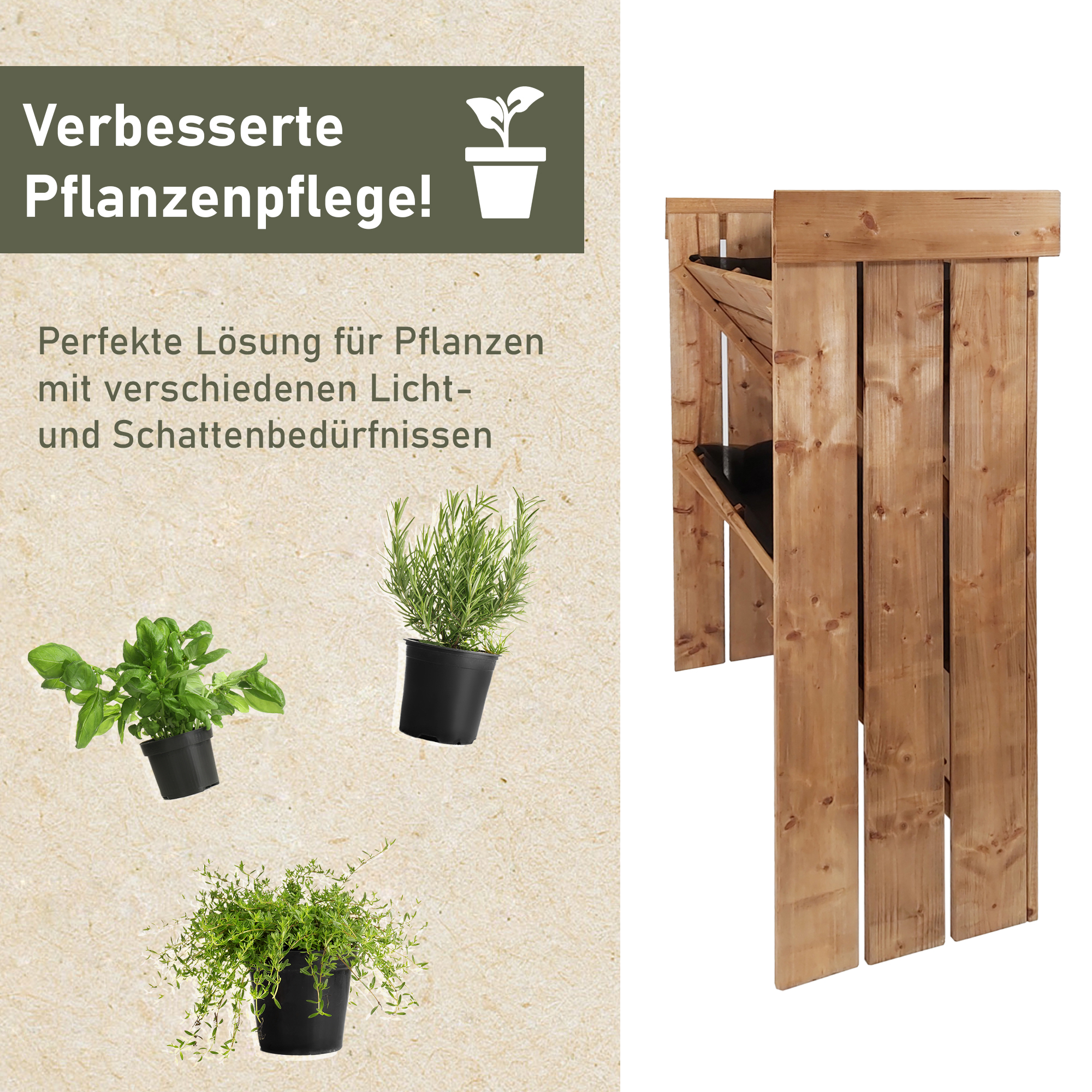 Unser Vertikalbeet eröffnet eine Fülle von Möglichkeiten für die Gestaltung und Nutzung Deiner grünen Oase. Mit seiner Vielseitigkeit ist es mehr als nur ein einfaches vertikales Hochbeet. Es ist ein wahres Multitalent in Deinem Garten. Verwende es als eleganten Blumenständer, um Deine Lieblingsblüten in voller Pracht zu präsentieren, oder als Pflanzturm, um vertikal Platz zu sparen und gleichzeitig Deinen grünen Daumen zu entfalten.
