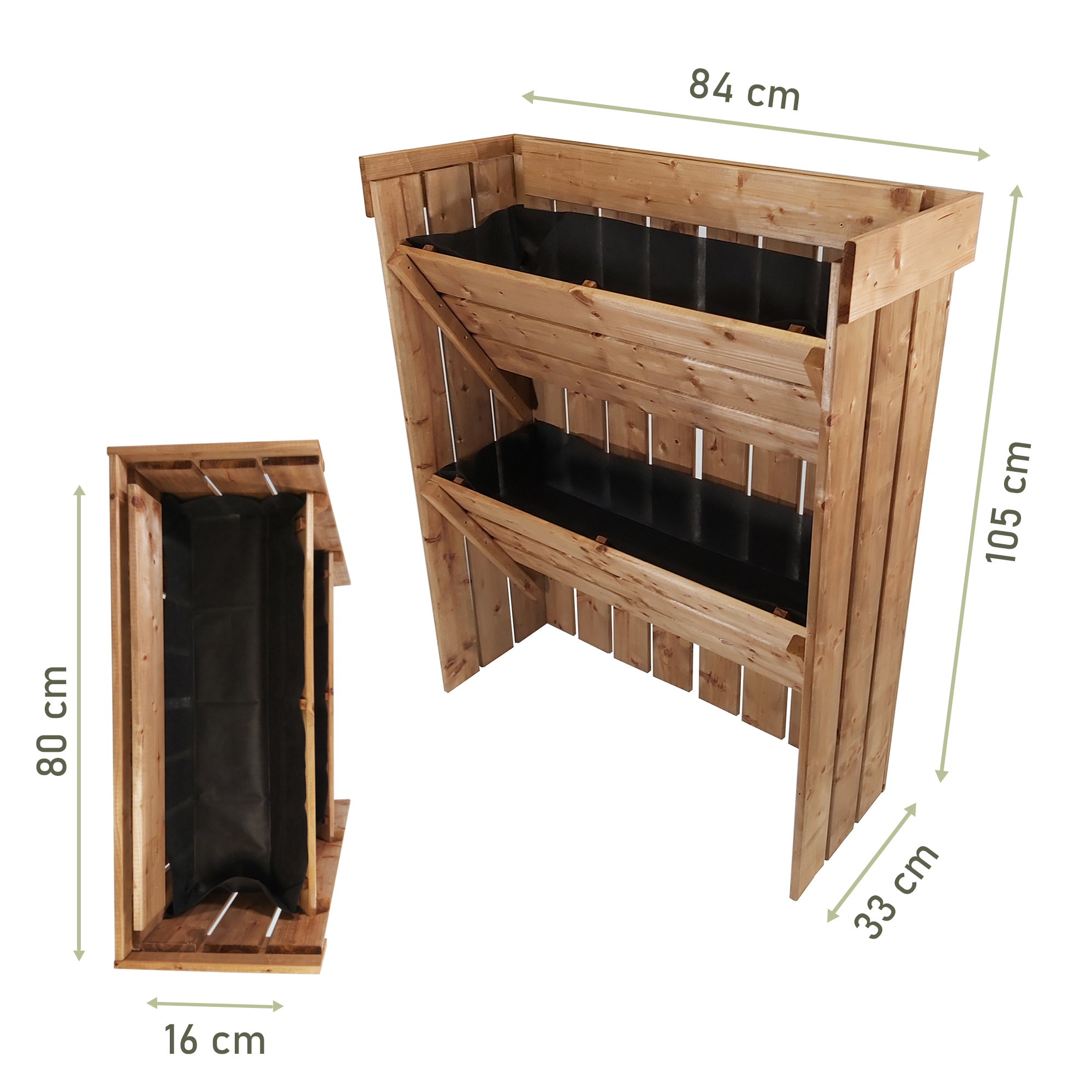 Die Robustheit und Stabilität unseres Produkts wird durch hochwertiges Kiefern- und Fichtenholz gewährleistet, das mit einer Dicke von 1,5 cm eine solide Basis bildet. Durch die Verwendung langer Schrauben für die Verschraubung der Holzelemente wird zusätzliche Stabilität erreicht, was sicherstellt, dass Deine Pflanzen sicher und geschützt platziert sind.
