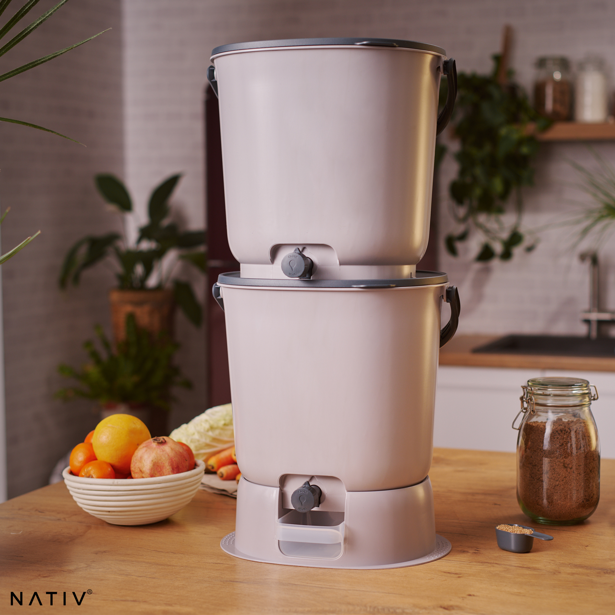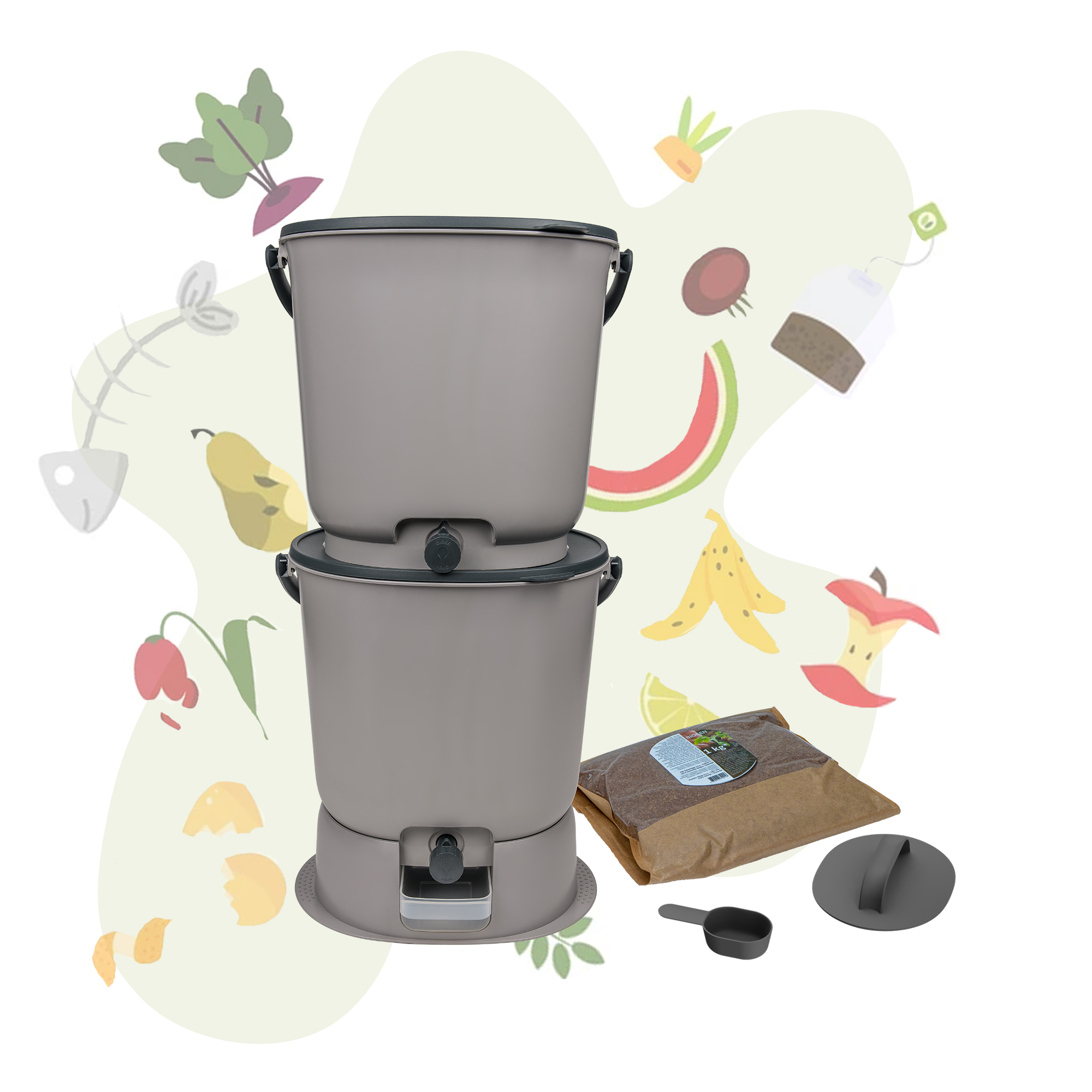 Bokashi Starter Set mit 2 Bokashi Eimer, hellgrau, Bokashi Ferment, Dosierhilfe und Stampfer