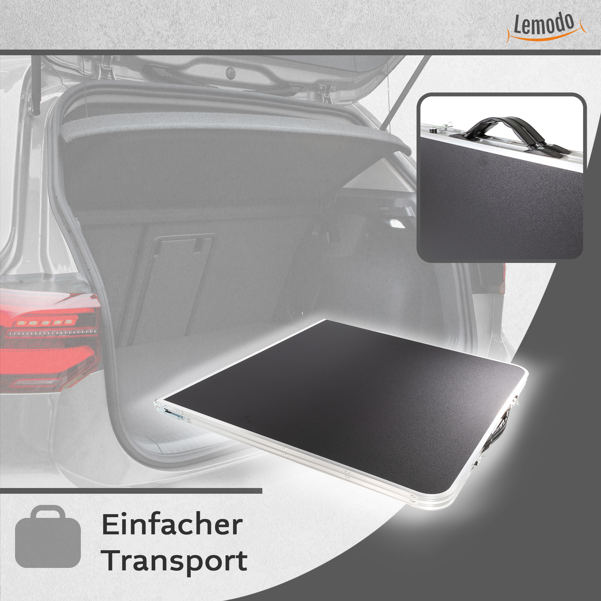 Wenn der Klapptisch zusammengeklappt ist, hat er ein kleines Packmaß von gerade einmal 62 × 61,5 × 7 cm. So kompakt zusammengelegt findet der Tisch nahezu in jedem Kofferraum Platz. Zusammen mit dem geringen Gewicht von 4,2 Kilogramm ist der Koffertisch problemlos zu transportieren. Die integrierte Trageschlaufe hilft zusätzlich bei einem einfachen Transport.