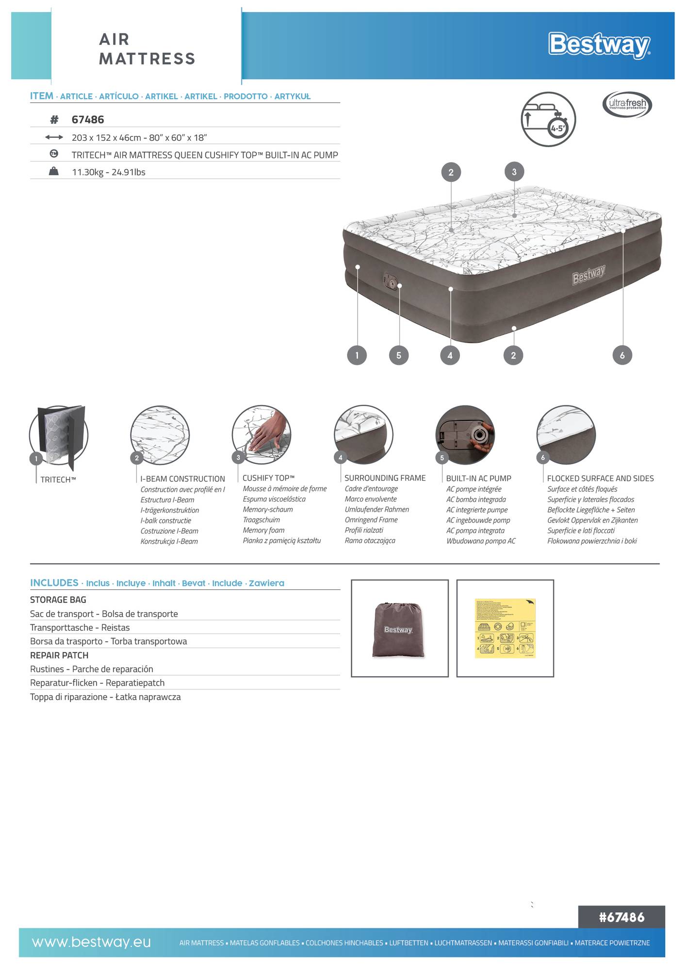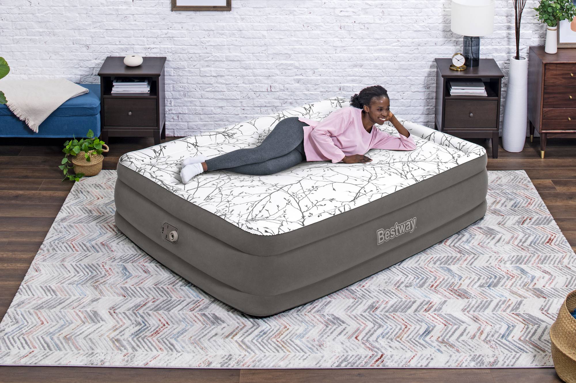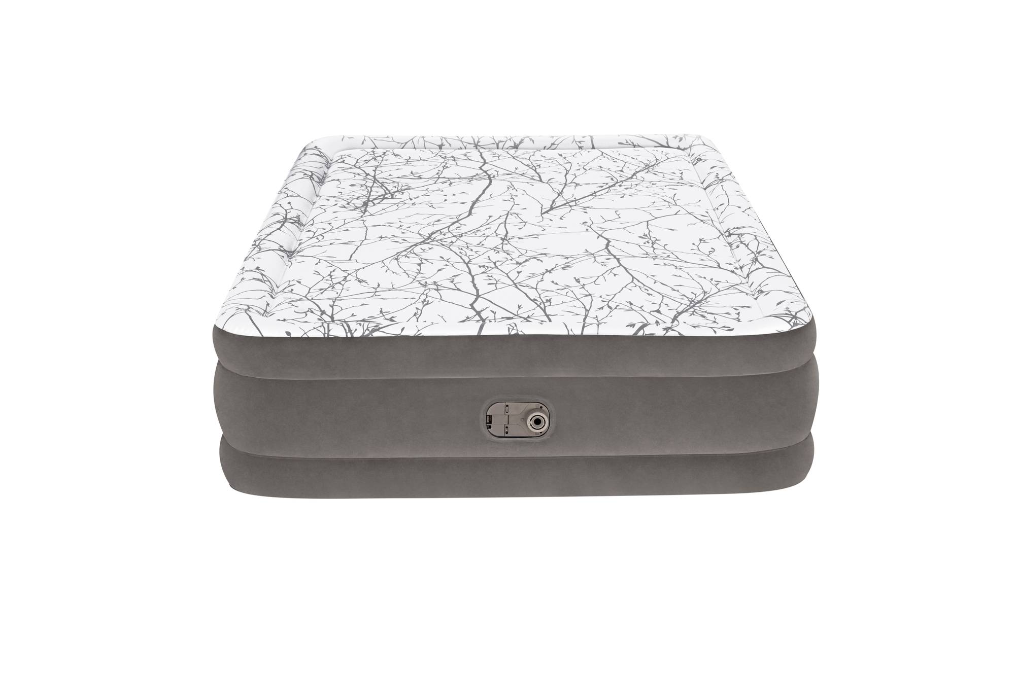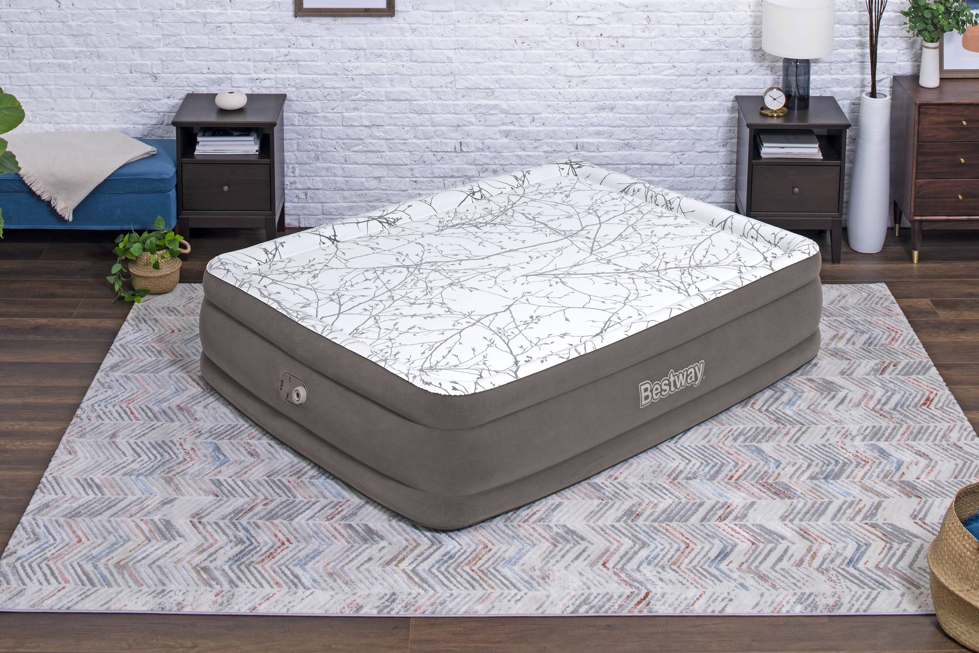 Wachen Sie wunderbar erholt auf dem Bestway TriTech Cushify Top Luftbett auf! Dieses Luftbett verspricht Stärke, Langlebigkeit und Komfort die ganze Nacht lang. Dank ihrer kompakten Größe und der integrierten Elektropumpe ist das Luftbett schnell und direkt einsatzbereit. Dank der antimikrobiellen Ultra-Fresh-Oberfläche schützt Ihr Luftbett vor dem Wachstum von geruchsverursachenden Bakterien, Schimmel und Mehltau auf der Liegefläche geschützt. Langlebige Konstruktion: Die komfortable Liegefläche und die robuste Konstruktion bieten alle Voraussetzungen für einen erholsamen Schlaf. Das Luftbett besteht aus 3-lagigem TriTech-Material, welches Langlebigkeit und Festigkeit bietet und gleichzeitig dafür sorgt, dass das Bett trotz mehrmaligem Auf- und Abpumpen seine Formfestigkeit behält. Außerdem wird der Luftverlust während der Nacht minimiert. Das TriTech-Material erhöht den internen Dehnungswiderstand und bietet eine formschöne Schlaflösung. Dieses langlebige, belastungsgeprüfte Material hält all dem Gewicht und den Bewegungen stand, die mit einem erholsamen Schlaf einhergehen. Luxuriöse Oberfläche: Die Cushify Top-Liegefläche aus Schaumstoff Komfort pur. Das weiche komfortable Material fühlt sich an wie Plüsch und sorgt für eine angenehme Nachtruhe. Elegantes, trendiges Muster: Das Luftbett ist vollständig mit dem trendigen Fashion Flock-Design ausgestattet. Das komfortable Material mit elegantem Aufdruck, verleiht dem Luftbett ein hochwertiges Erscheinungsbild. Es fügt sich nahtlos in jedes Gäste- oder Wohnzimmer sowie überall dort ein, wo ein zusätzlicher Schlafplatz benötigt wird. Einfacher Aufbau: Die integrierte Elektropumpe pumpt das Luftbett in 240-300 Sekunden auf, sodass es direkt einsatzbereit ist. Am nächsten Morgen kann mithilfe dieser das Luftbett mühelos wieder entleert werden. Legen Sie das zusammengeklappte Bett einfach in die mitgelieferte Aufbewahrungstasche, um es bequem zu transportieren und zu lagern.