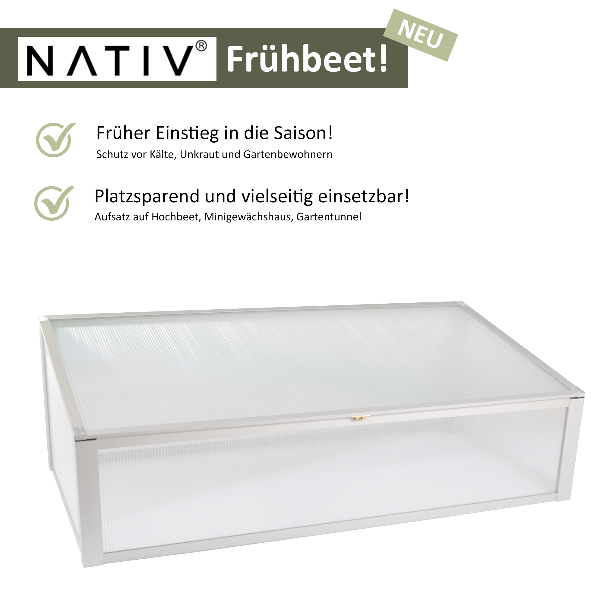 - EXKLUSIV: Der Frühbeetkasten ist ausschließlich für NATIV hergestellt. Er passt ideal als Frühbeetaufsatz auf unsere exklusiven Hochbeet-Modelle Triest und Siena. Macht aber auch als reines Frühbeet eine gute Figur