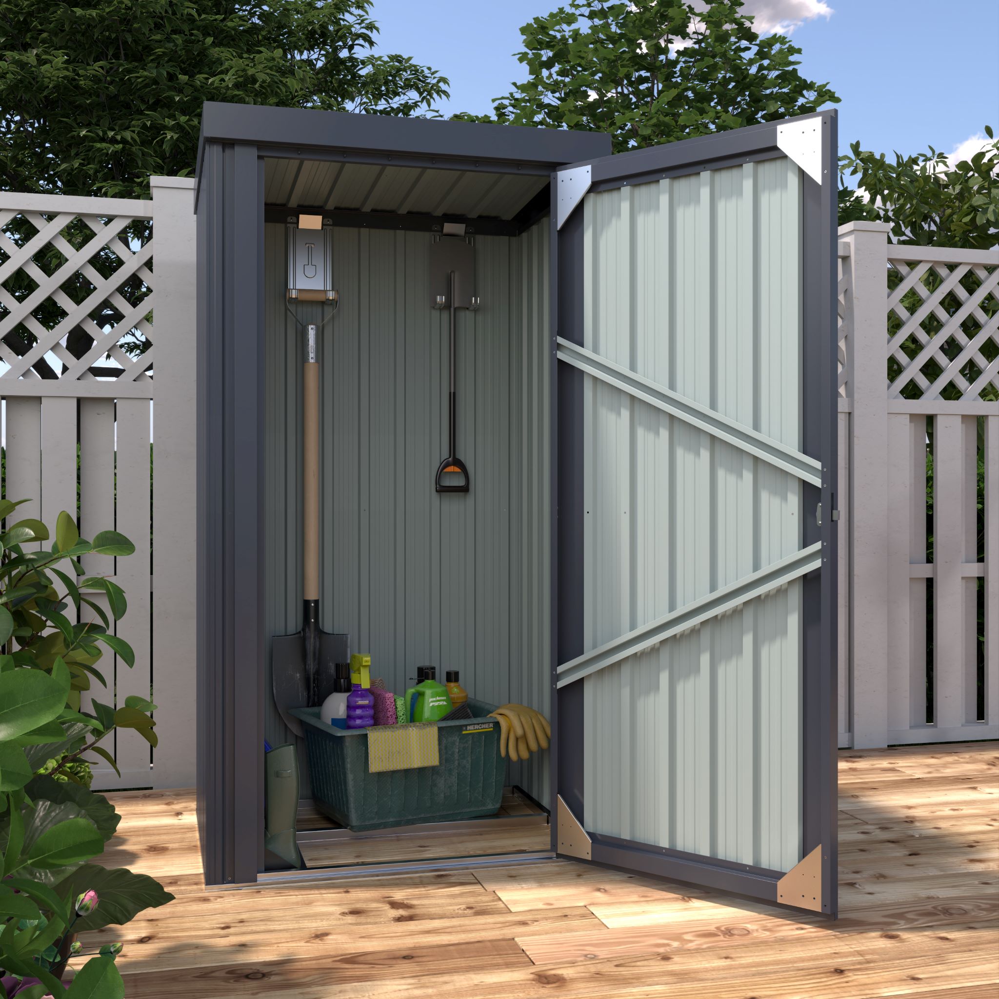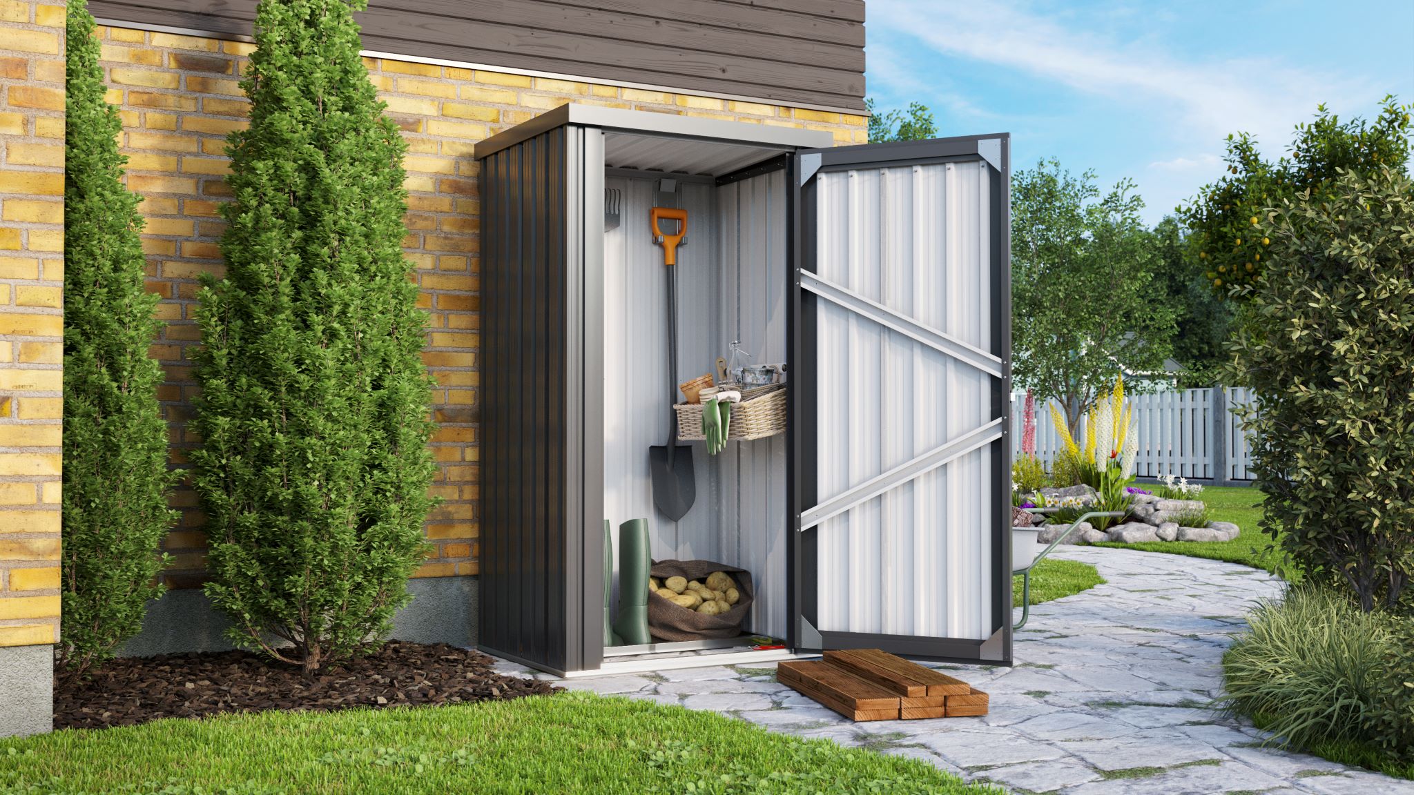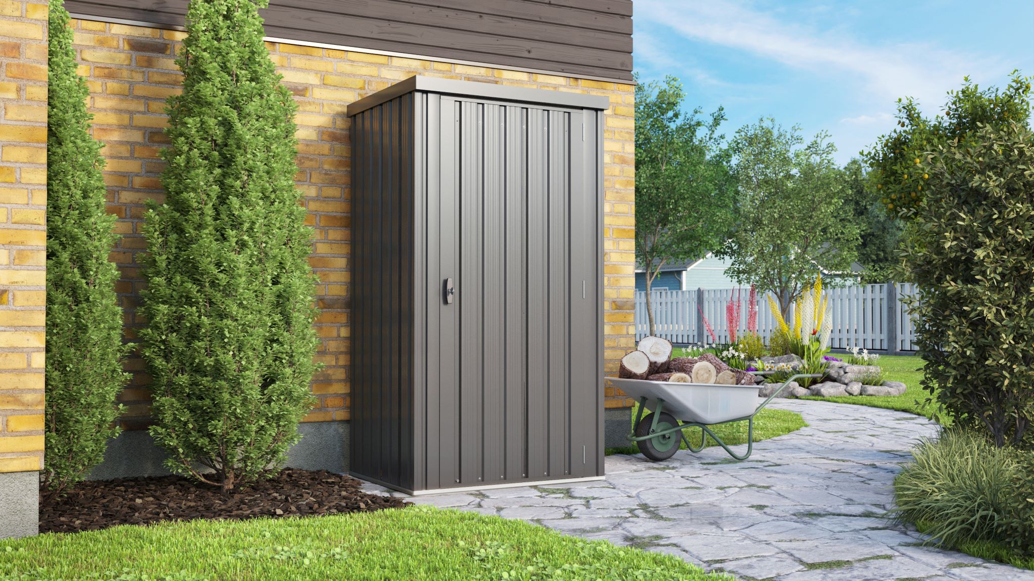 Mit einer kompakten Grundfläche von nur 0,75 m² findet dieser kleine Geräteschrank selbst auf einer Terrasse oder im Vorgarten problemlos Platz. Im Lieferumfang enthalten sind ein Zylinderschloss, ein Bodenrahmen, zwei Werkzeughaken sowie ein vierteiliges Verankerungskit zur sicheren Befestigung am Untergrund. Die integrierte Schwingtür ermöglicht eine platzsparende Nutzung des Innenraums. Die moderne Farbgebung in anthrazit fügt sich harmonisch in nahezu jedes Umfeld ein. Der Metallgeräteschrank wird als Bausatz und ohne Boden geliefert.
