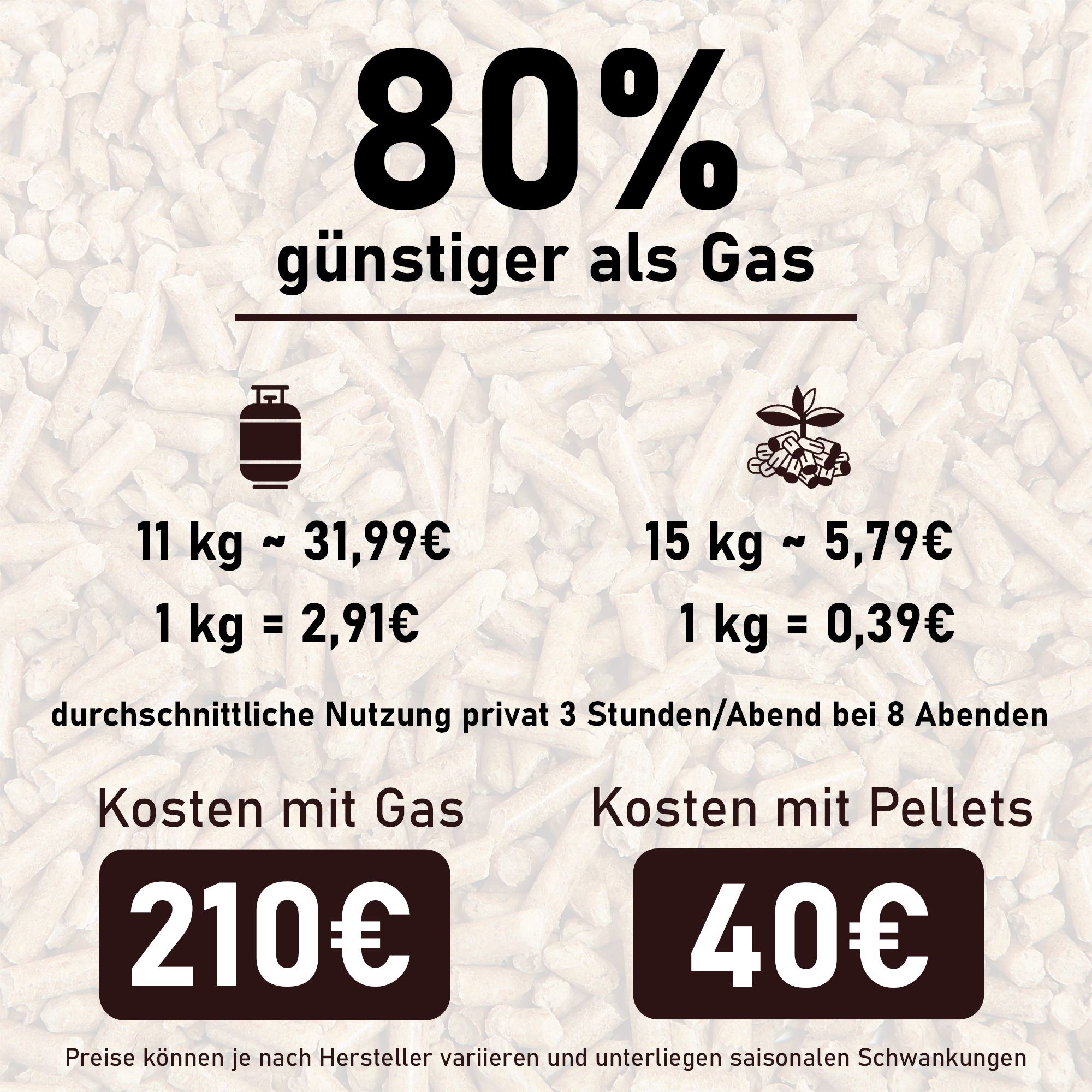 - KOSTENERSPARNIS: Holzpellets stellen eine erheblich kostengünstigere Alternative im Vergleich zu Gas dar. Bei der Verwendung eines Gasheizstrahlers können die Kosten bis zu 5x höher sein als bei unserem Pellet Terrassenstrahler