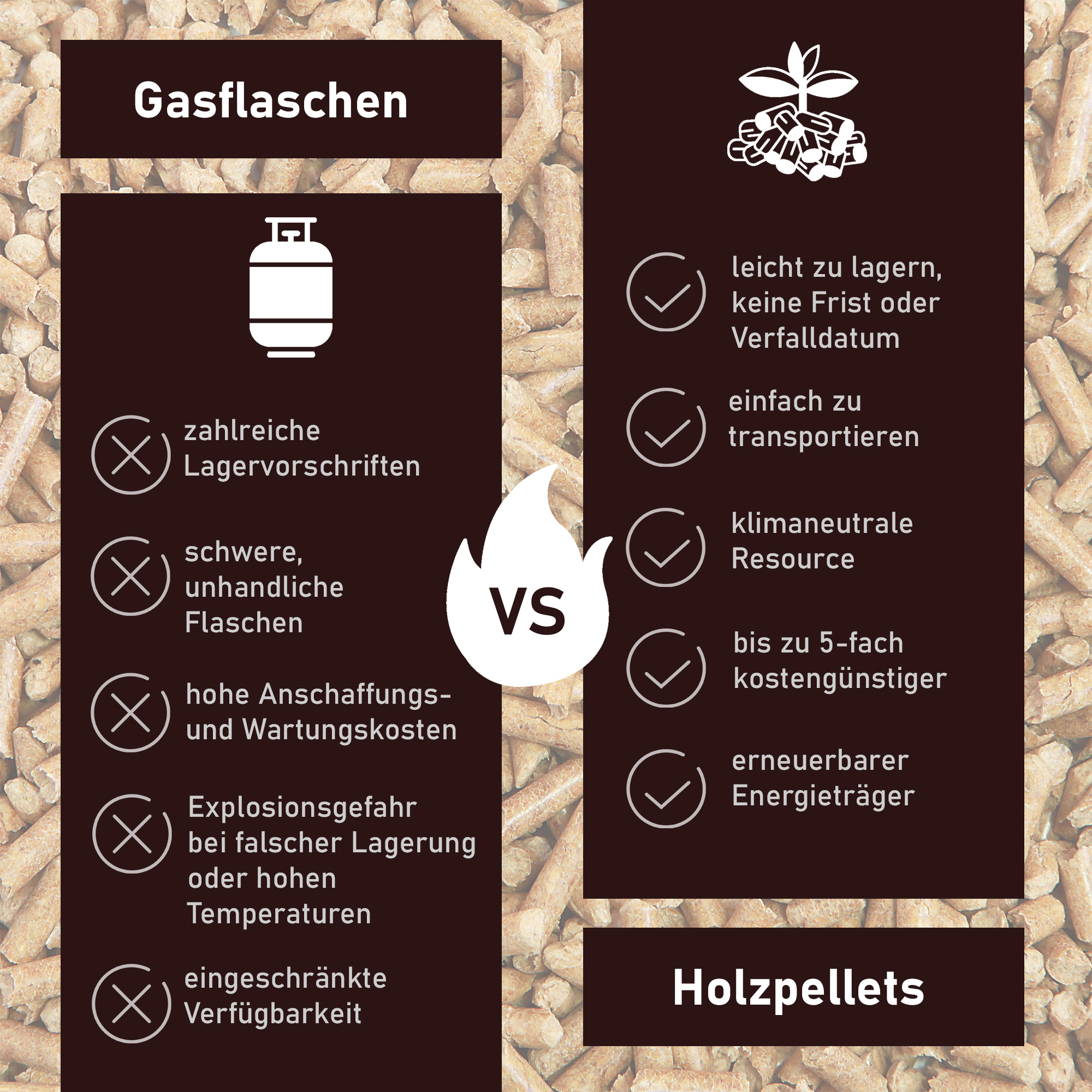 Im Vergleich zu Gasflaschen sind Pellets wesentlich leichter und sicherer zu lagern. Holzpellets zeichnen sich durch ihr geringes Gewicht und ihre unkomplizierten Lagerbedingungen aus, die sie zu einer praktischen und sicheren Option im Vergleich zu sperrigen Gasflaschen machen. Darüber hinaus kannst Du Holzpellets ganz bequem online bestellen und sie direkt zu Dir nach Hause liefern lassen. So hast Du stets eine ausreichende Menge an Brennstoff zur Hand, ohne Dir Gedanken über aufwendige Transport- und Lagerungsprozesse machen zu müssen.