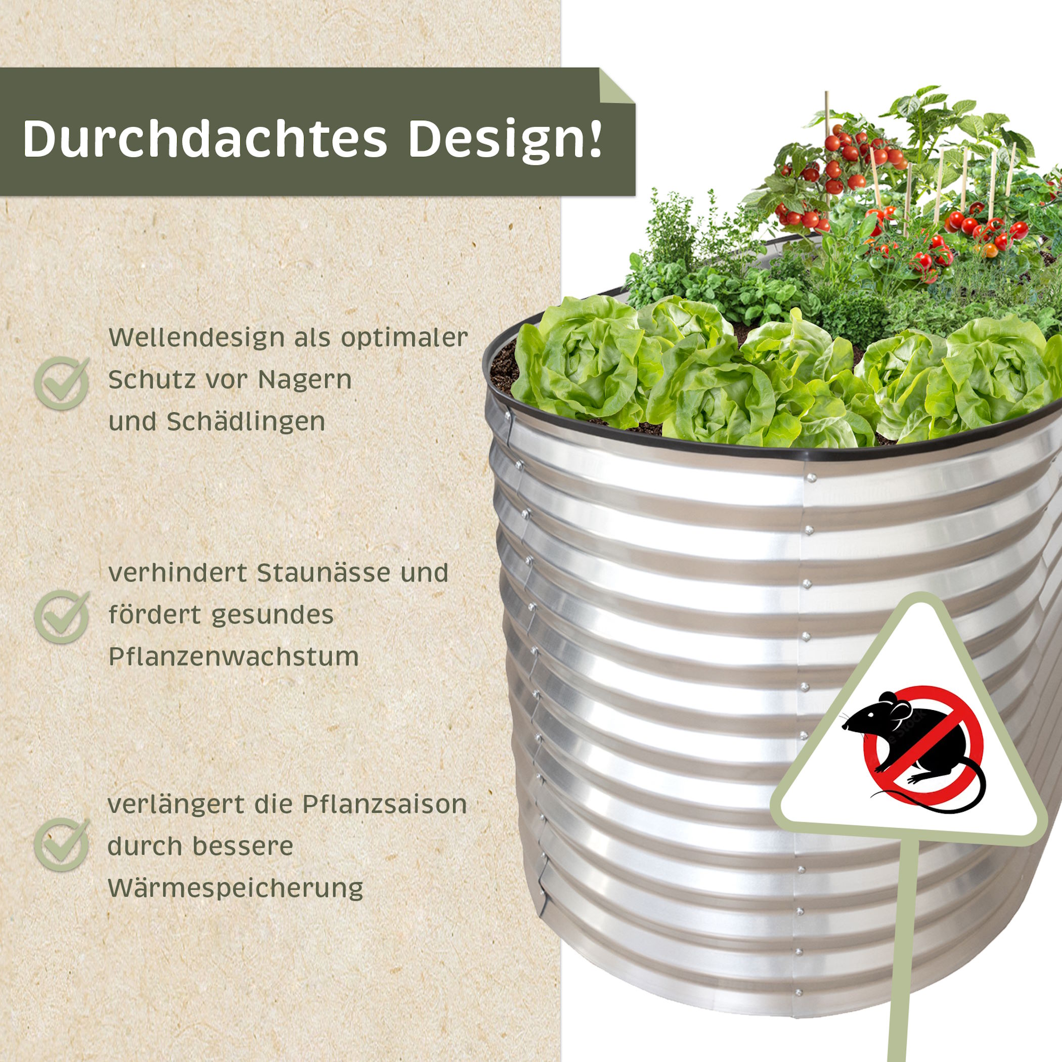 Mit einer Höhe von 63 cm hebt dieses Hochbeet Dein Gartenerlebnis wortwörtlich auf ein neues Level. Schluss mit Rückenschmerzen und unbequemen Arbeitshaltungen – hier arbeitest Du ganz entspannt im Stehen. Ob knackiges Gemüse, aromatische Kräuter oder süße Beeren: Alles gedeiht schneller, gesünder und ertragreicher. Gefertigt aus langlebigem, witterungsbeständigem Zincalume ist unser Hochbeet nicht nur robust, sondern auch absolut pflegeleicht. Anders als bei Holzhochbeeten benötigst Du keine Innenfolie, denn das Material reagiert nicht mit Erde oder Pflanzen, gibt keine Schadstoffe ab und ist geschmacksneutral. So bleibt das natürliche Gleichgewicht Deiner Anzucht jederzeit erhalten. Die 0,65 mm starke Wellenform verleiht dem Hochbeet nicht nur eine beeindruckende Stabilität, sondern auch eine moderne, elegante Optik. Es ist ein echter Blickfang, der sich harmonisch in jede Gartengestaltung einfügt. Ein besonderes Highlight ist das clevere Baukastensystem: Die vorgebogenen Elemente lassen sich ganz einfach und schnell verbinden. So kannst du das Hochbeet an Deine individuellen Bedürfnisse anpassen - flexibel und ohne Vorkenntnisse. Dieses Metallhochbeet ist mehr als ein Pflanzgefäß – es ist die ideale Lösung für alle, die ihren Garten lieben und das Beste aus ihm herausholen möchten.Produktdetails: Material: Zincalume (Zink und Aluminium beschichtete Stahlwelle)Materialstärke: 0,65 mm keine Innenfolie notwendig Produktinformationen: Baukastensystem Stabile Konstruktion, rostbeständigOptimale Pflanzmöglichkeit Langlebig und Witterungsbeständig