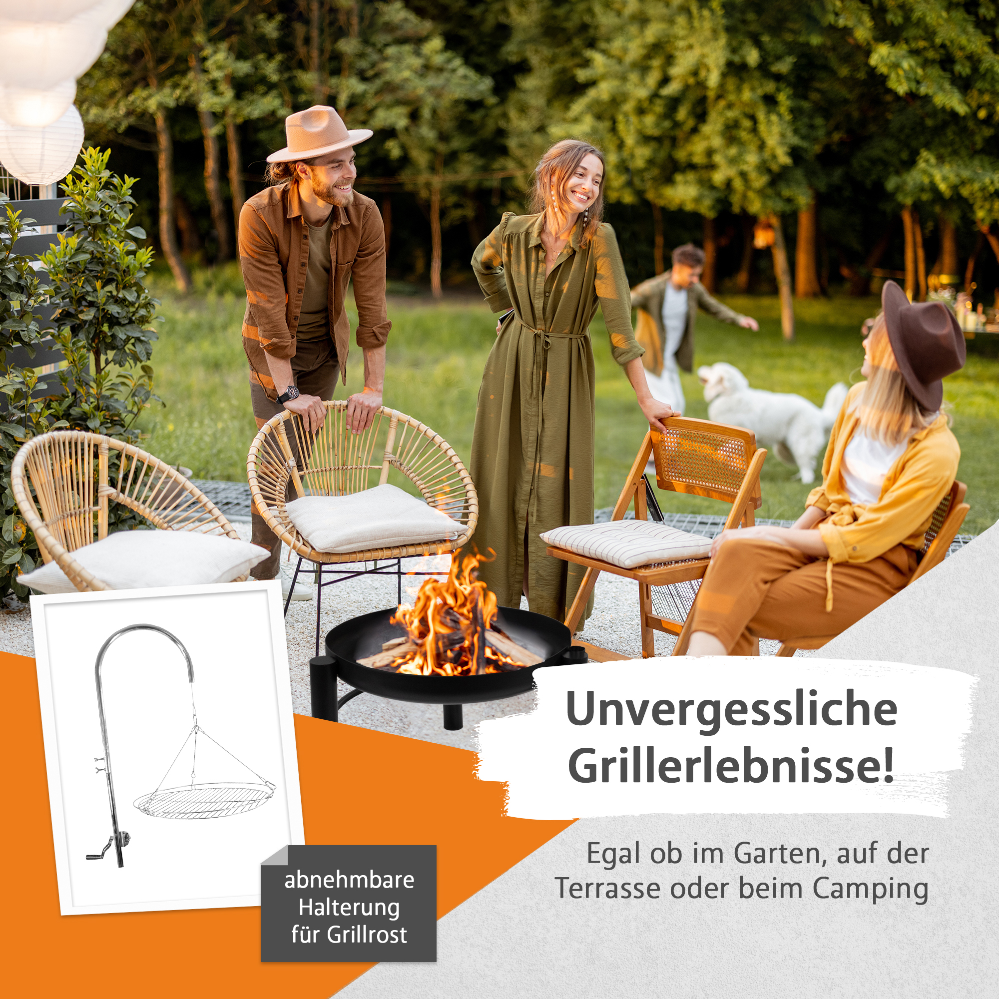 Der Grill verfügt über verschiedene Annehmlichkeiten, wie z.B. Höhenverstellung des Grillrostes, schwenkbarer Grillrost. Auch eine komplette Demontage der Grillrosthalterung ist möglich, dann können Sie die Feuerschale als reine Feuerstelle nutzen. Oder Sie grillen Stockbrot und Würstchen in alter, authentischer Weise mit einem Stock direkt über dem Feuer.