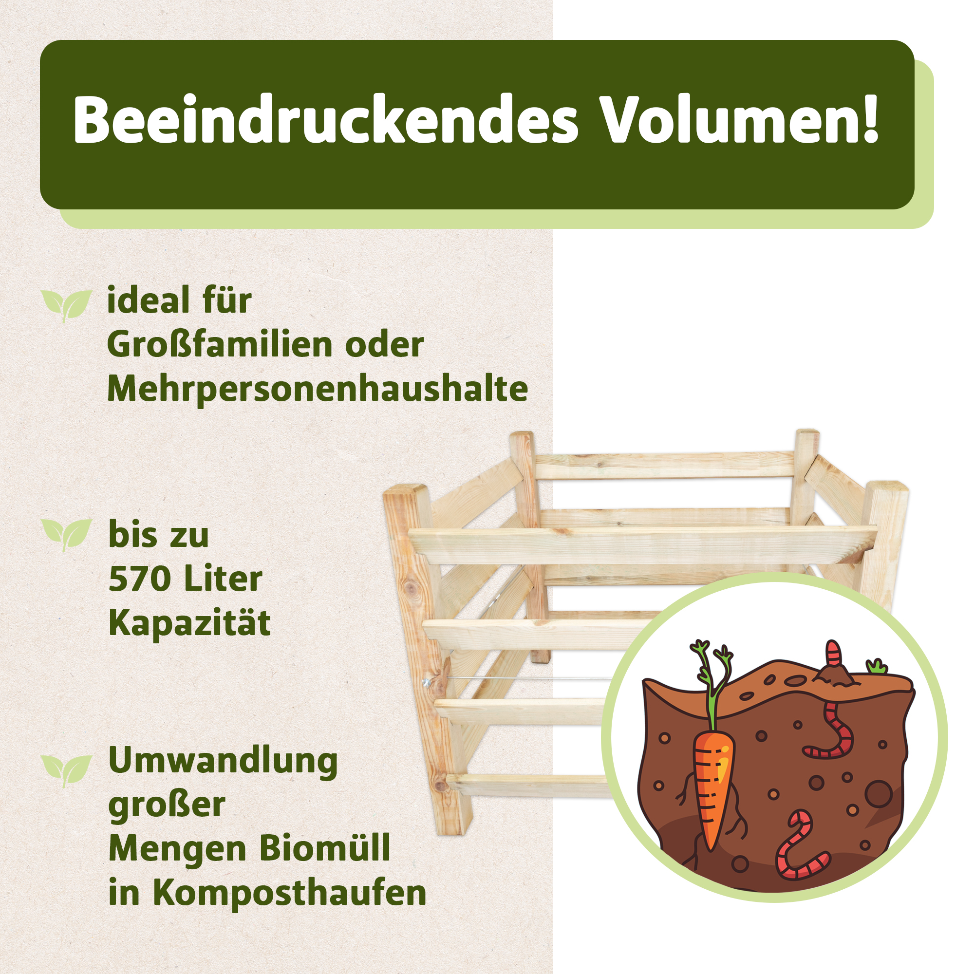 Unser Komposter ist die ideale Lösung für die umweltfreundliche Verwertung von Gartenabfällen und die Produktion nährstoffreichen Komposts. Dieser natürliche Dünger fördert das gesunde Wachstum von Pflanzen und Gemüse und verbessert die Bodenqualität nachhaltig. Dank des praktischen Stecksystems lässt sich der Holzkomposter mühelos und ohne Werkzeug montieren. Eine zusätzliche Metallstange sorgt für extra Stabilität, sodass der Komposter sicher und langlebig bleibt. Der komplette Bausatz ist im Lieferumfang enthalten, sodass der Aufbau schnell und unkompliziert gelingt. Gefertigt aus kesseldruckimprägniertem Holz, überzeugt unser Gartenkomposter durch hohe Widerstandsfähigkeit und Wetterbeständigkeit. Mit einem großzügigen Fassungsvermögen von 570 Litern bietet er ausreichend Platz für große Mengen an organischen Abfällen – ideal für Haushalte mit hohem Biomüllaufkommen. Ein weiteres Highlight ist die platzsparende Konstruktion: Bei Nichtgebrauch kann der Komposter mühelos demontiert und kompakt verstaut werden. Diese flexible Handhabung macht ihn zu einer praktischen und effizienten Lösung für Gärten jeder Größe. Unser Steckkomposter vereint einfache Handhabung, Stabilität und Nachhaltigkeit – für eine umweltfreundliche Gartenpflege und die optimale Verwertung organischer Abfälle.
