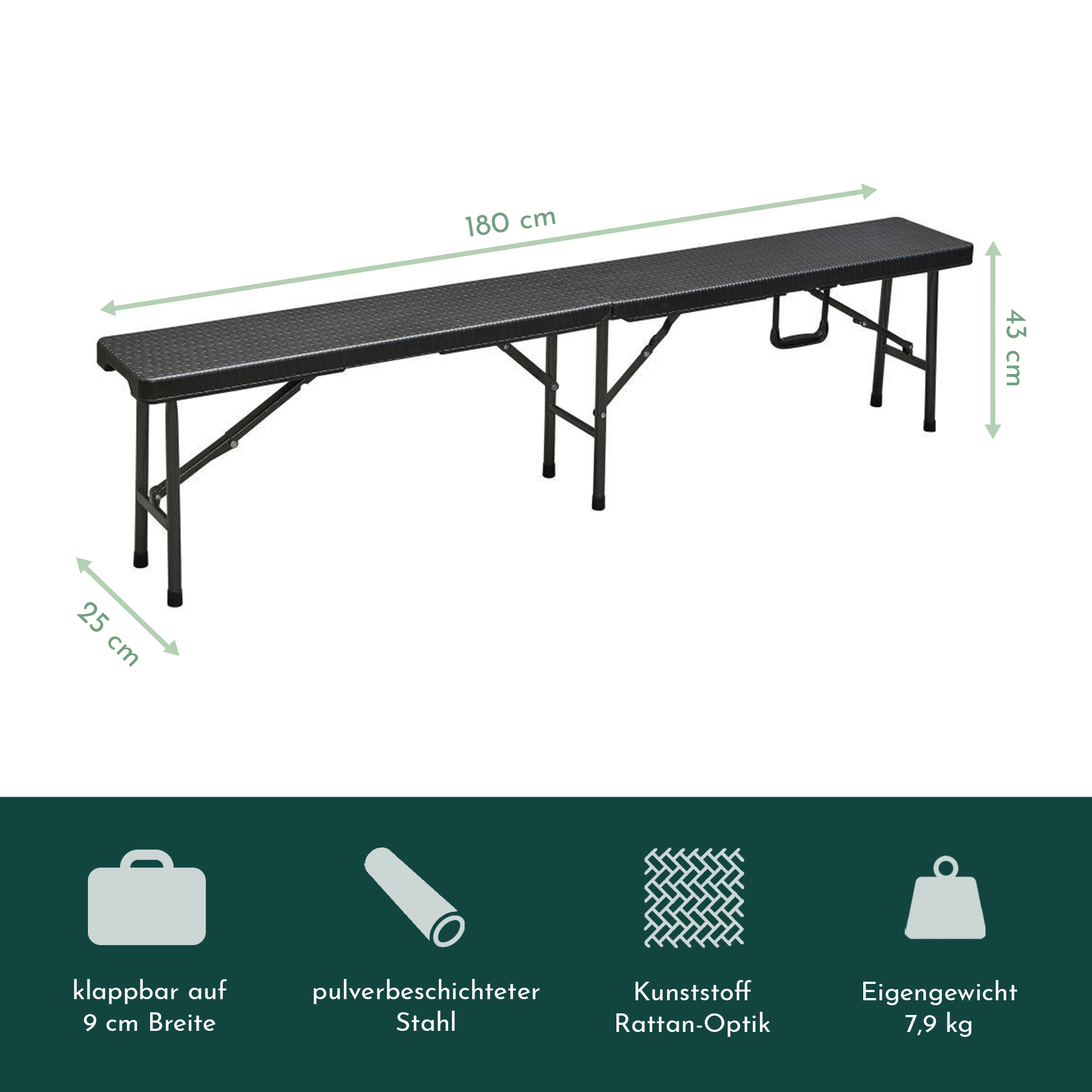 Die Bank besteht aus einem pulverbeschichtetem schwarzem Stahlrohrgestell und einer robusten schwarzen Sitzauflage aus HDPE. Die Bank lässt sich auf ein handliches Maß von 90cm zusammenklappen.Ein Tragegriff ermöglicht einen einfachen Transport.