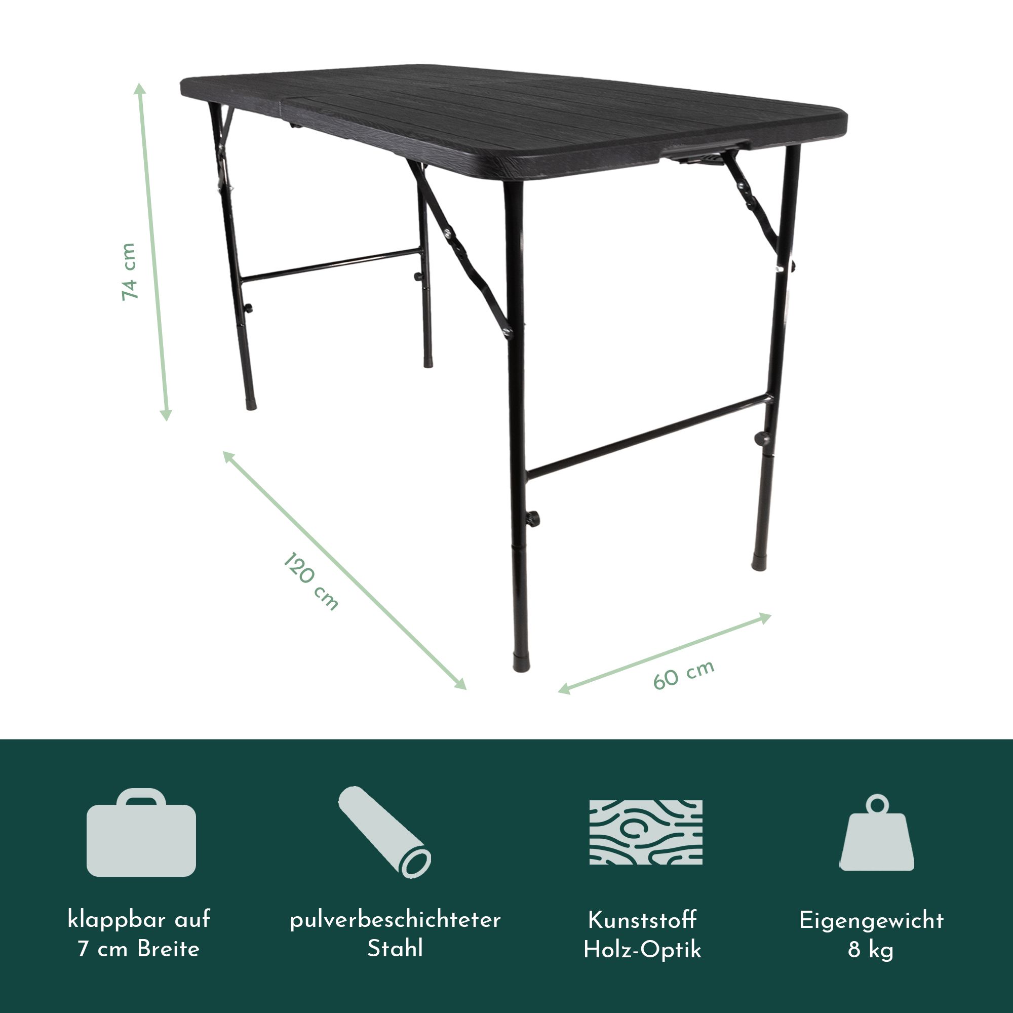 Die Tischplatte besteht aus hochwertigem und strapazierfähigem Kunststoff in Holz-Optik. Sie ist robust genug, um dem täglichen Gebrauch standzuhalten und eine gleichmäßige Oberfläche für verschiedene Aktivitäten zu bieten. Ob Du den Klapptisch zum Essen, als Arbeitsfläche oder als Ablage nutzt, die stabile Plastikplatte bietet ausreichend Platz und unterstützt Dich bei Deinen Vorhaben.