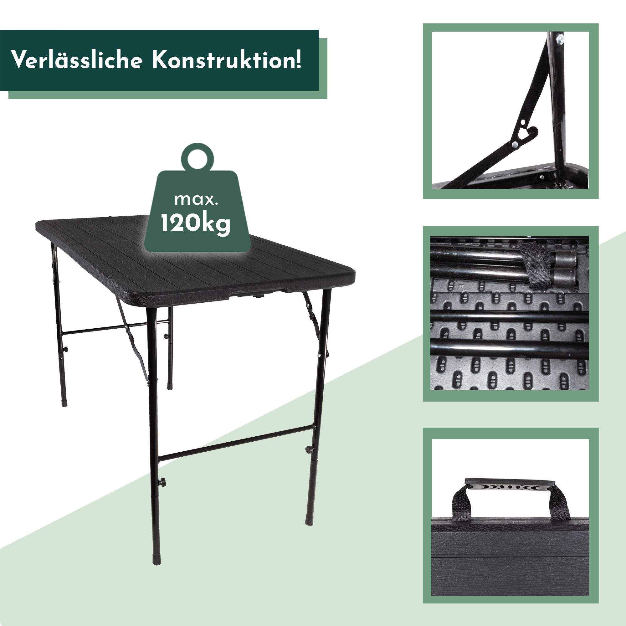 Die Konstruktion des Garten Tisches ist zuverlässig und sicher. Er verfügt über eine Sicherheitsarretierung, die ein ungewolltes Zusammenklappen verhindert. Die Tischbeine sind aus robustem Metall für zusätzliche Stabilität. Die Tischplatte besteht aus hochwertigem und strapazierfähigem Kunststoff in Holzoptik, der eine gleichmäßige Oberfläche für verschiedene Aktivitäten bietet.