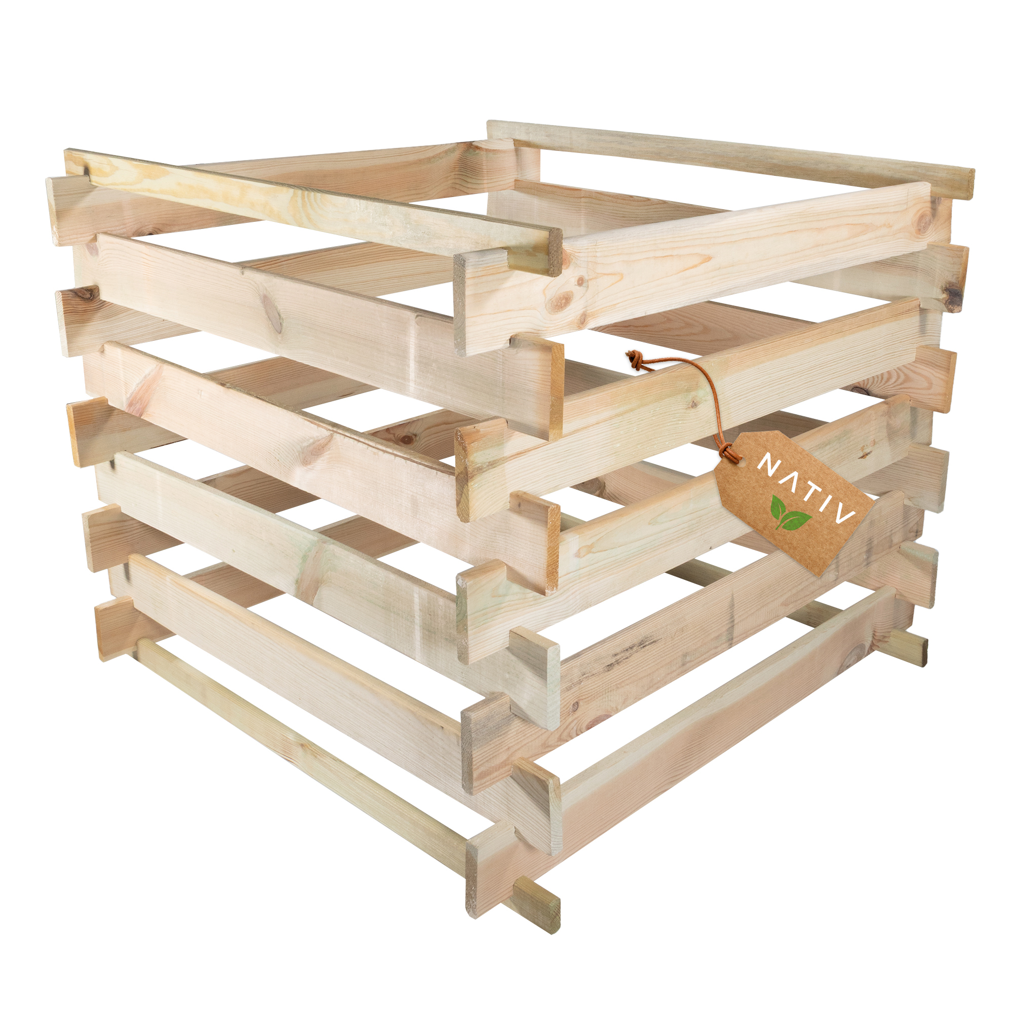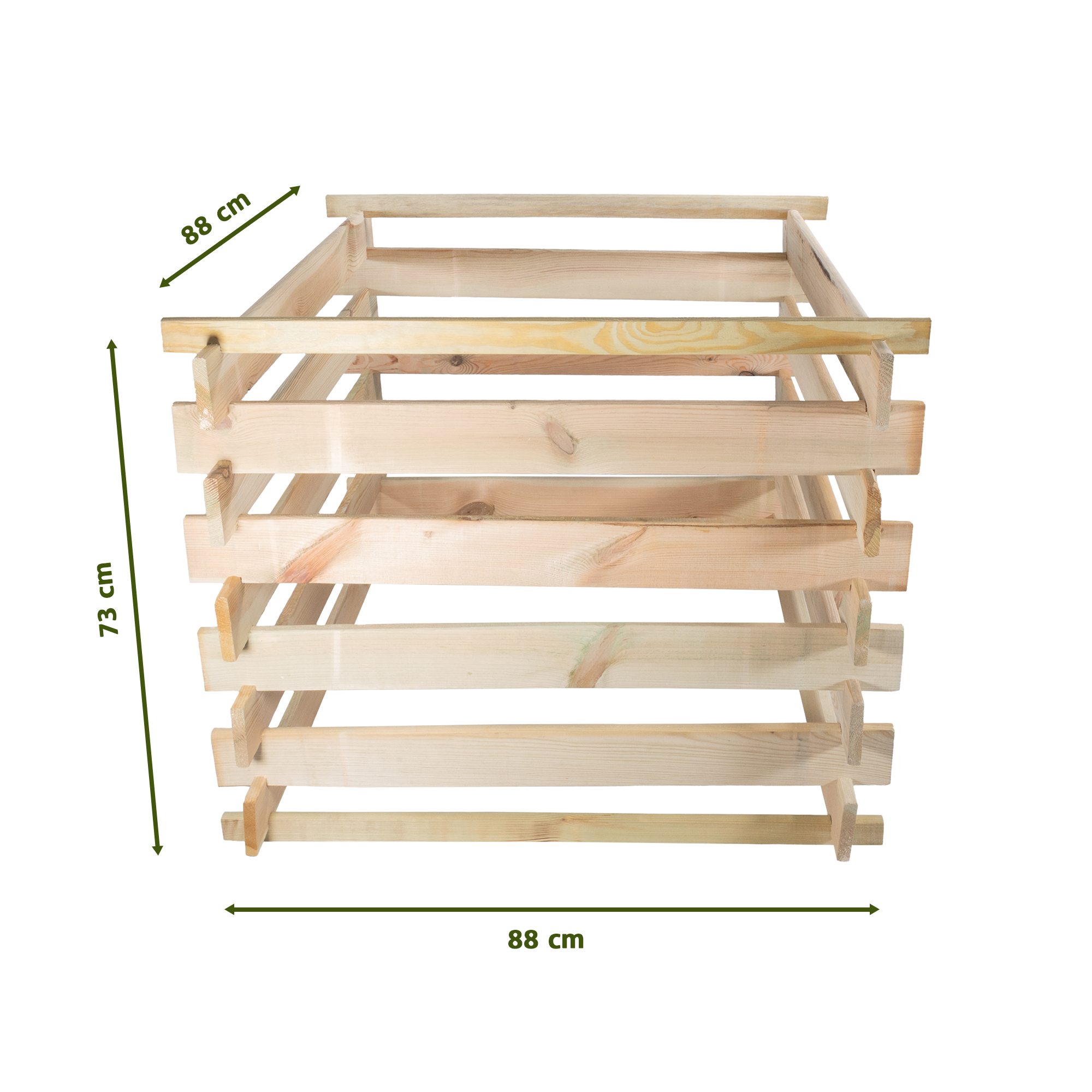Unser Komposter ist die ideale Lösung für die umweltfreundliche Verwertung von Gartenabfällen und die Produktion nährstoffreichen Komposts. Dieser natürliche Dünger fördert das gesunde Wachstum von Pflanzen und Gemüse und verbessert die Bodenqualität nachhaltig. Dank des praktischen Stecksystems lässt sich der Holzkomposter mühelos und ohne Werkzeug montieren. Eine zusätzliche Metallstange sorgt für extra Stabilität, sodass der Komposter sicher und langlebig bleibt. Der komplette Bausatz ist im Lieferumfang enthalten, sodass der Aufbau schnell und unkompliziert gelingt. Gefertigt aus kesseldruckimprägniertem Holz, überzeugt unser Gartenkomposter durch hohe Widerstandsfähigkeit und Wetterbeständigkeit. Mit einem großzügigen Fassungsvermögen von 570 Litern bietet er ausreichend Platz für große Mengen an organischen Abfällen – ideal für Haushalte mit hohem Biomüllaufkommen. Ein weiteres Highlight ist die platzsparende Konstruktion: Bei Nichtgebrauch kann der Komposter mühelos demontiert und kompakt verstaut werden. Diese flexible Handhabung macht ihn zu einer praktischen und effizienten Lösung für Gärten jeder Größe. Unser Steckkomposter vereint einfache Handhabung, Stabilität und Nachhaltigkeit – für eine umweltfreundliche Gartenpflege und die optimale Verwertung organischer Abfälle. Produktdetails: Material: Holz FSC-zertifiziert (Kiefer) Außenmaß: ca. 100 x 100 x 80 cm (L x B x H) Innenmaß: ca. 85 x 85 (L x B) Bretthöhe: ca. 8,5 cm Brettstärke: ca. 1,5 cm Spaltbreite: ca. 10 cm Pfostenstärke: 6,5 x 6,5 cm (L x B) imprägniert in grün Gewicht: ca. 19 kg Produktinformationen: imprägniertes Holz für lange Lebensdauer und Schutz vor Pilzbefall einfaches Stecksystem zusätzliche seitliche Metallstreben für mehr Stabilität Seitenbretter alle einzeln entnehmbar breite Schlitze an allen Seitenteilen