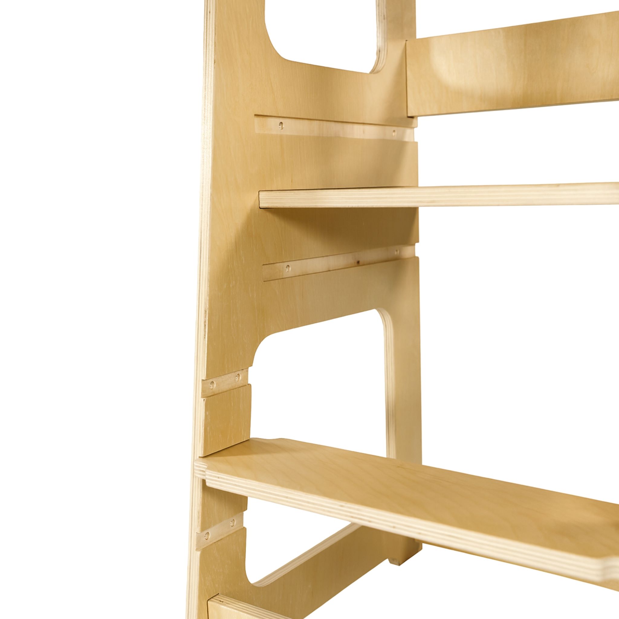 Sicherheit hat oberste Priorität, wenn Kinder erhöht stehen. Genau hier spielt der Lernturm seine Stärke aus. Die seitlichen Elemente geben deinem Kind Halt, während die Standfläche ausreichend groß ist, damit es sich bewegen kann, ohne gleich den Halt zu verlieren. Die Konstruktion aus robustem Birkenholz ist bis ca. 50 kg belastbar und sorgt für einen sicheren Stand. Statt auf wackelige Stühle oder Hocker zu klettern, steigt dein Kind über die dafür vorgesehene Öffnung auf die Standfläche. So minimierst du das Risiko, dass es seitlich abrutscht oder der Stuhl umkippt. Du hast dein Kind jederzeit gut im Blick – und trotzdem die Hände frei, um dich auf deine Aufgabe zu konzentrieren.
