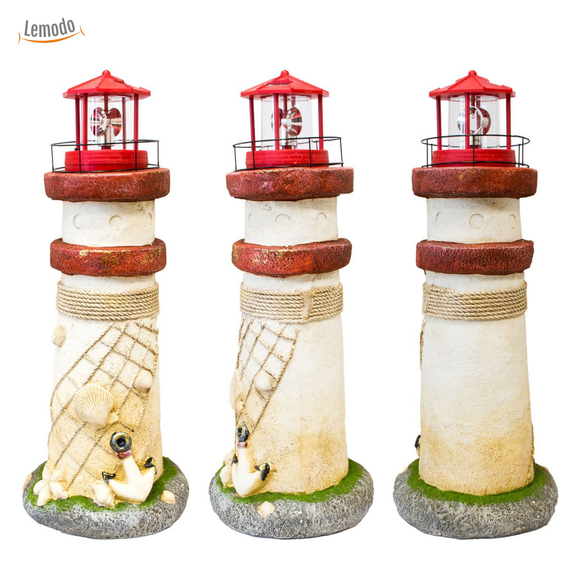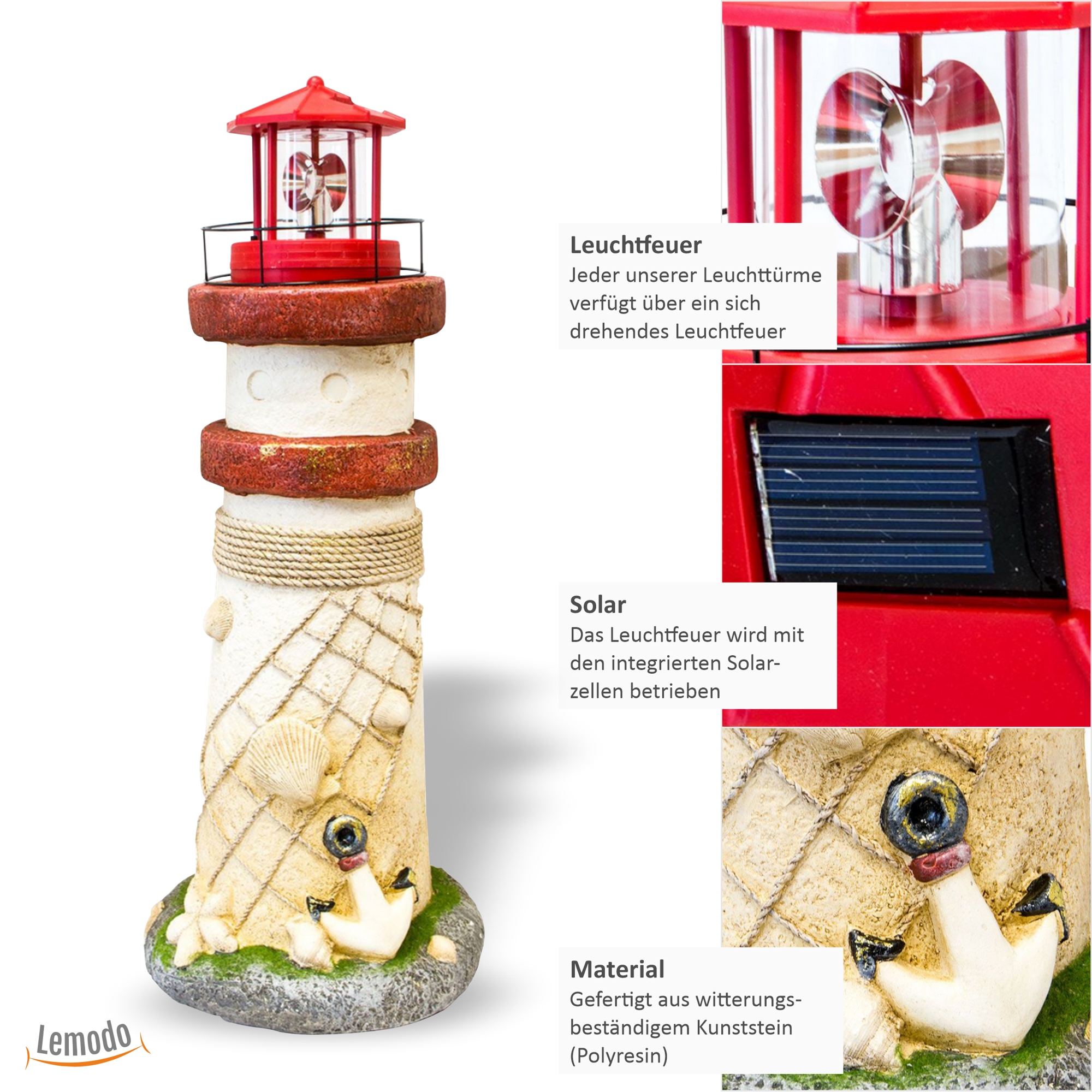 Das weite Meer, die Wellen und die Brandung … holen Sie sich ein Stück maritime Atmosphäre in Ihren Garten – mit diesem dekorativen Solarleuchtturm mit Fischernetz, Anker, Seestern und weiteren liebevoll gestalteten Details. Der nostalgische Deko-Leuchtturm ist aus witterungsbeständigem Kunststein (Polyresin) hergestellt und mit einer rotierenden Rundum-Leuchte ausgestattet. Sobald die Dämmerung hereinbricht, erstrahlt das Leuchtfeuer und dreht sich um die eigene Achse. Dank des integrierten Solarmoduls wird die tagsüber einstrahlende Sonnenenergie gespeichert und bei Einbruch der Dunkelheit an die LED-Leuchte abgegeben. Auch auf der Terrasse oder im Wintergarten ist der dekorative Leuchtturm ein echtes Highlight. Es handelt sich hier um ein handgefertigtes Produkt welches material- und fertigungsbedingt auch etwas krumme natürliche Konturen haben kann. Die Rundum-Leuchte aus Kunststoff wird oben in die Vertiefung nur eingesetzt und sitzt fertigungsbedingt nicht passgenau. Dadurch erhält der Leuchtturm einen natürlichen Look.