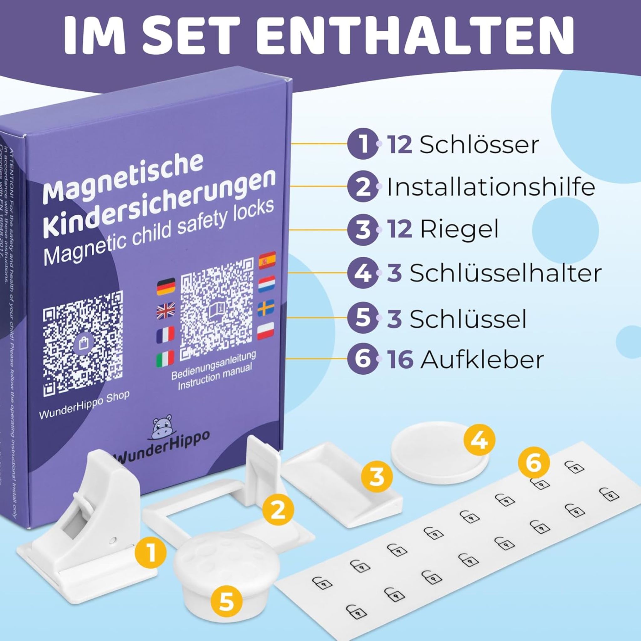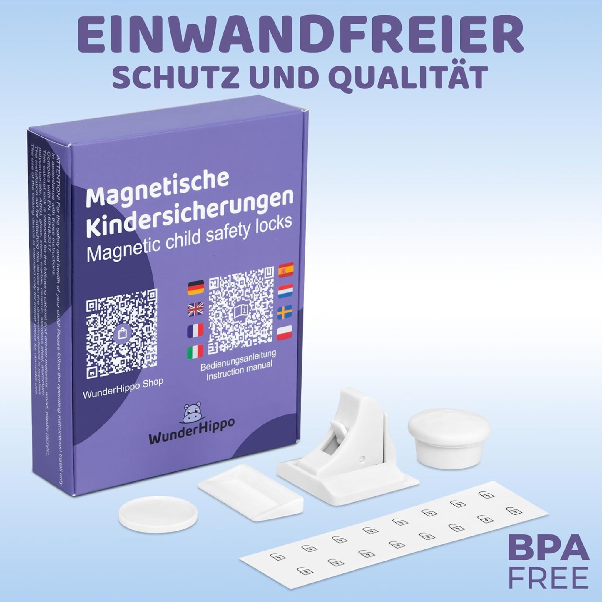 Schütze Dein Zuhause stilvoll: Die unsichtbare Magnetschloss-Kindersicherung von WunderHippo bewahrt Deine Möbel vor Bohrlöchern und sichtbaren Riegeln und hält neugierige Kinderhände zuverlässig von gefährlichen Gegenständen fern. Dank starkem Klebeband und praktischem Installationsrahmen ist die Sicherung in wenigen Minuten angebracht. Keine Schrauben, keine Schäden. Schritt-für-Schritt-Videos finden Sie bequem auf der Produktseite. Das Klebeband haftet sicher auf fast allen Oberflächen und lässt sich bei Bedarf durch leichtes Erwärmen mit dem Föhn sauber entfernen. Sind die Kinder außer Haus, kann die Sicherung mit nur einem Knopfdruck deaktiviert werden – ganz ohne Demontage. Die starken Magnete öffnen zuverlässig bis zu 35 mm Materialstärke. Ideal für Schubladen, Küchen- und Badezimmerschränke, Kommoden. Zum Öffnen hältst du den Magnetschlüssel an das Schloss – ein kleines Etikett zeigt die richtige Position. Jeder Schlüssel kommt mit einem Halter, der sich an einem kindersicheren Ort oder einfach am Kühlschrank befestigen lässt.