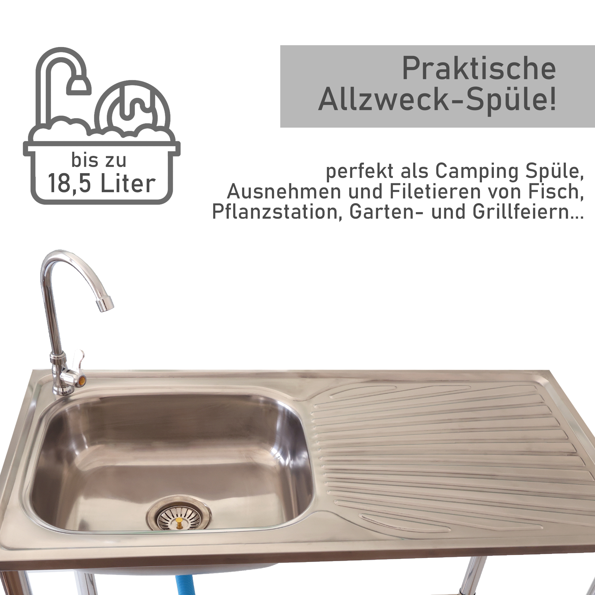 - ROBUST UND LANGLEBIG: Das Spülbecken besteht aus hochwertigem Edelstahl, der für seine Langlebigkeit und Korrosionsbeständigkeit bekannt ist. Dadurch ist die Outdoorspüle perfekt für den Einsatz im Freien oder bei Campingaktivitäten geeignet