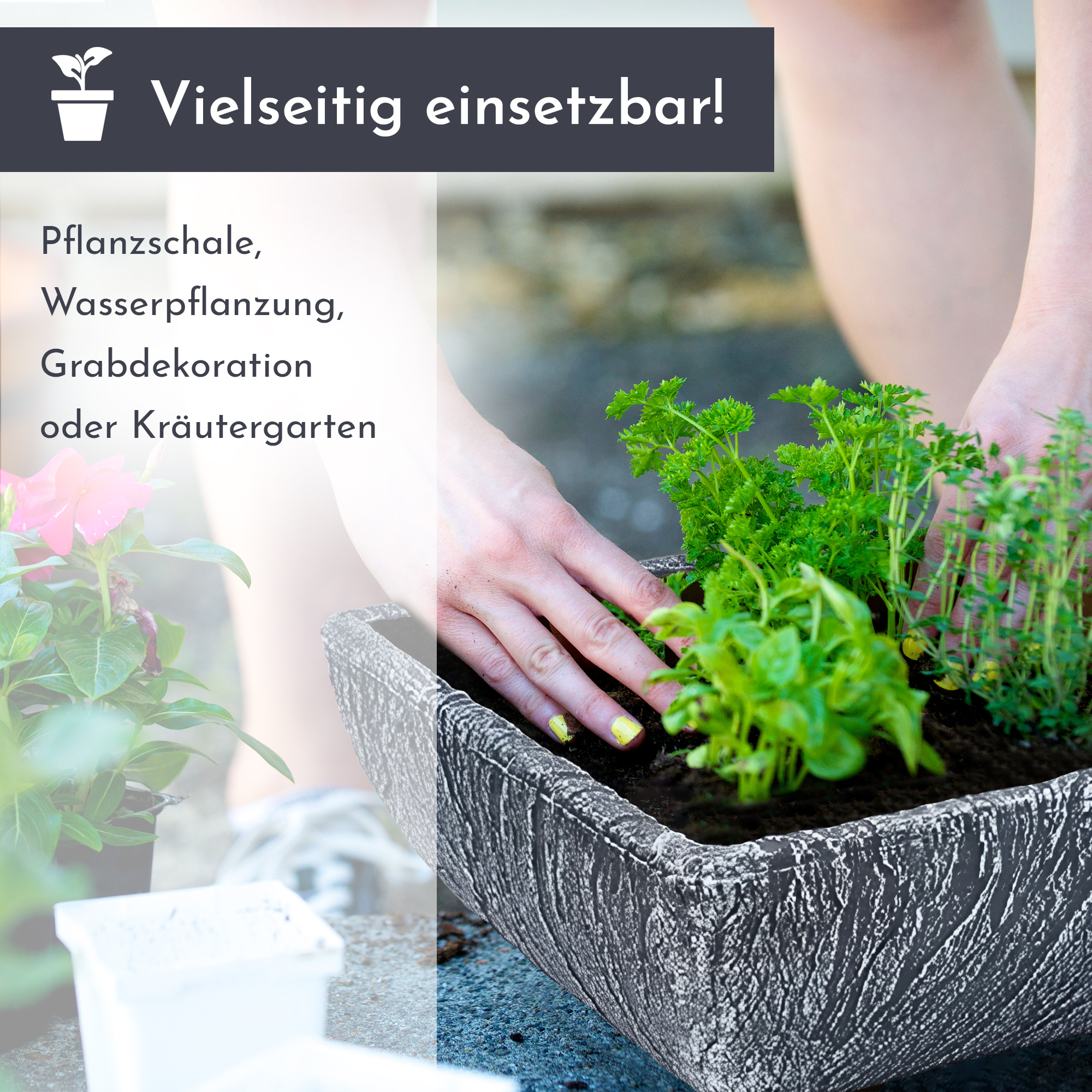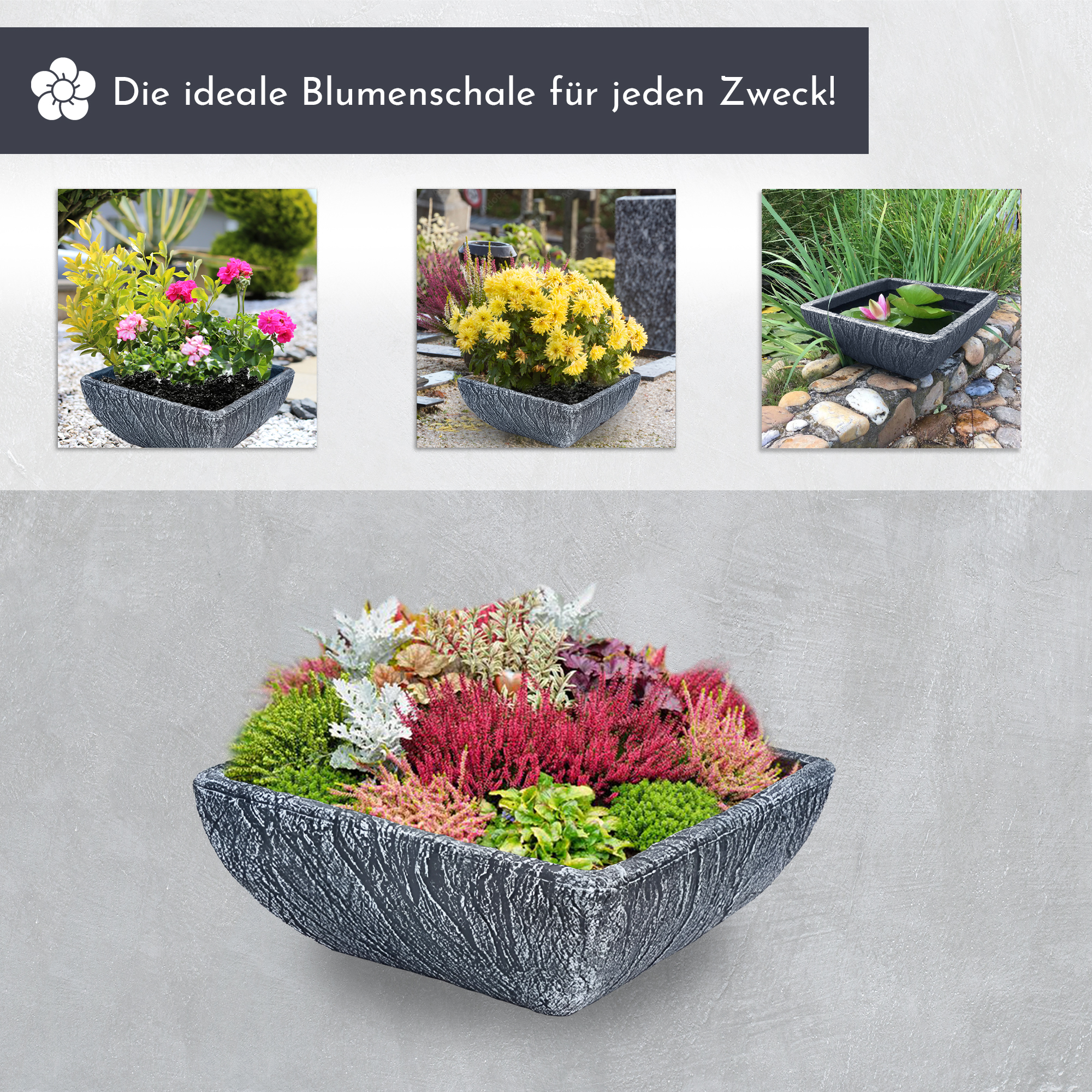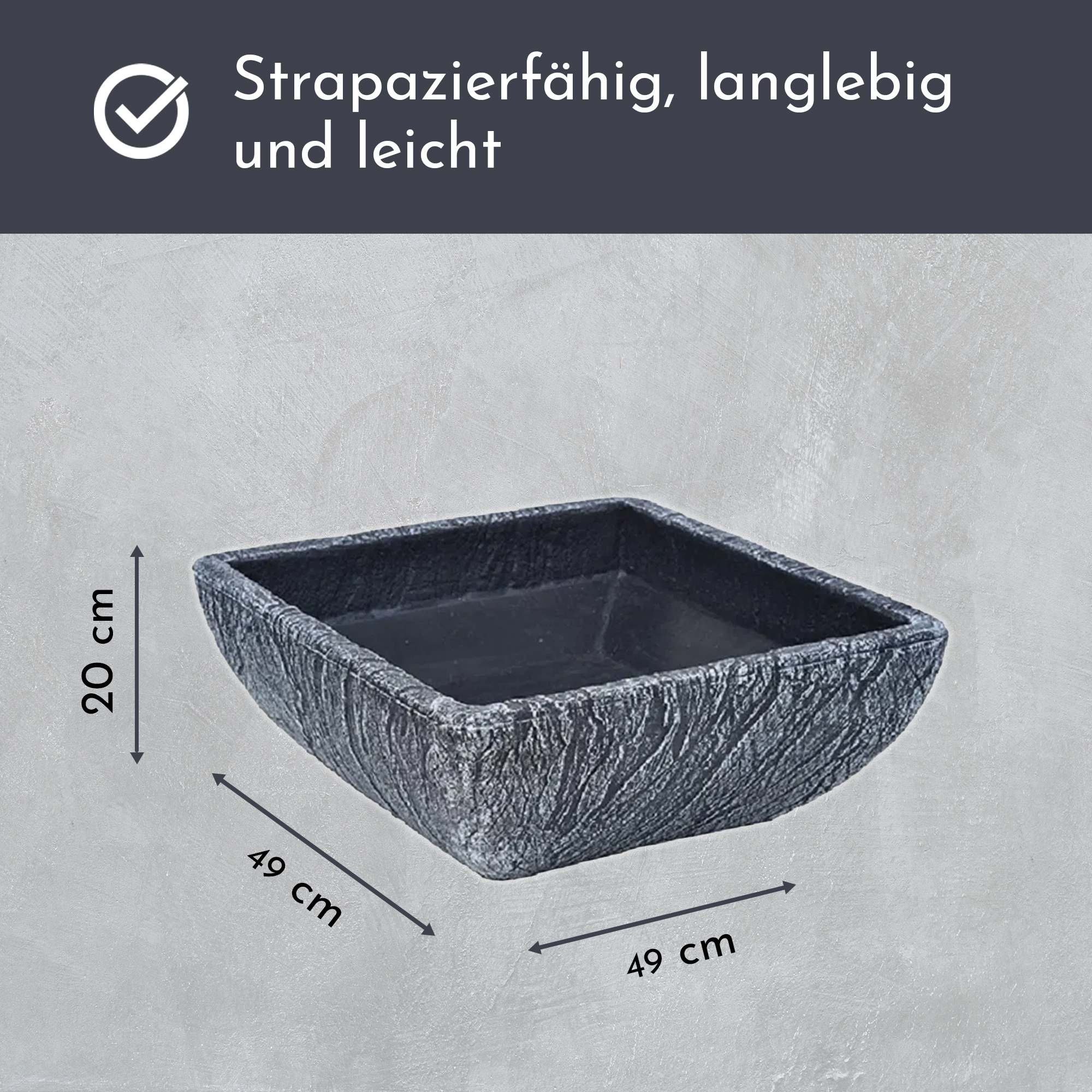 Pflanzschale aus Kunststoff, eckiger Pflanztopf, Grabschale, Stein-Optik