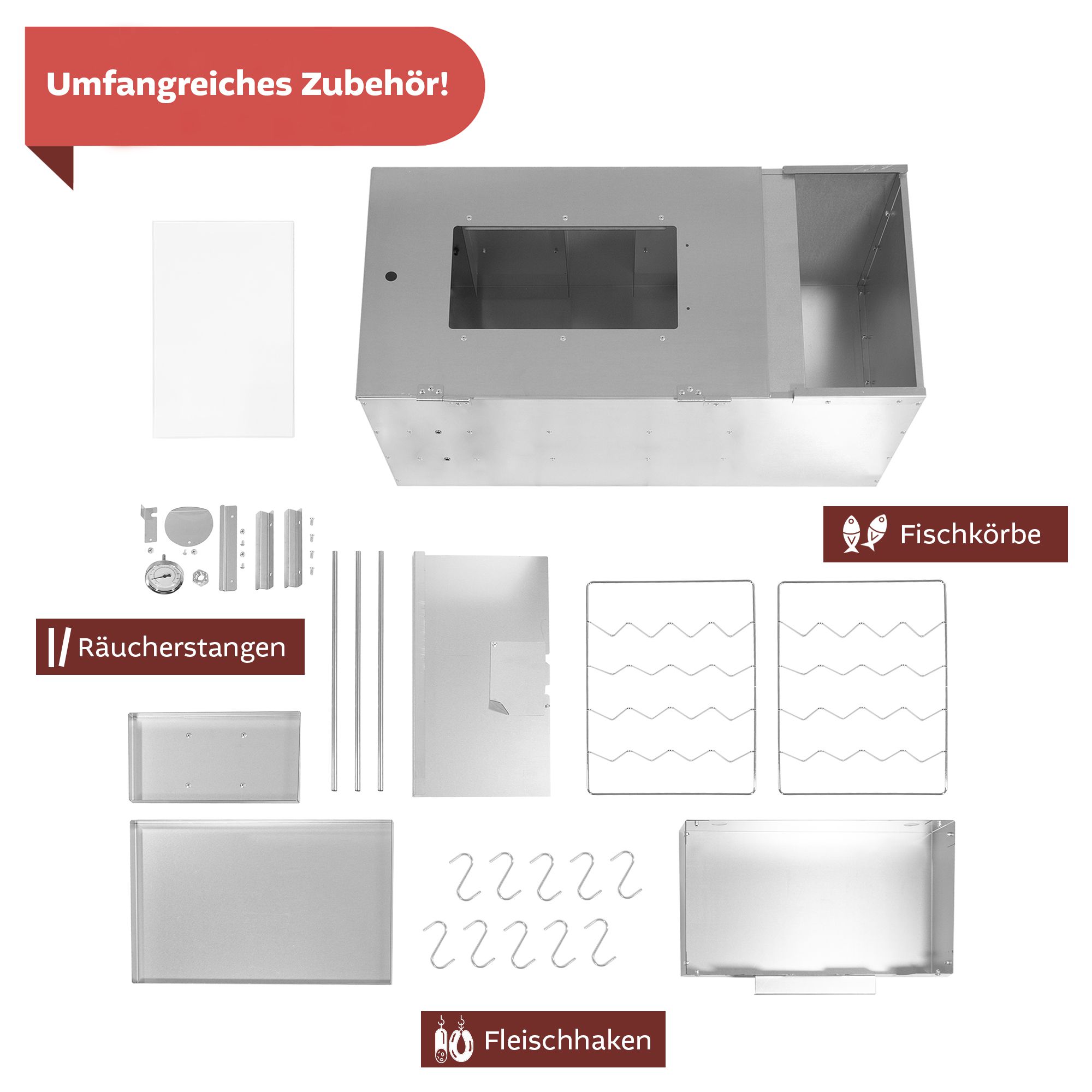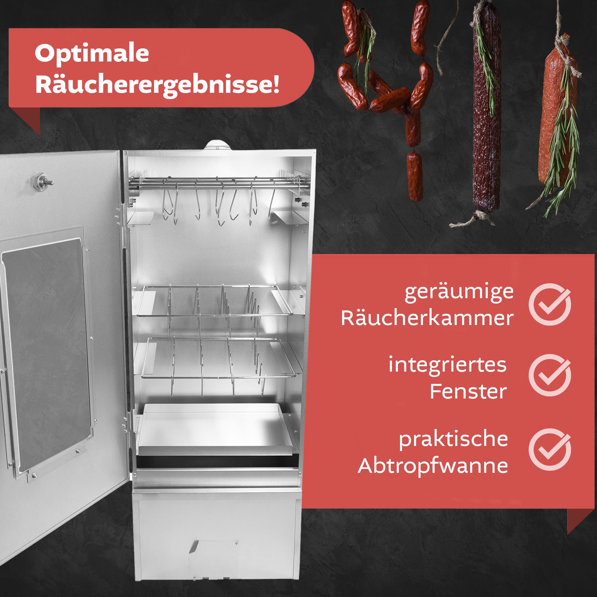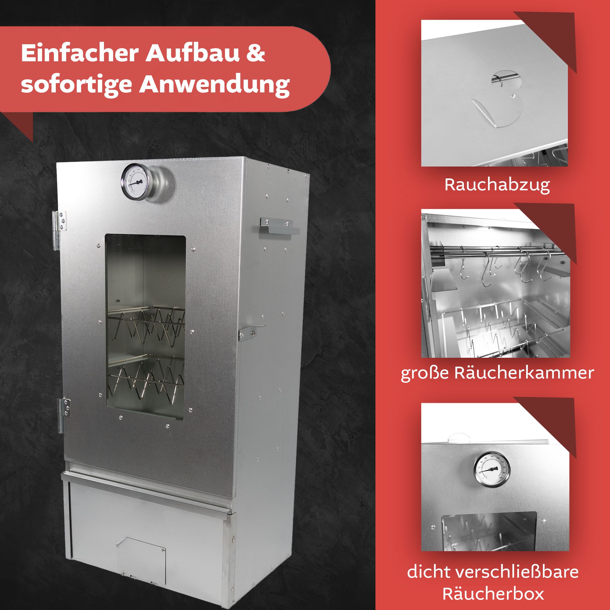 Erlebe das ultimative Räuchervergnügen mit dem hochwertigen Räucher-Grillofen aus Metall in edlem Schwarz. Dieser vielseitige Smoker kombiniert traditionelles Räuchern mit modernem Grillvergnügen und sorgt für aromatische Geschmackserlebnisse, egal ob Fisch, Fleisch, Käse oder Gemüse. Dank des mitgelieferten Thermometers behältst du die Temperatur stets im Blick und kannst die Hitze optimal regulieren – für perfekte Räucherergebnisse bei jedem Einsatz. Die Einlegeschale für Räuchermehl ermöglicht eine einfache Handhabung und sorgt für ein intensives Raucharoma. Die robuste Metallkonstruktion gewährleistet eine gleichmäßige Wärmeverteilung, während die durchdachte Luftzufuhr eine individuelle Steuerung des Räucherprozesses ermöglicht. Egal, ob Du heiß oder kalt räuchern möchtest – mit diesem Ofen gelingt beides mühelos. Der Räucher-Grillofen eignet sich perfekt für Deinen Garten oder Terrasse. Entdecke die Welt des Räucherns und Grillens und genieße unvergleichliche Aromen!Produktdetails:Material: MetallFarbe: schwarzGröße: ca. 40 x 40 x 75 cm (L x B x H)Materialstärke: 0,8 mmGewicht: 8,9 kgProduktinformationen:Optimale Temperaturkontrolle dank ThermometerHochwertiges Metallgehäuse2-in-1 Funktion - Grill und Räucherofen in einemZum räuchern oder grillen von Fisch, Fleisch, Käse oder GemüsePerfekte Aroma-Entfaltung durch regulierbarer LuftzufuhrInkl. Einlegeschale für Räuchermehl für Grillkohle und Briketts geeignetoffenes Feuer vermeiden