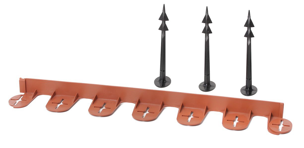 Die 60 cm langen Elemente werden fest miteinander verbunden und können beliebig erweitert werden. Die Bodendübel, mit denen die Umrandung fest im Boden verankert wird, sorgen dafür, dass die Rasenkante in der gewünschten Form bleibt.