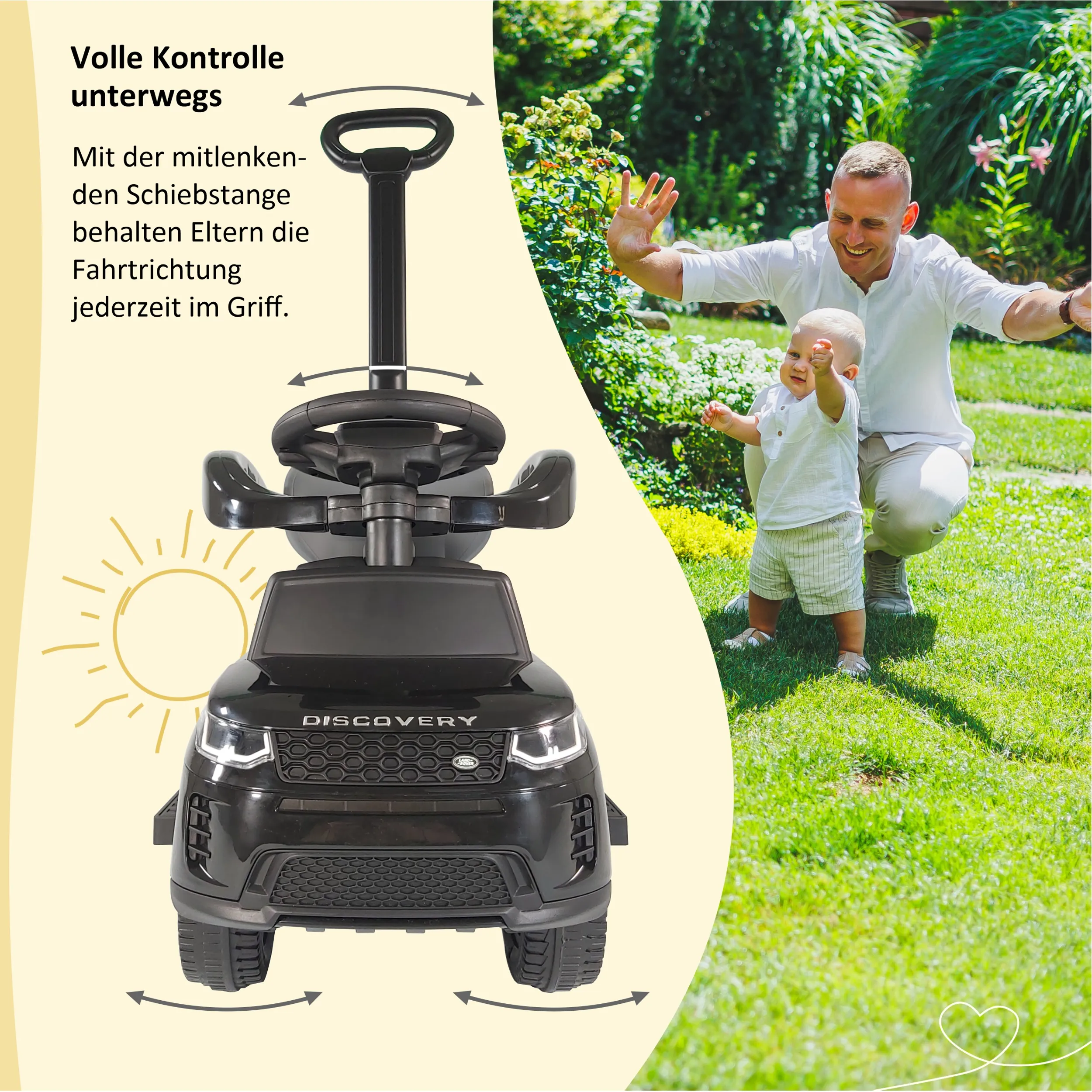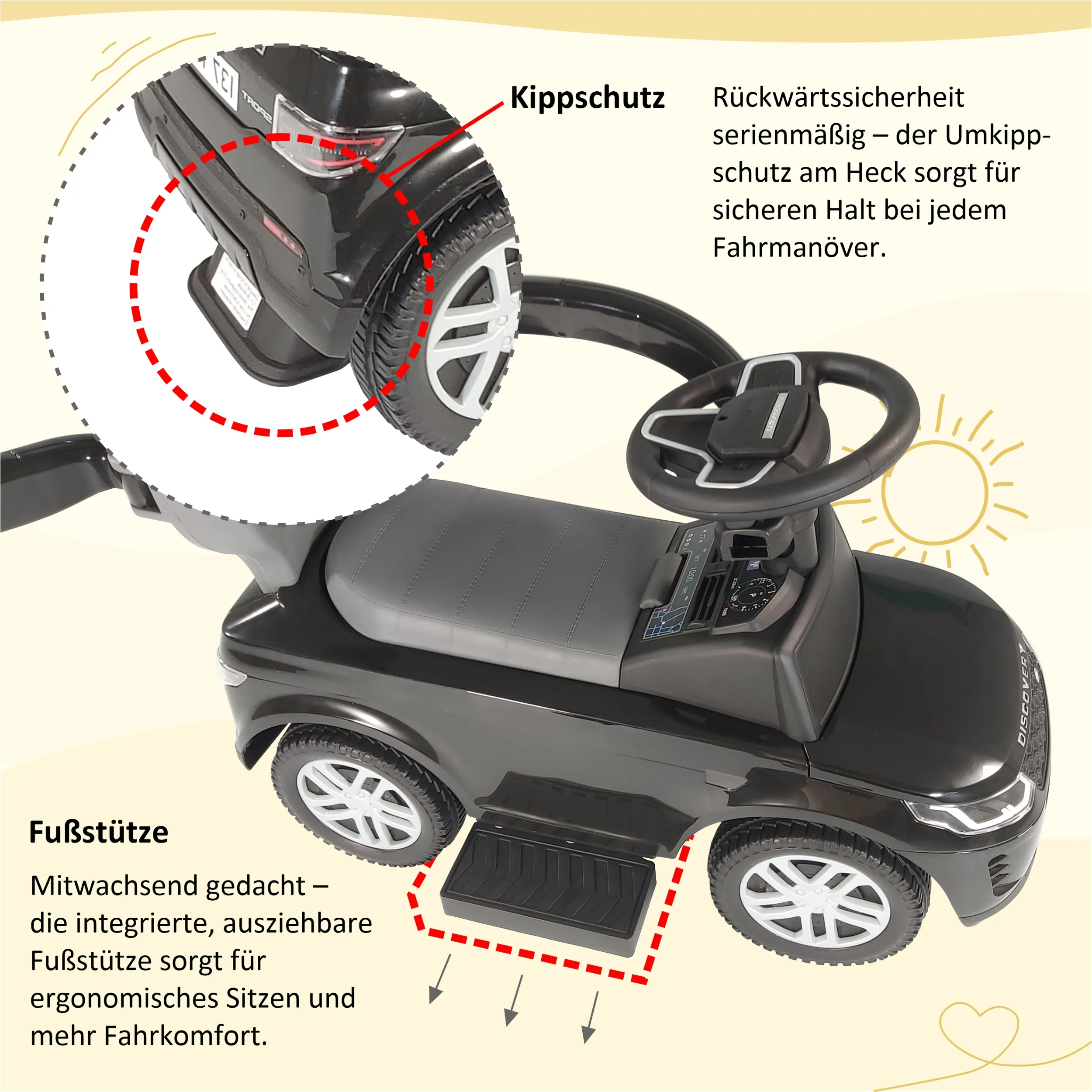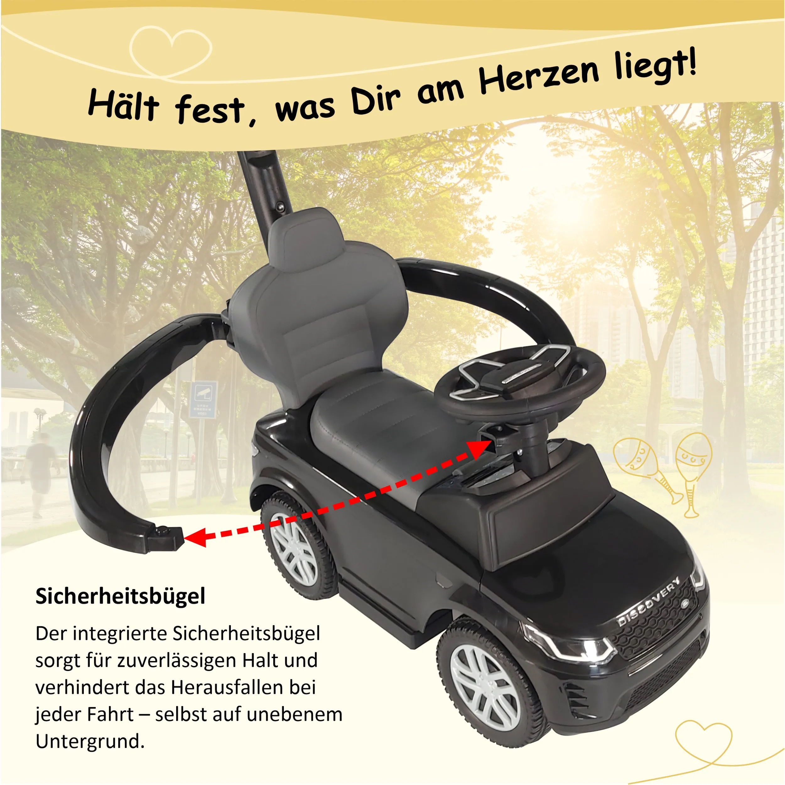 Rutschauto Land Rover schwarz mit Schiebestange, Kinderfahrzeug mit Soundlenkrad