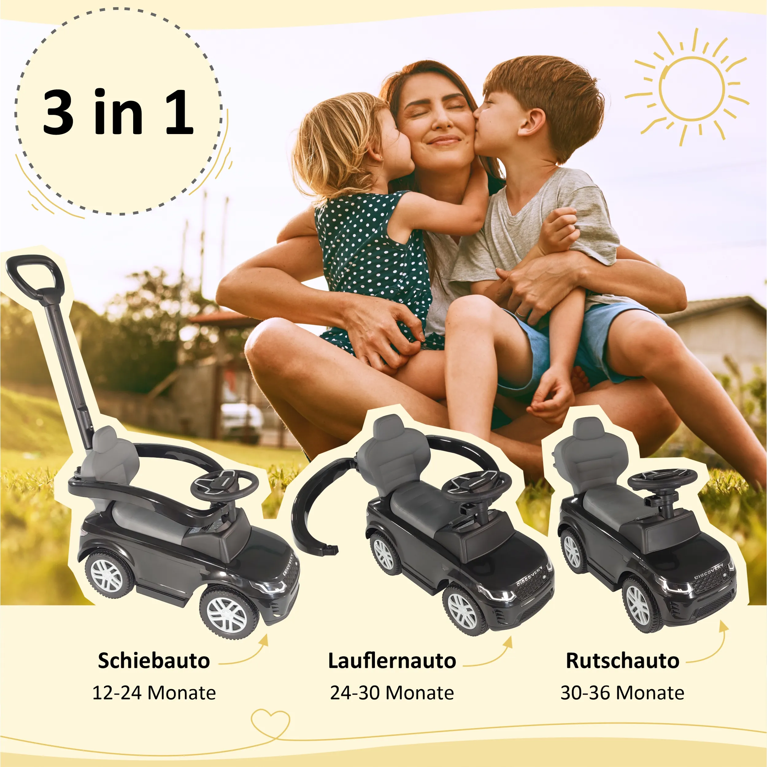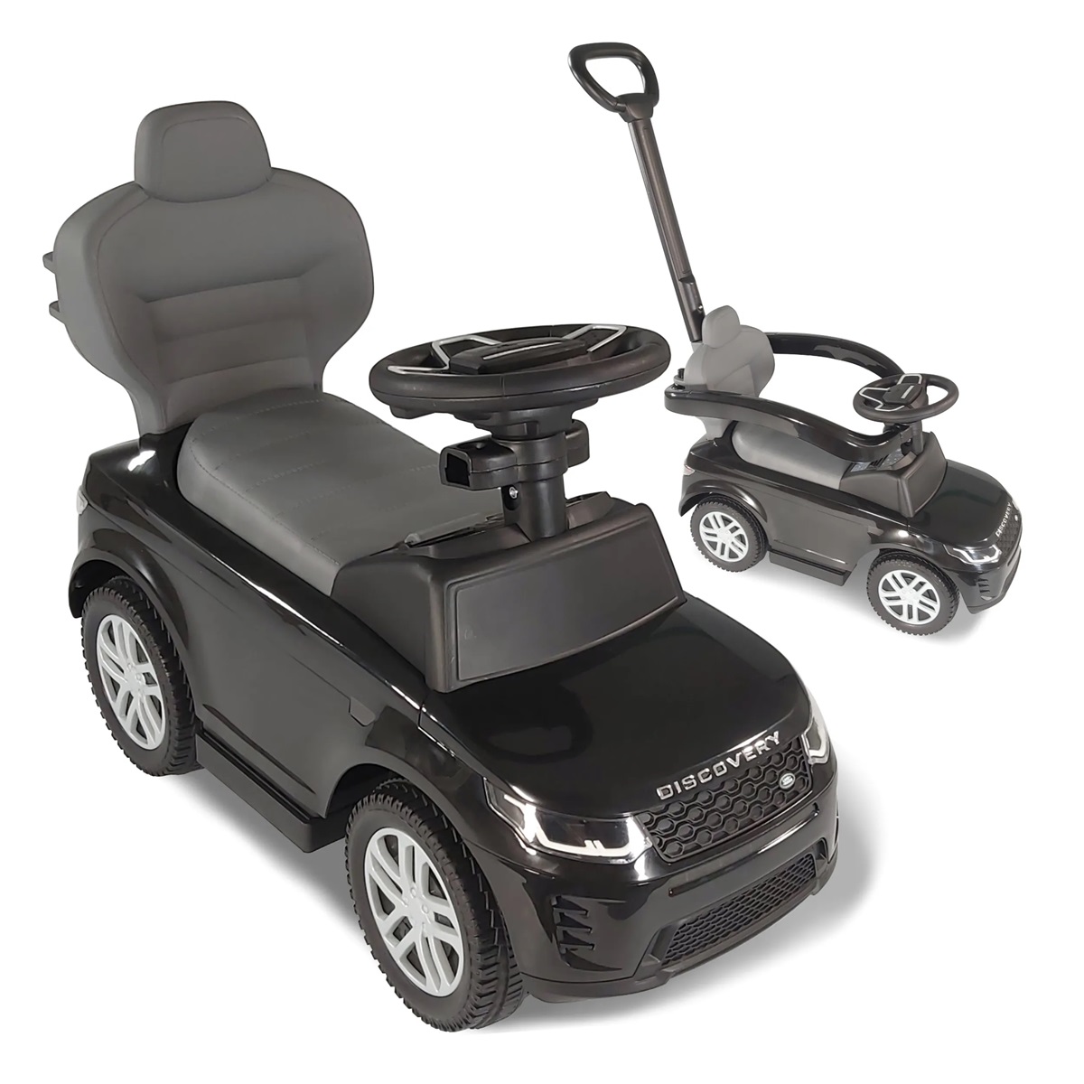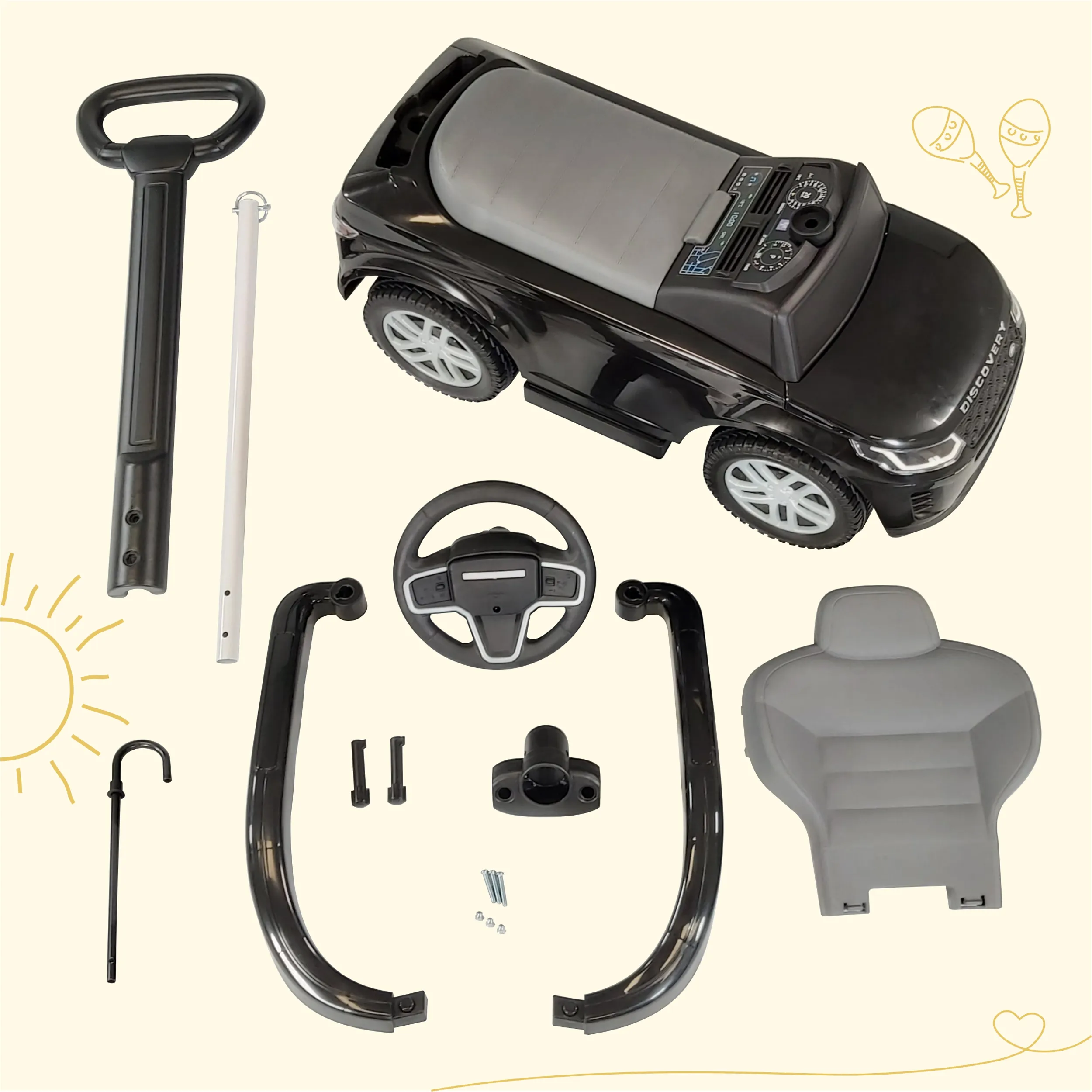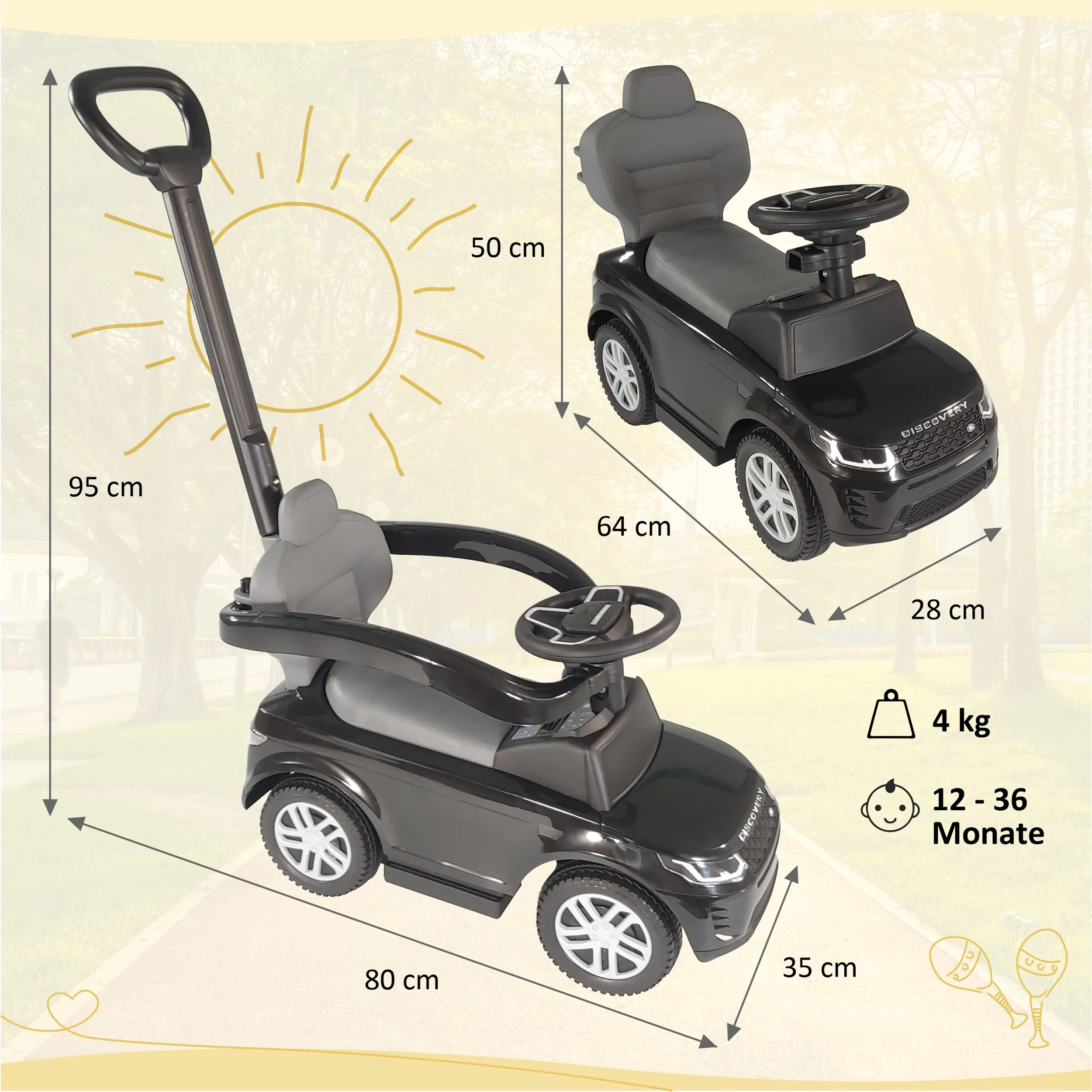 Rutschauto Land Rover schwarz mit Schiebestange, Kinderfahrzeug mit Soundlenkrad
