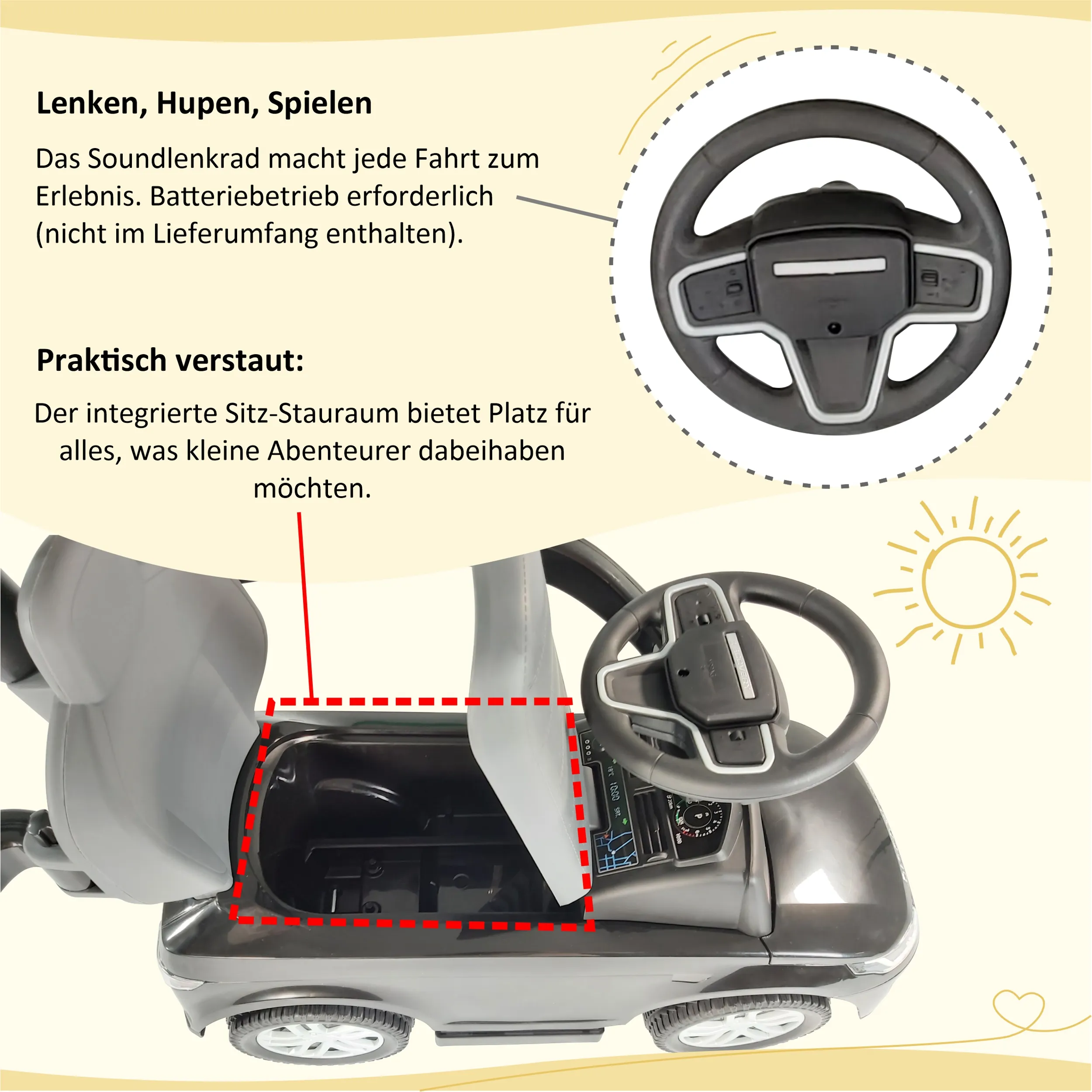 Produktinformationen "Rutschauto Land Rover schwarz mit Schiebestange, Kinderfahrzeug mit Soundlenkrad"