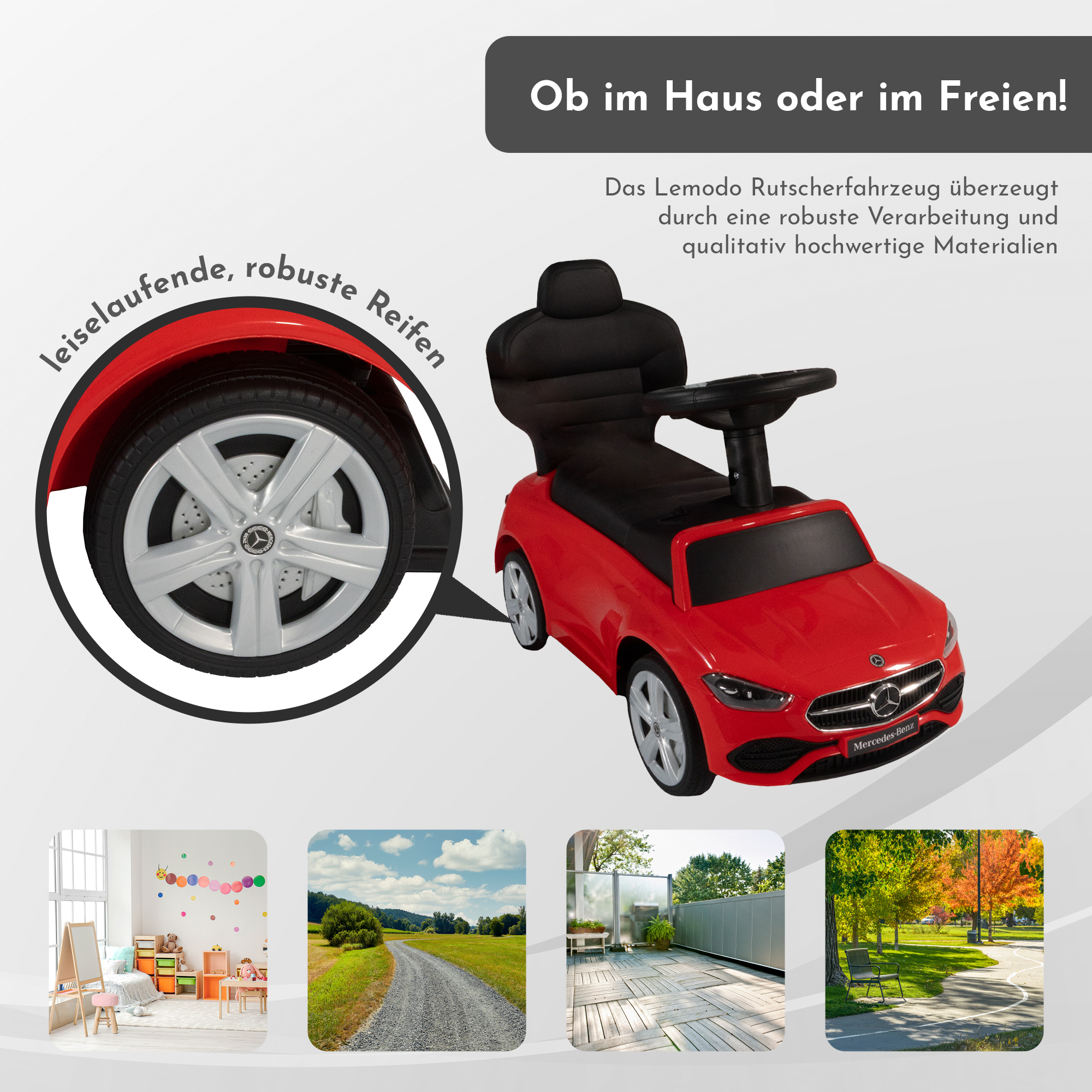 Der Traum vom eigenen SUV ist für ihr Kinder näher als sie denken. Mit unserem Rutschfahrzeug ab 1 Jahr mit Schiebestange setzen sie ihren Schatz auf einen waschechten Mercedes Geländewagen. Dieses Rutschauto mit Stange ist nicht irgendein Rutscher Auto. Es ist der Nachbau einer G-Klasse. Dieses Kinderauto ist ein offizielles Lizenzprodukt des schwäbischen Automobilbauers. Ein absoluter Hingucker unter den Kinderfahrzeugen. Höchste Sicherheit für Ihren Schatz: Sicherheitsbügel sorgen für optimalen Seitenhalt auch bei wilden Rutscher Fahrten. Ein Kippschutz verhindert ein rückwärtiges Überschlagen. Einklappbare Fußablagen schonen die Schuhe. Schiebeauto statt Kinderwagen: Großes Staufach unter der Sitzfläche. Bequem schieben dank Schiebestange. Diese ist mit dem Lenkrad verbunden und dient als Steuerung. Kinderfahrzeug für kleine Offroader: Mit dem Kinderauto „Mercedes G350d“ von LEMODO werden Kinderträume wahr! Die realistischen Details und vor allem das interaktive Lenkrad mit Geräusch-Effekten werden ihre Kinder an diesem Rutscher lieben. Hochwertige Qualität: Offizielles Lizenzprodukt. Das Rutschfahrzeug ist aus einem robusten, widerstandsfähigem aber dennoch leichtem Kunststoff gefertigt. Für Kinder von 1-3 Jahren geeignet: Je nach Alter und motorischem Geschick können verschiedene Element (z.B. Schiebestange, Sicherheitsbügel) abmontiert werden. Dadurch kann das Mercedes Rutschauto lange verwendet werden. Produktdetails: Material: Kunststoff Maße inklusive Schiebestange: 85 x 40 x 95 cm (L x B x H) Sitzhöhe: 26,0 cm Höhe Rückenlehne: 24,0 cm Durchmesser Räder: 16,0 cmEmpfohlenes Alter: 12-36 Monate Maximales Belastungsgewicht: 25,0 kg Benötigte Batterien für Sound-Lenkrad: 2x AA (nicht im Lieferumfang enthalten) Gewicht: ca. 4,3 kgProduktinformationen: offizielles Lizenzprodukt von Mercedes abnehmbare Schiebestange Fahrzeug aus robustem Kunststoffleise laufende Kunststoffräderder Schiebestange, Fußablage, Seitenbügel abnehmbar, wird dann zum Rutscherauto mit Sound-Lenkrad Aufbewahrungsfach unter dem Sitz mit Rückenstützeeinfache Montage Höchste Sicherheit für Ihren Schatz: Das LEMODO Rutschauto überzeugt durch seine vielen Sicherheitselemente. Die Schiebestand ist mit dem Lenkrad verbunden. So sorgen sie immer für den richtigen Kurs. Die beiden Sicherheitsbügel an den Seiten sorgen für einen sicher Halt auf dem Sitz und schützen im Fall der Fälle bei einem seitlichen umkippen. Mit einem einfachen Klick-Mechanismus verriegeln sie die Bügel einfach und sicher an der Lenksäule. Ebenso leicht lassen sich die Sicherheitsbügel wieder entriegeln. Wenn ihr Kind größer ist und die Sicherheitsbügel nicht mehr benötigt werden, können sie werkzeuglos abgebaut werden. Der stabile Überschlagschutz verhindert zuverlässig ein Nach-Hinten-Kippen. Wenn sie das Rutschauto mit Schiebestange verwenden, können sie die Fußablagen einfach unter dem Kinderauto hervorziehen. Auf diesen Ablagen kann ihr Kind die Füße abstellen und es wird ein unabsichtliches einklemmen verhindert. Die breite Auflagefläche mit rutschhemmender Oberfläche verhindert ein Abrutschen der kleinen Kinderfüße. Schiebeauto statt Kinderwagen: Der große Stauraum unter der Sitzfläche des Rutschautos bietet genügend Platz um unverzichtbare Gegenstände (z.B. Kuscheltier) zu verstauen. Alle Sicherheitsrelevanten Elemente lassen sich bequem und schnell an- und wieder abbauen. Dadurch können sie den Rutscher problemlos überall hin mitnehmen. Beim Transport nimmt das Kinderfahrzeug wenig Platz in Anspruch. Der niedrige, ergonomische Sitz lässt ihr Kind sicher und bequem auf dem Kinderspielzeug Platz nehmen. Kinderfahrzeug für kleine Offroader: Der realistische Nachbau der Mercedes G-Klasse endet nicht bei der äußeren Form des Spielzeuges. Das Display des interaktiven Lenkrades wurde natürlich auch dem Original nachempfunden. Mit den verschiedenen Geräuscheffekten (z.B. Motorstart) kommt echtes Offroad-Gefühl auf. Und wenn mal wieder Stau auf dem Spielplatz-Zubringer herrscht, kann der Weg querfeldein genutzt werden. Die größeren Reifen geben genügend Bodenfreiheit. Hochwertige Qualität: Als offizielles Lizenzprodukt wird auch bei dem Kinder Auto ein hohes Maß an Qualität gefordert, ganz so, wie auch beim Original. Der Kinderrutscher ist aus einem leichten, aber dennoch robusten und stabilen Kunststoff gefertigt. Für Kinder von 1-3 Jahren geeignet: Durch die Möglichkeit, die verschiedenen Sicherheitselemente flexibel an- und abzumontieren, können sie das Kinderauto an die motorischen Fähigkeiten ihres Kindes anpassen. Die Größe des Rutschautos ist so gewählt, dass es Kinder im Alter von 1-3 Jahren nutzen können. Bei ausgeklappten Fußstützen können sie die Füße ihres Kindes draufstellen. Fertig ist der Schiebewagen. Ist ihr Kind älter und größer, können sie die Schiebestange abmontieren und nutzen das Spielzeug als Lauflernwagen.
