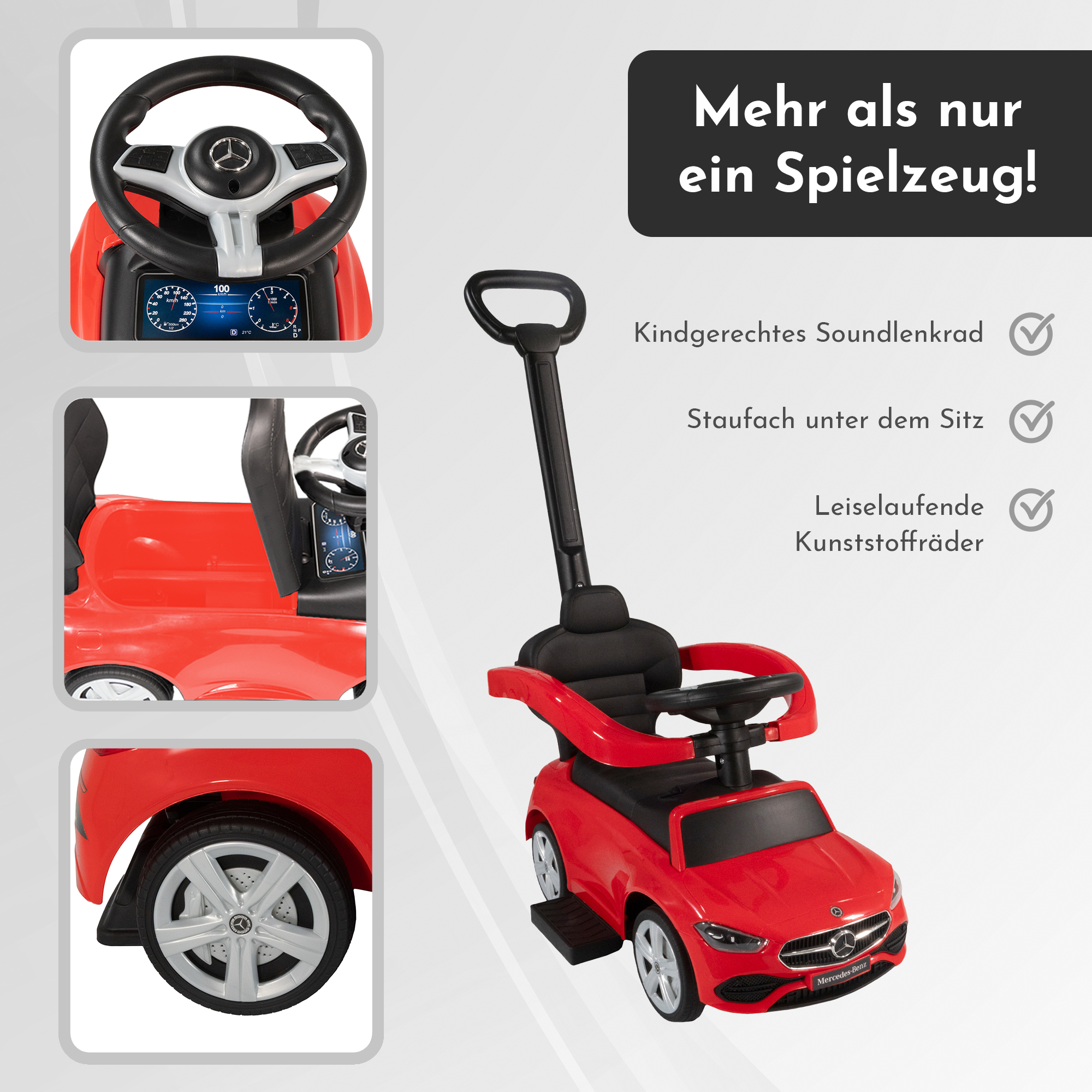 Rutscherauto Mercedes C Klasse rot mit Schiebestange, Kinderfahrzeug mit Sound Lenkrad