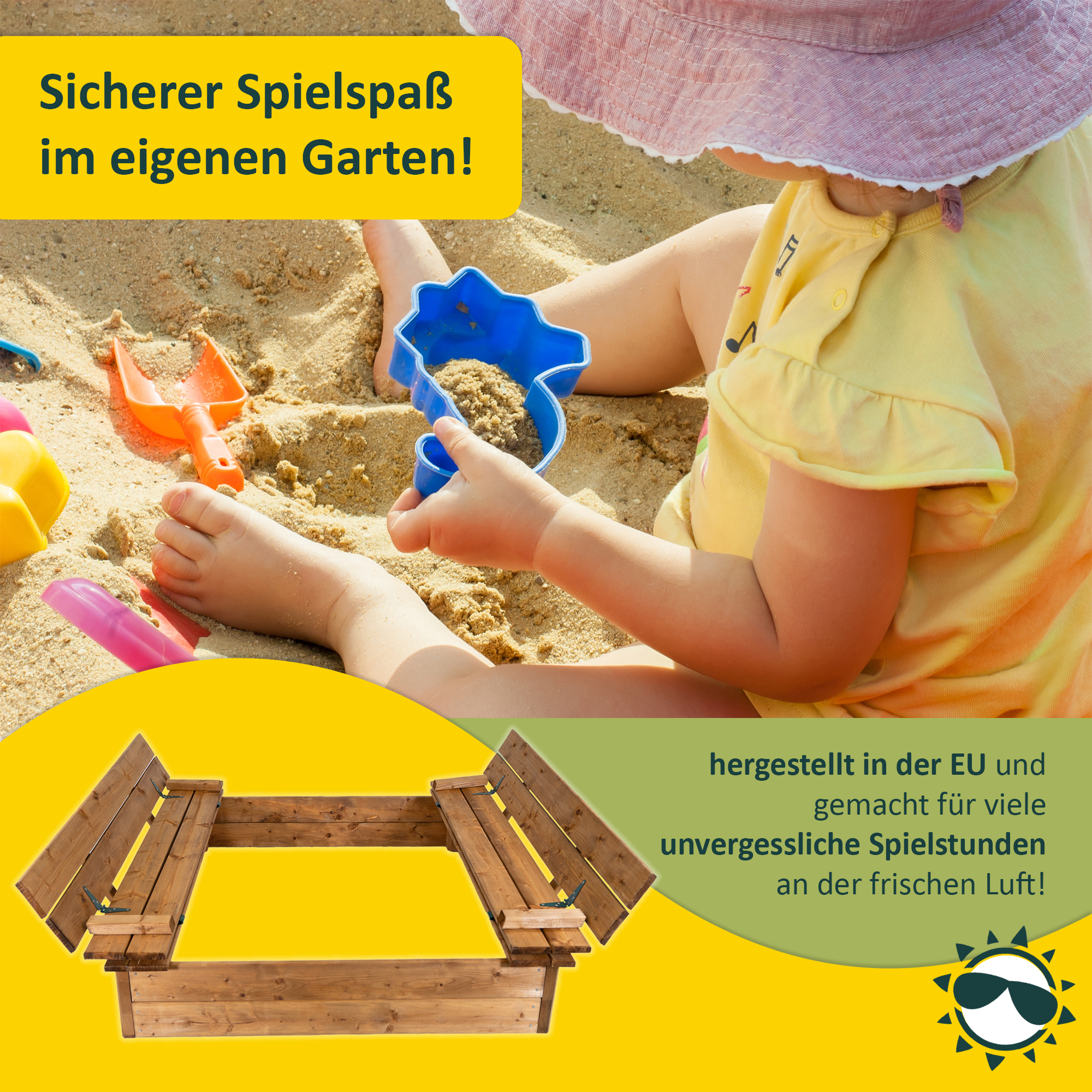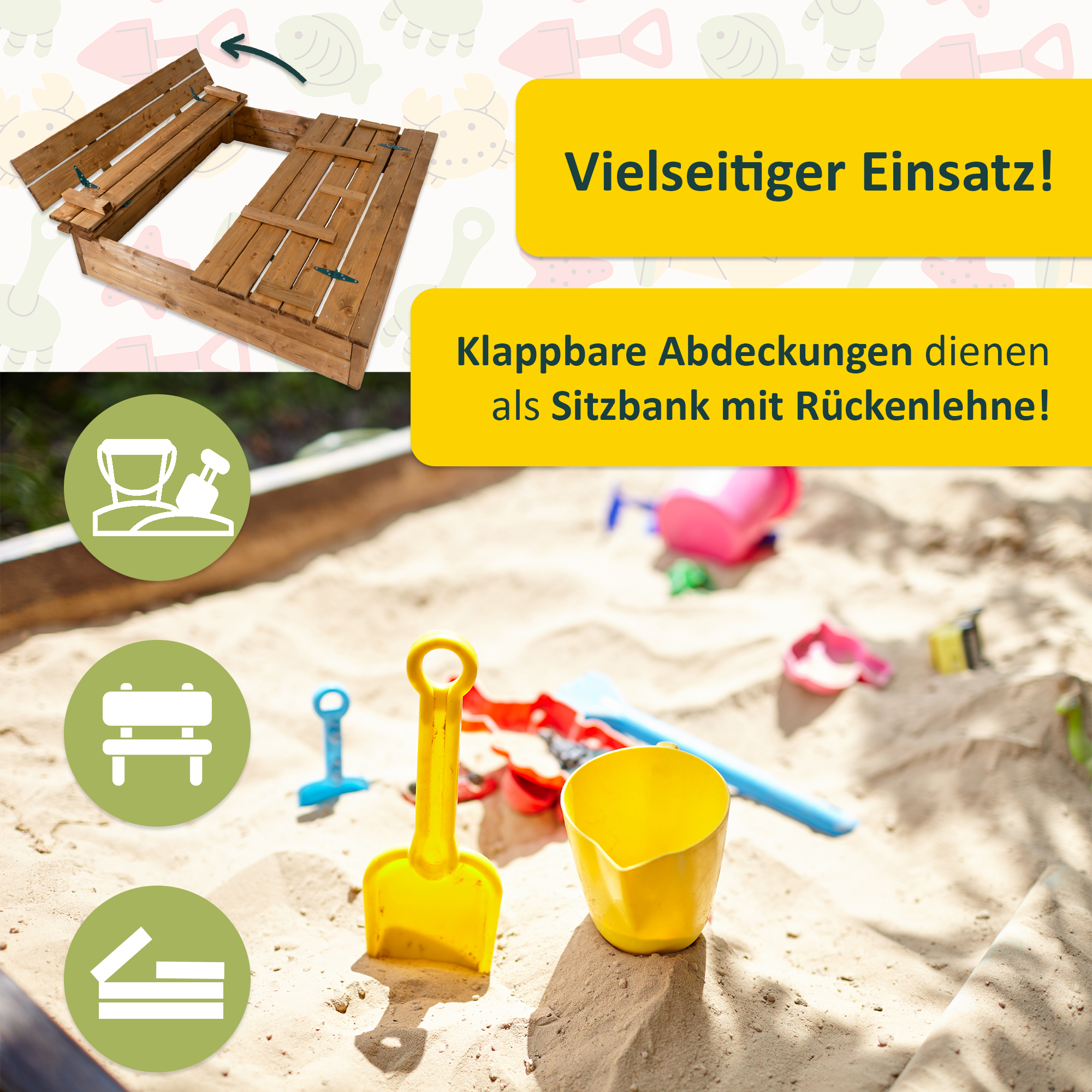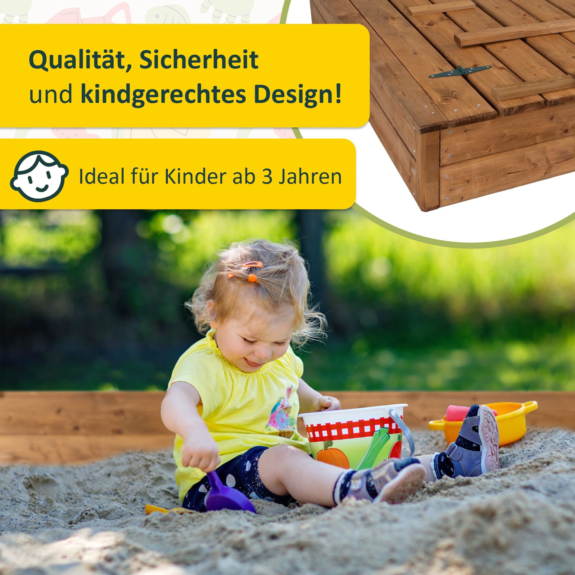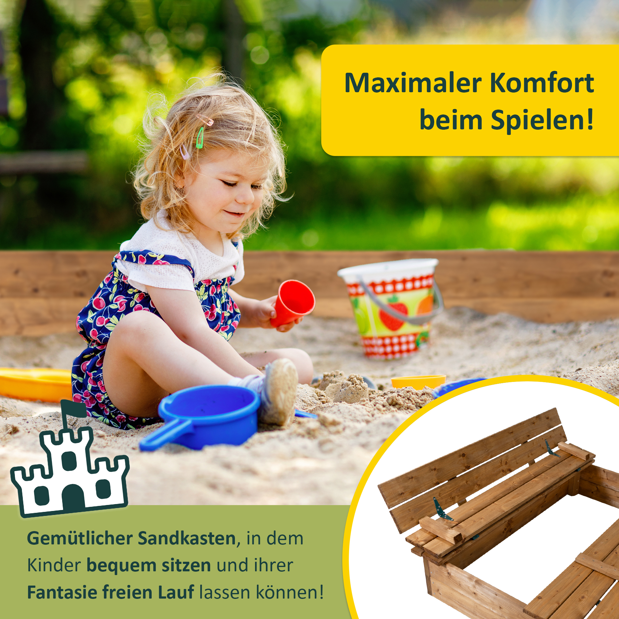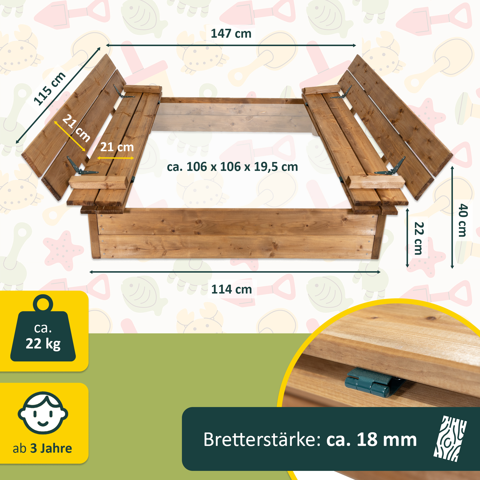 - Innenmaß Sandkasten: ca. 106 x 106 x 19,5 cm