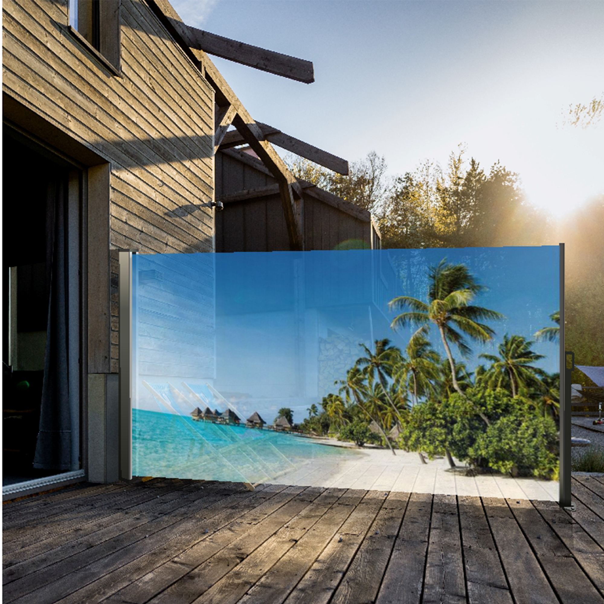 Seitenmarkise ausziehbar rechts, 160 cm hoch, Seitenrollo mit Fotodruck Südsee