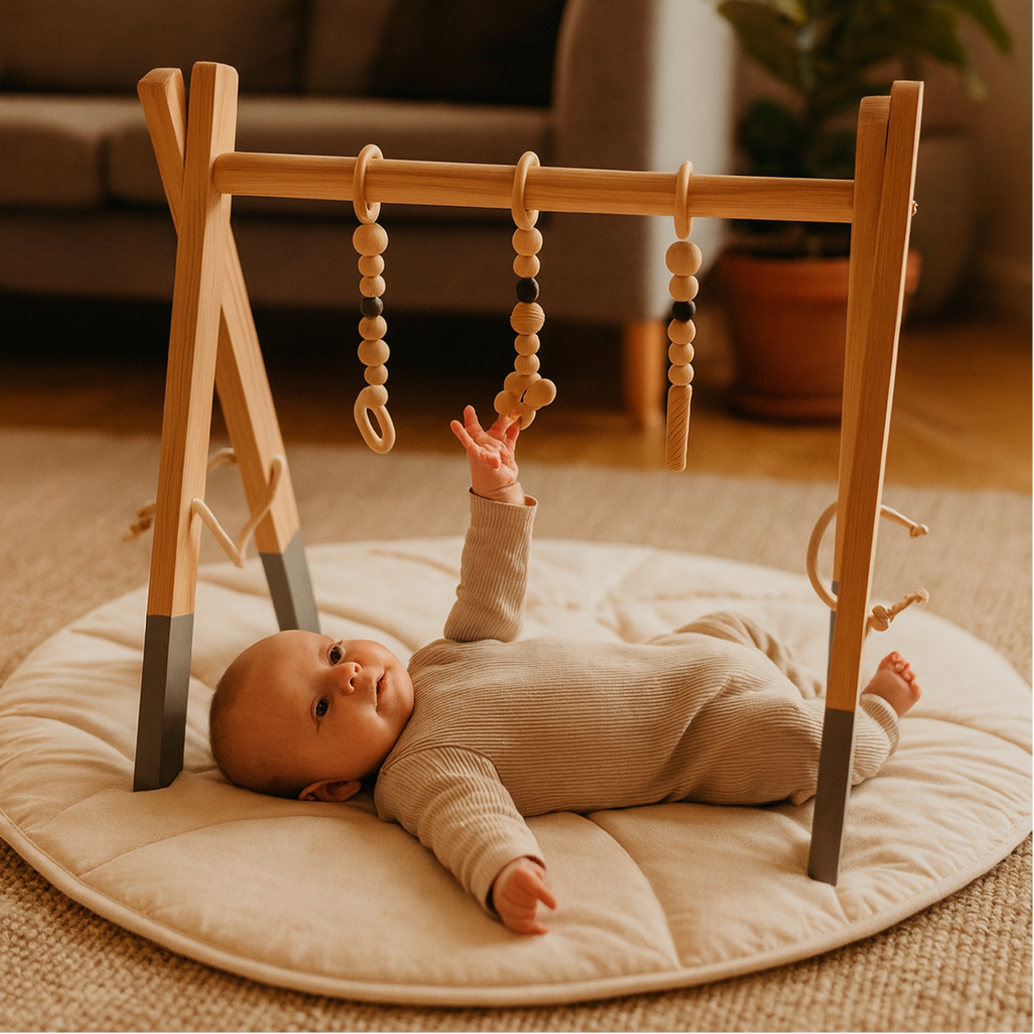 Das Spieltrapez eignet sich für Babys, die wach und aufmerksam auf dem Rücken liegen und erste Greifversuche zeigen. In dieser Phase beginnt dein Kind, seine Hände zu entdecken, nach Gegenständen zu greifen und Bewegungen bewusst zu wiederholen – genau hier setzt der Holz Spielbogen an und begleitet wichtige Entwicklungsschritte. Ob als Geschenk zur Geburt, zur Babyparty oder als Teil der Erstausstattung: Ein hochwertiger Spielbogen aus Holz ist ein klassisches Motorikspielzeug, das lange im Einsatz bleibt und sich später auch für Geschwisterkinder eignet. So investierst du in ein langlebiges Babyspielzeug, das mehrfach Freude bereitet.