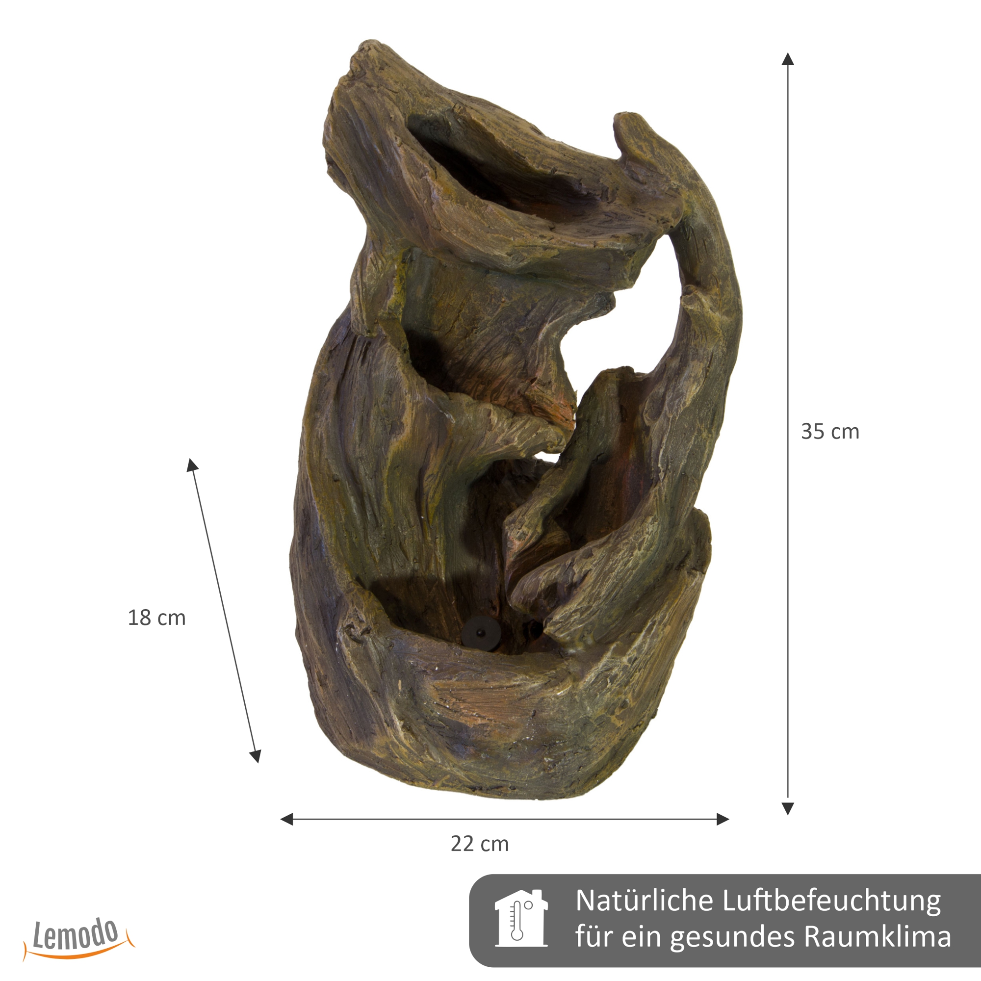 Der Zimmerbrunnen sieht aus wie ein Stück Treibholz oder wie ein Stück einer alten, knorrigen Wurzel. Die Ausarbeitung des Springbrunnens lässt den Betrachter im ersten Moment die Verwendung eines vollkommen natürlichen Materials vermuten.Die Ausarbeitung der verschiedenen Brunnenelemente ist sehr naturnah und sehr realistisch. Auch der Wasserlauf wurde möglichst natürlich gehalten. Der Tischbrunnen verfügt über eine LED Beleuchtung, die den gesamten Springbrunnen in ein sanftes Licht taucht. Durch das immer wieder hineinlaufende Wasser entsteht ein besonderer, lebendiger Lichteffekt. Im Zusammenspiel mit dem sanften Plätschern des Wassers entsteht eine angenehme, wohltuende Atmosphäre.