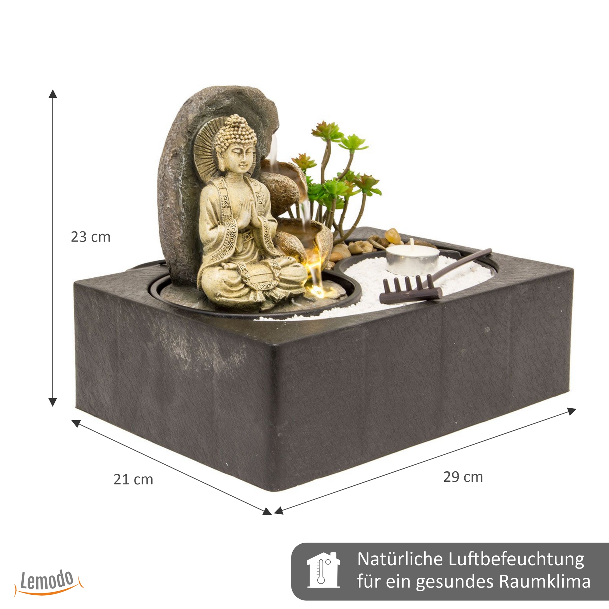 Produktinformationen "Zimmerbrunnen mit LED-Beleuchtung und Buddha, Feng Shui Dekobrunnen mit kleinem ZEN Garten"