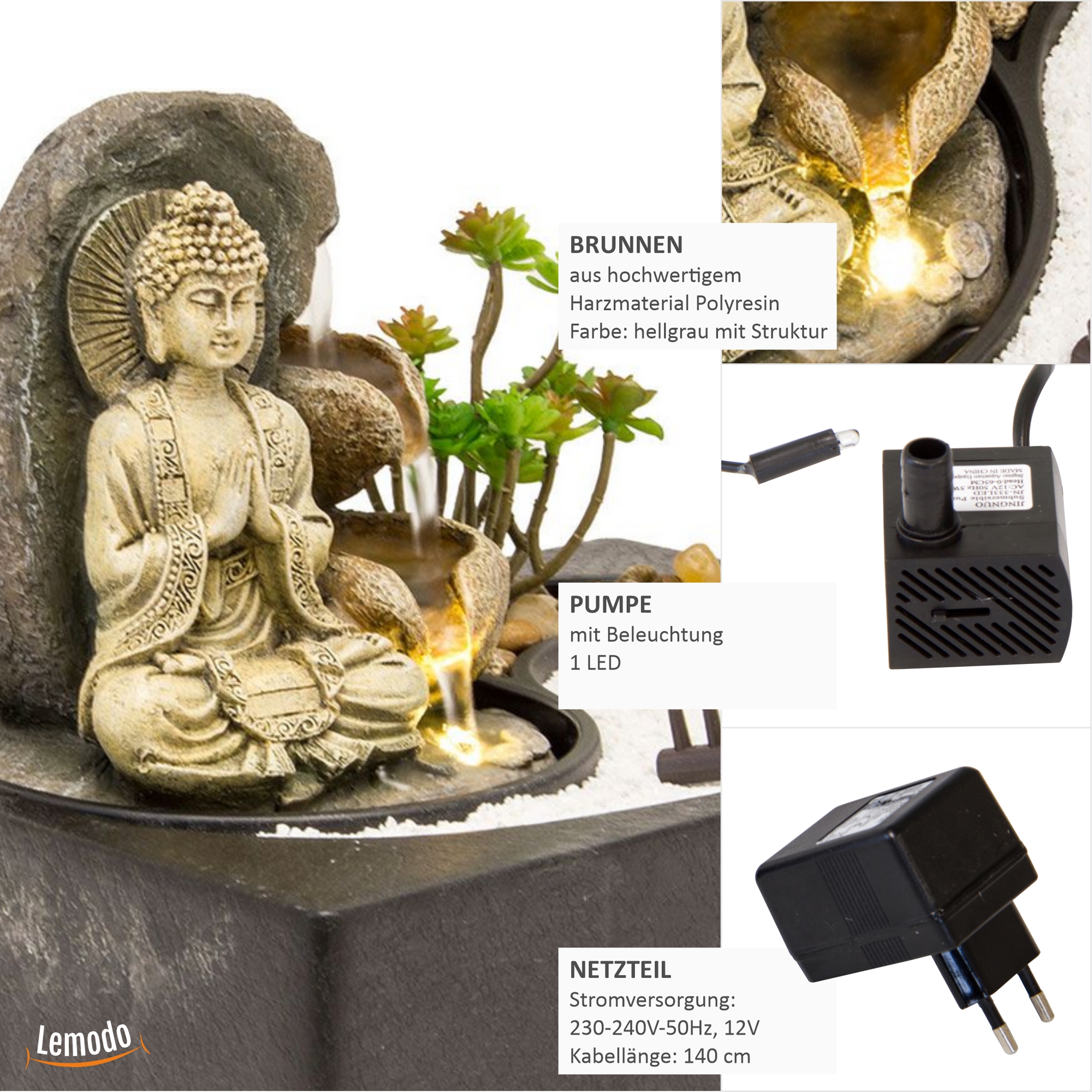 Die künstlerische Ausarbeitung des Brunnens ist sehr detailreich und handwerklich perfekt gearbeitet. Die integrierte LED-Beleuchtung und die wartungsarme Wasserpumpe runden das hochwertige Gesamtpaket ab.