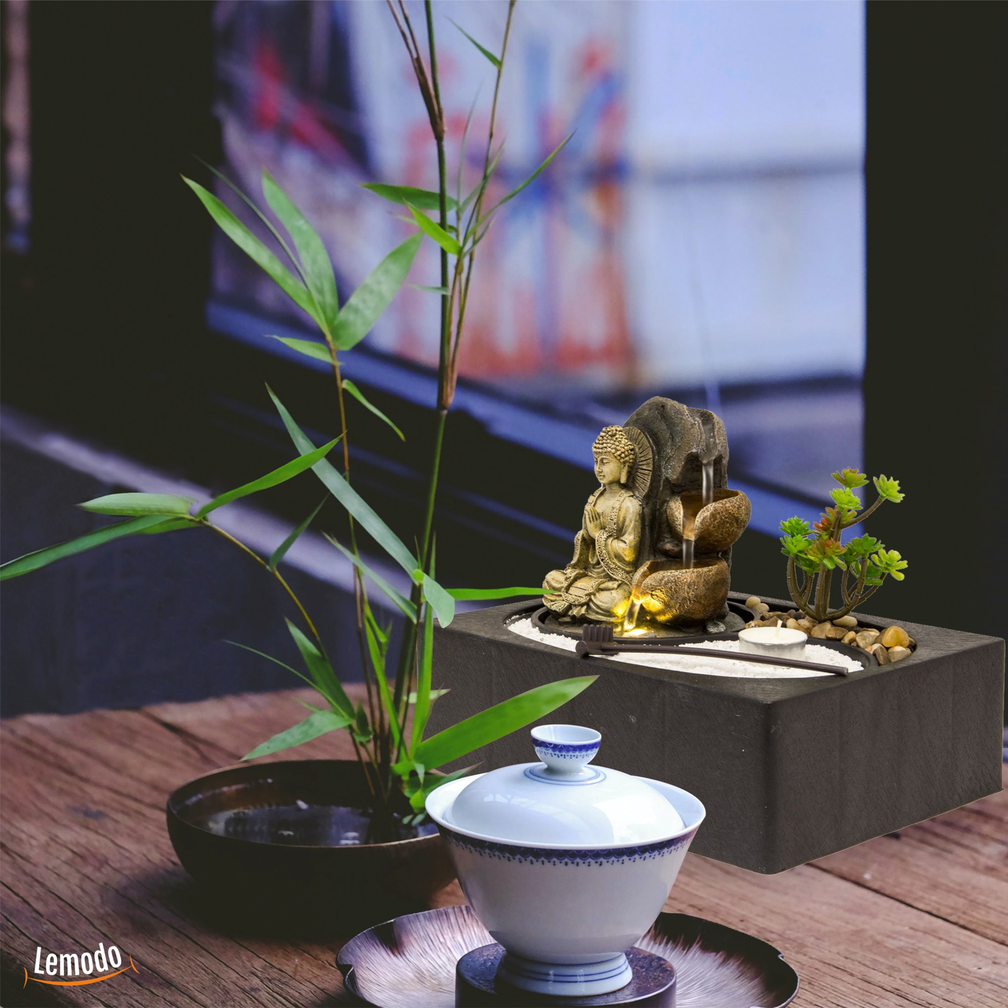 Zimmerbrunnen mit LED-Beleuchtung und Buddha, Feng Shui Dekobrunnen mit kleinem ZEN Garten