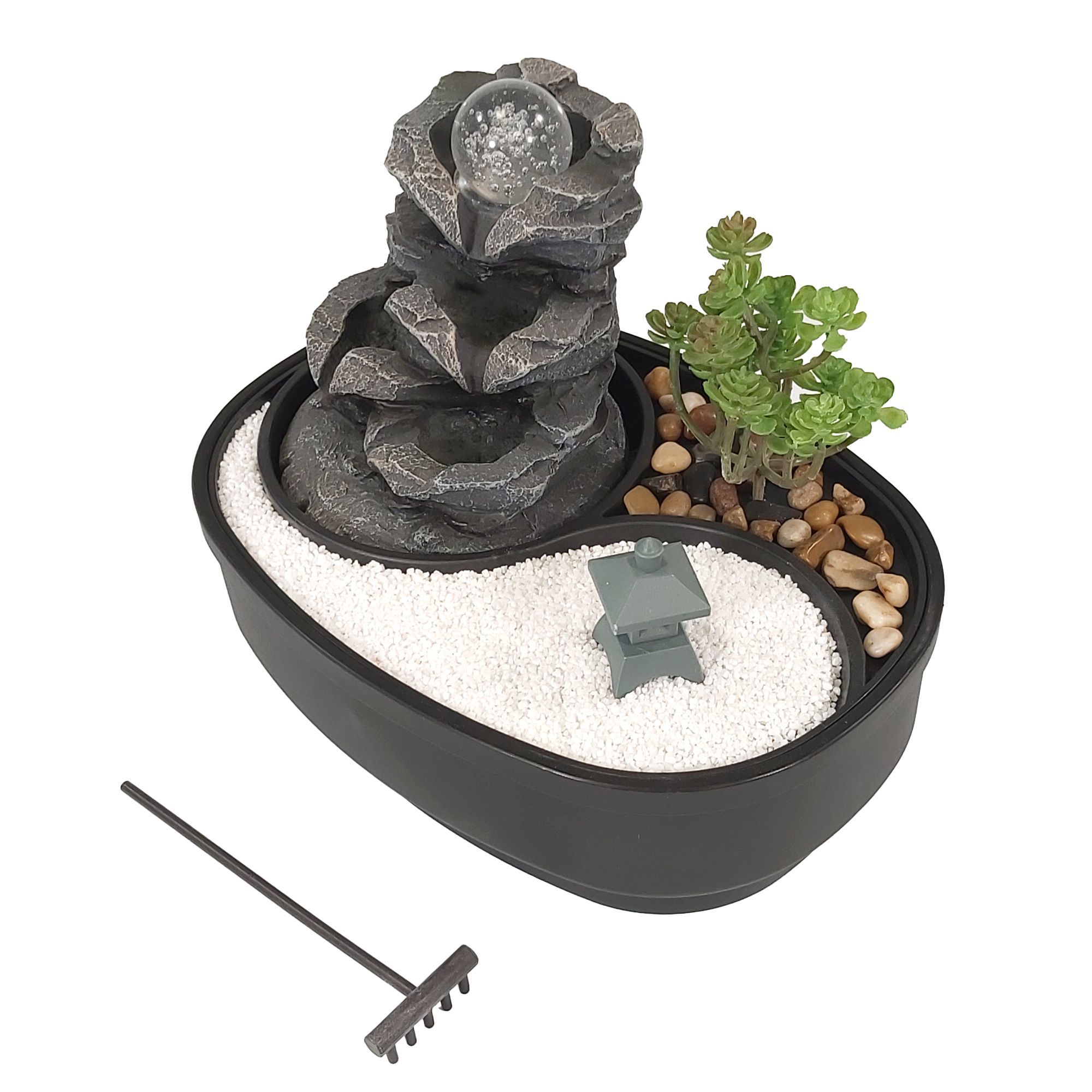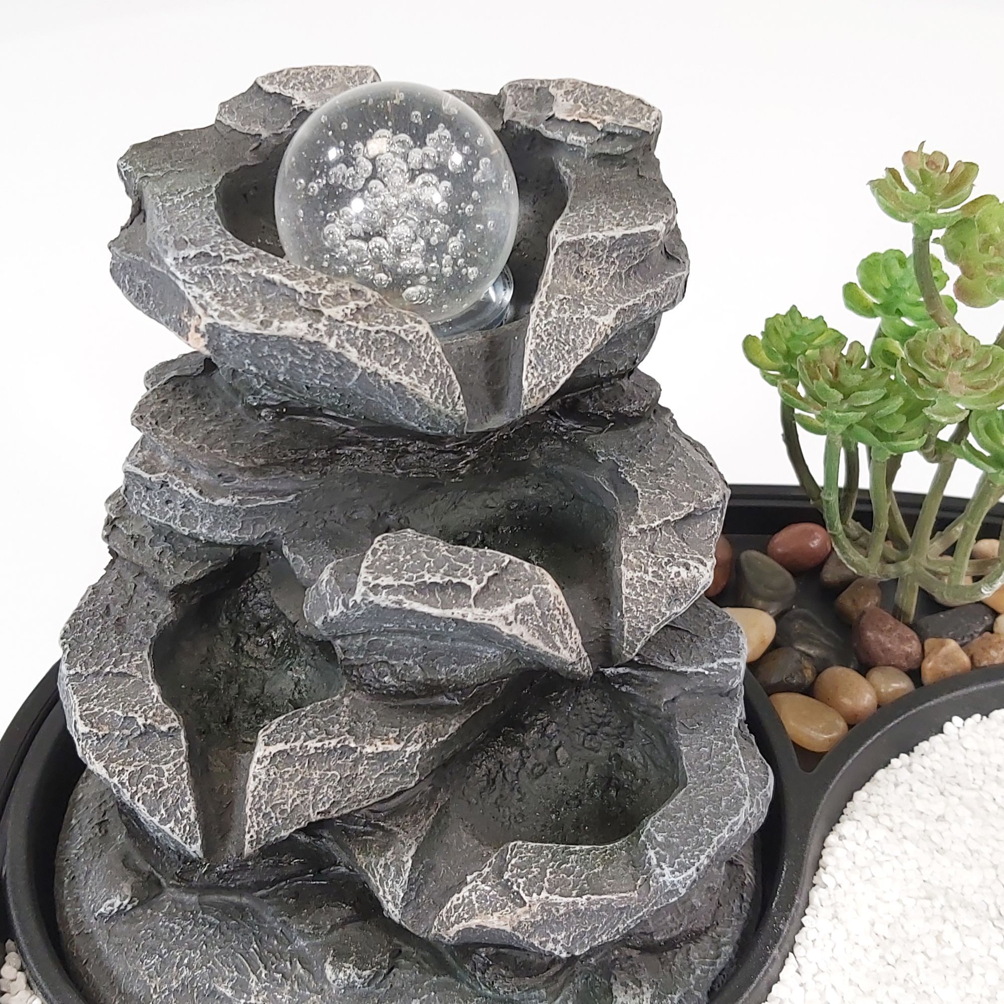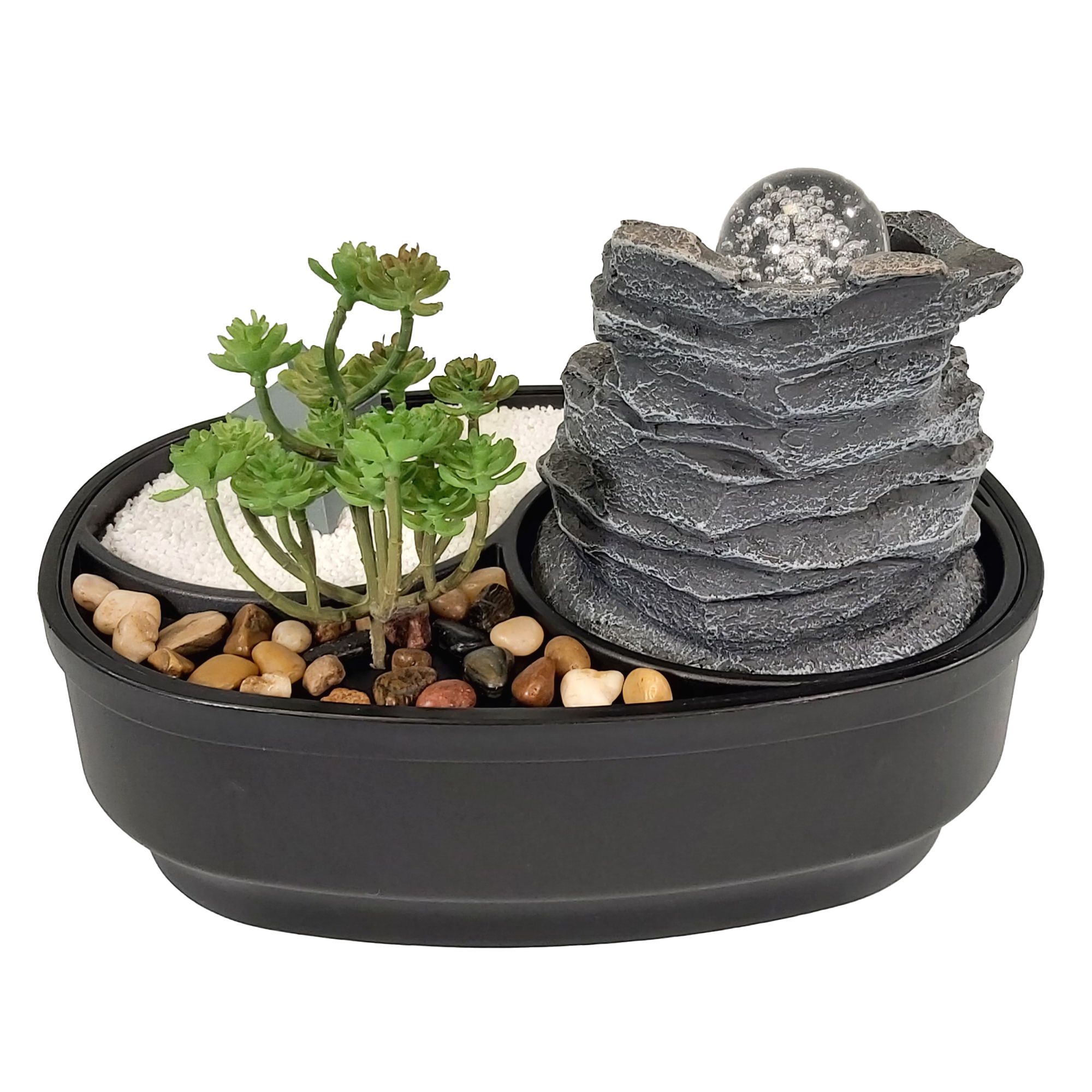 Unser Zimmerbrunnen mit kleinem ZEN Garten und beweglicher Glaskugel auf der Wasserquelle steht ganz im Zeichen Ostasiens.