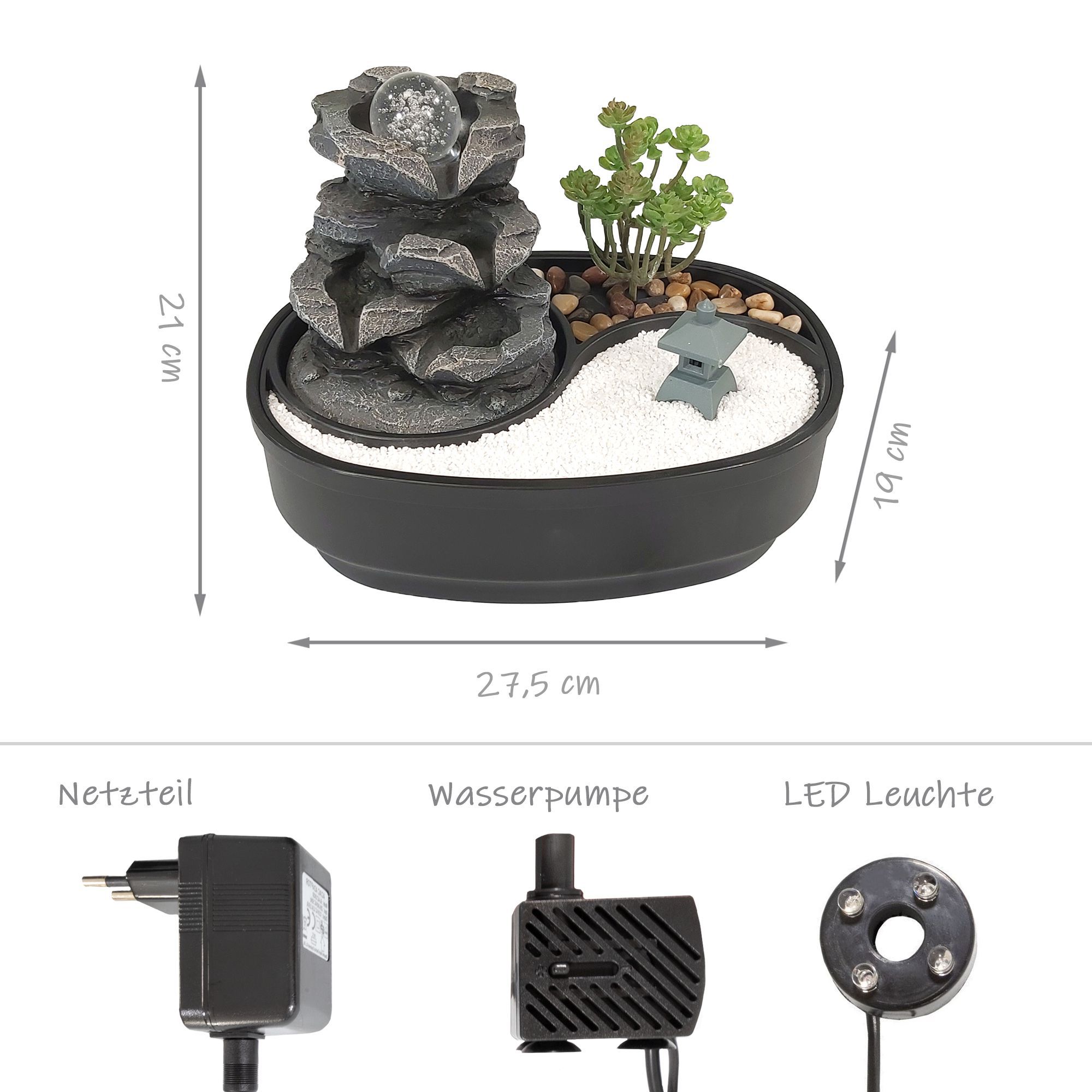 Unser Zimmerbrunnen mit kleinem ZEN Garten und beweglicher Glaskugel im Felsenbogen steht ganz im Zeichen Ostasiens.Mit unserem Zimmerbrunnen können Sie sich stressfrei in Ihrer eigenen Wohlfühloase entspannen, sei es zu Hause oder im Büro. Das beruhigende Wasserspiel fördert die Entspannung und schafft eine entspannende Atmosphäre.Darüber hinaus kann der kontinuierliche Wasserfluss dieses Springbrunnens auf natürliche Weise die Raumluftfeuchtigkeit und das Raumklima verbessern. Sie werden schnell die positive Veränderung bemerken.Das fließende Wasser dieses Tischbrunnens unterstützt auch die Prinzipien des Feng Shui und schafft eine entspannende Zen-Atmosphäre, die sich sowohl zu Hause als auch im Büro nutzen lässt. Dies ist ideal für Zen-Meditationen.Dieser Wasserbrunnen ist nicht nur ein Geschenk, sondern eine Quelle des Wohlbefindens und der Entspannung. Er erinnert den Beschenkten bei jedem Blick an Sie.Schließlich zeichnet sich dieser Zierbrunnen durch hochwertiges Polyresin und kunstvolles Handwerk aus. Die Pumpe und die LED-Beleuchtung sind langlebig, sodass Sie lange Freude an diesem Brunnen haben werden. STRESS ABBAUEN IN DER EIGENEN WOHLFÜHLOASE: Mit diesem Zimmerbrunnen schaffen Sie einen Ort der Ruhe, sei es in Ihrem Zuhause oder im Büro. Die beruhigende Wirkung des Wasserspiels unterstützt Sie dabei, sich zu entspannen NATÜRLICHE RAUMBEFEUCHTUNG UND VERBESSERUNG DES RAUMKLIMAS: Durch die kontinuierliche Wasserumwälzung unserer Springbrunnen wird die Raumluft auf natürliche Weise befeuchtet. Schon nach kurzer Zeit werden sie die Veränderung spüren ENTSPANNENDE ZEN UND FENG SHUI ATMOSPHÄRE: Das fließende Wasser unseres Tischbrunnens unterstützt das Feng Shui sowohl zu Hause als auch im Büro. Nutzen Sie das entspannende Wasserspiel für ihre Zen-Meditationen PERFEKTE GESCHENKIDEE: Mit diesem Wasserbrunnen schenken Sie nicht bloß ein gewöhnliches Geschenk, sondern vielmehr kostbare Augenblicke des Wohlbefindens und der Entspannung. Jeder Blick auf den Tischbrunnen wird den Beschenkten an Sie erinnern PREMIUM QUALITÄT: Das verwendete Polyresin zeichnet sich durch hohe Qualität und kunstvolles Handwerk aus. Die Pumpe und die LED-Beleuchtung sind auf lange Lebensdauer ausgelegt. Mit diesem Zierbrunnen werden Sie lange Zeit Freude haben Produktdetails: Material: Brunnen Polyresin, Wasserwanne Kunststoff Maße: 27,5 x 19,0 x 21,0 cm Beleuchtung: LED Kieselsteine, Splitt und Miniatur-Rechen zur Dekoration Inkl. Pumpe und Netzteil mit rotierender Glaskugel Stromversorgung: 220-240V/AC - 12V Kabellänge: ca. 140 cm Produktinformationen: Dekorative Zimmerbrunnen Steter Wasserfluss wirkt beruhigend und entspannend Sorgt für eine angenehme Atmosphäre Verbessertes Raumklima durch Luftbefeuchtung Integrierte LED-Beleuchtung Inklusive Pumpe und Netzteil STRESS ABBAUEN IN DER EIGENEN WOHLFÜHLOASEUnser Zimmerbrunnen bietet Ihnen die Möglichkeit, eine eigene Oase der Ruhe und Entspannung zu schaffen, egal ob Sie sich zu Hause oder im Büro befinden. Die beruhigende Wirkung dieses einzigartigen Wasserspiels ist dazu bestimmt, Ihnen in einem hektischen Alltag eine Quelle der Gelassenheit und des Stressabbaus zu bieten.In der heutigen Welt, in der Stress und Anspannung allgegenwärtig sind, wird es immer wichtiger, sich bewusst Momente der Entspannung zu gönnen. Dieser Zimmerbrunnen ist mehr als nur ein dekoratives Element; er ist ein Werkzeug, das Ihnen hilft, sich in Ihre eigene Wohlfühloase zurückzuziehen und die Belastungen des Alltags abzuschütteln.Die sanften, plätschernden Geräusche des Wassers, die von diesem Brunnen erzeugt werden, haben eine bemerkenswerte beruhigende Wirkung auf Körper und Geist. Sie können den Stress des Tages hinter sich lassen und in einen Zustand der inneren Ruhe eintauchen. Das Betrachten des Wasserspiels kann dazu beitragen, den Geist zu beruhigen und den Fokus auf das Hier und Jetzt zu lenken.Egal, ob Sie den Brunnen in Ihrem Wohnzimmer, Schlafzimmer oder Büro aufstellen, er wird zu einem wichtigen Teil Ihrer Entspannungsroutine, der Ihnen dabei hilft, Stress abzubauen und Ihre geistige Gesundheit zu fördern. Dieser Zimmerbrunnen ist nicht nur ein dekoratives Accessoire, sondern auch ein Instrument zur Förderung Ihres Wohlbefindens.Lassen Sie diesen Zimmerbrunnen zu Ihrer persönlichen Wohlfühloase werden und erleben Sie, wie er Ihnen hilft, die Herausforderungen des Alltags gelassener anzugehen. Machen Sie sich die beruhigende Kraft des Wassers zunutze und schaffen Sie sich einen Ort der Ruhe und Entspannung, der Ihnen jederzeit zur Verfügung steht. NATÜRLICHE RAUMBEFEUCHTUNG UND VERBESSERUNG DES RAUMKLIMASUnsere Springbrunnen sind nicht nur ästhetisch ansprechend, sondern können auch aktiv zur Verbesserung Ihres Raumklimas beitragen. Dies geschieht auf natürliche Weise durch die kontinuierliche Wasserumwälzung, die von unseren Zierbrunnen ermöglicht wird.Die Raumluftfeuchtigkeit spielt eine entscheidende Rolle für unser allgemeines Wohlbefinden. Insbesondere in den kalten Wintermonaten, wenn die Heizungsluft trocken ist, oder in klimatisierten Räumen, kann die Luftfeuchtigkeit stark abnehmen. Dies kann zu Problemen wie trockener Haut, Reizungen der Atemwege und allgemeinem Unbehagen führen.Unsere TIschbrunnen sind so konzipiert, dass sie das Wasser sanft und kontinuierlich in Bewegung halten. Das Plätschern des Wassers erzeugt nicht nur eine beruhigende Geräuschkulisse, sondern sorgt auch dafür, dass Wasserpartikel in die Luft freigesetzt werden. Diese feinen Wassertröpfchen erhöhen die Luftfeuchtigkeit im Raum auf natürliche Weise.Bereits nach kurzer Zeit werden Sie die Veränderungen in Ihrem Raum spüren. Ihre Haut wird sich weniger trocken anfühlen. Sie werden weniger von trockenen Augen oder gereizten Atemwegen geplagt, und die allgemeine Luftqualität wird verbessert. Ein angenehmes Raumklima trägt nicht nur zu Ihrem Komfort bei, sondern kann auch dazu beitragen, Ihre Gesundheit zu unterstü